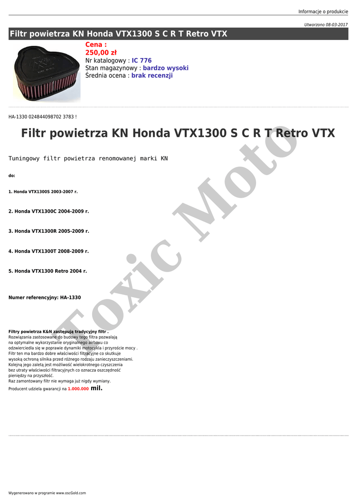 Informacje o produkcie Utworzono 08-03-2017 Filtr powietrza KN Honda VTX1300 S C R T Retro VTX Cena : 250,00 zł Nr katalogowy : IC 776 Stan magazynowy : bardzo wysoki Średnia ocena : brak recenzji HA-1330 024844098702 3783 ! Tuningowy filtr powietrza renomowanej marki KN do: M 1. Honda VTX1300S 2003-2007 r. 2. Honda VTX1300C 2004-2009 r. 3. Honda VTX1300R 2005-2009 r. c 4. Honda VTX1300T 2008-2009 r. xi 5. Honda VTX1300 Retro 2004 r. To Numer referencyjny: HA-1330 Filtry powietrza K&N zastępują tradycyjny filtr . Rozwiązania zastosowane do budowy tego filtra pozwalają na optymalne wykorzystanie oryginalnego airboxu co odzwierciedla się w poprawie dynamiki motocykla i przyroście mocy . Filtr ten ma bardzo dobre właściwości filtracyjne co skutkuje wysoką ochroną silnika przed różnego rodzaju zanieczyszczeniami. Kolejną jego zaletą jest możliwość wielokrotnego czyszczenia bez utraty właściwości filtracyjnych co oznacza oszczędność pieniędzy na przyszłość. Raz zamontowany filtr nie wymaga już nigdy wymiany. Producent udziela gwarancji na 1.000.000 Wygenerowano w programie www.oscGold.com ot o Filtr powietrza KN Honda VTX1300 S C R T Retro VTX mil.