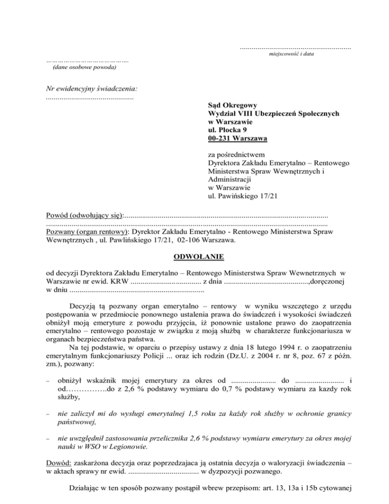 ......................................................... miejscowość i data ……………………………………. (dane osobowe powoda) Nr ewidencyjny świadczenia: ............................................. Sąd Okregowy Wydział VIII Ubezpieczeń Społecznych w Warszawie ul. Płocka 9 00-231 Warszawa za pośrednictwem Dyrektora Zakładu Emerytalno – Rentowego Ministerstwa Spraw Wewnętrznych i Administracji w Warszawie ul. Pawińskiego 17/21 Powód (odwołujący się):........................................................................................................ ................................................................................................................................................ Pozwany (organ rentowy): Dyrektor Zakładu Emerytalno - Rentowego Ministerstwa Spraw Wewnętrznych , ul. Pawlińskiego 17/21, 02-106 Warszawa. ODWOŁANIE od decyzji Dyrektora Zakładu Emerytalno – Rentowego Ministerstwa Spraw Wewnetrznych w Warszawie nr ewid. KRW .................................... z dnia ...........................................,doręczonej w dniu ..................................................................... Decyzją tą pozwany organ emerytalno – rentowy w wyniku wszczętego z urzędu postępowania w przedmiocie ponownego ustalenia prawa do świadczeń i wysokości świadczeń obniżył moją emeryture z powodu przyjęcia, iż ponownie ustalone prawo do zaopatrzenia emerytalno – rentowego pozostaje w związku z moją służbą w charakterze funkcjonariusza w organach bezpieczeństwa państwa. Na tej podstawie, w oparciu o przepisy ustawy z dnia 18 lutego 1994 r. o zaopatrzeniu emerytalnym funkcjonariuszy Policji ... oraz ich rodzin (Dz.U. z 2004 r. nr 8, poz. 67 z późn. zm.), pozwany: obniżył wskaźnik mojej emerytury za okres od ....................... do ......................... i od…………….do z 2,6 % podstawy wymiaru do 0,7 % podstawy wymiaru za kazdy rok służby, nie zaliczył mi do wysługi emerytalnej 1,5 roku za każdy rok służby w ochronie granicy państwowej, nie uwzględnił zastosowania przelicznika 2,6 % podstawy wymiaru emerytury za okres mojej nauki w WSO w Legionowie. Dowód: zaskarżona decyzja oraz poprzedzajaca ją ostatnia decyzja o waloryzacji świadczenia – w aktach sprawy nr ewid. .................................... w dyzpozycji pozwanego. Działając w ten sposób pozwany postąpił wbrew przepisom: art. 13, 13a i 15b cytowanej powyżej policyjnej ustawy emerytalnej z dnia 18 lutego 1994 roku, art. 10 ustawy z dnia 11 maja 2012 r. o zmianie ustawy o zaopatrzeniu emerytalnym żołnierzy zawodowych…… i ich rodzin (Dz.U.Nr 0, poz.664) oraz art. 3 ust. 3 ustawy z dnia 18 października 2006 r. o ujawnianiu informacji w dokumentach…..(Dz.U. z 2007 r. Nr 63, poz. 425 z późn. zm.). Ponadto jako podstawę wydania decyzji przyjął informację z IPN niezgodną ze stanem faktycznym. Zaskarżam powyższą decyzję i wnoszę o jej uchylenie w całości z powodu zastosowania wadliwej podstawy prawnej i wydanie w oparciu o informację niezgodną ze stanem faktycznym. Gdyby jednak Wysoki Sąd uznał, że uchylenie decyzji w całości nie jest prawnie możliwe, z ostrożności procesowej wnoszę o : 1. Zmianę zaskarżonej decyzji w części odnoszącej się do ponownego ustalenia wysokości świadczenia przez przyznanie mi emerytury policyjnej, z uwzględnieniem przelicznika 2,6 % podstawy wymiaru za każdy rok służby w Zwiadzie Wojsk Ochrony Pogranicza, przyjmując jako podstawę prawną art. 15b ust.1 pkt. 2 policyjnej ustawy emerytalnej. 2. Zastosowanie przelicznika 2,6 % podstawy wymiaru emerytury za lata nauki w WSO w Legionowie. 3. Zaliczenie mi do wysługi emerytalnej 1,5 roku za każdy rok służby, pełnionej bezpośrednio w ochronie granicy państwowej. 4. Zasądzenie zwrotu przez Zakład Emerytalno-Rentowy MSW całości bezprawnie zabranych mi do tej pory świadczeń emerytalnych, wraz z ustawowymi odsetkami. 5. Zasądzenie od pozwanego na moją rzecz kosztów postępowania według norm przepisanych. 6. Rozpoznanie sprawy także w mojej nieobecności. 7. Zażądanie i przeprowadzenie dowodu z moich akt emerytalno – rentowych posiadanych przez pozwanego oraz akt osobowych znajdujących sie w Instytucie Pamięci Narodowej Oddział w ....................................., jak również wystąpienie do Oddziału IPN o uzupełnienie informacji o przebiegu służby poprzez wyraźne stwierdzenie, w jakim charakterze pełniłem służbę – jako funkcjonariusz, czy jako żołnierz zawodowy. 8. Wystąpienie do IPN o wskazanie, jaka była podstawa prawna przekazania do ZER MSW informacji, że pełniłem służbę w organach bezpieczeństwa państwa – na czyj wniosek i kiedy on został zgłoszony. UZASADNIENIE 1. Zakład Emerytalno- Rentowy nie uwzględnił w swojej decyzji o obniżeniu mojej emerytury przepisów artykułu 13 ustawy z dnia 18 lutego 1994 r. o zaopatrzeniu emerytalnym funkcjonariuszy Policji…… oraz ich rodzin ( Dz.U. z 2004 nr 8, poz. 67 z późn. zm. ), który stanowi faktyczną przesłankę przyznania emerytury. Ust. 1 pkt. 1 b tego artykułu wymienia jako równorzędne „ okresy służby w charakterze funkcjonariusza w organach bezpieczeństwa państwa …..ˮ, a ust. 1 pkt. 2 określa służbę wojskową, uwzględnianą przy ustalaniu prawa do emerytury policyjnej. A ponieważ ja pełniłem służbę wojskową w charakterze żołnierza zawodowego, to zasady obliczania wysokości emerytury określone w art. 15 b ust. 1 pkt. 1 cytowanej wyżej ustawy nie powinny mnie dotyczyć. Przepis art. 15b ust. 1 pkt. 2 wyraźnie stanowi, że do okresów równorzędnej służby określonych w art. 13 ust. 1 pkt. 1, 1a i pkt. 2 – 4 zastosowanie ma przelicznik 2,6% za każdy rok wysługi emerytalnej. Przepis ten dotyczy ewidentnie mojej osoby i powinien stanowić podstawę prawną decyzji emerytalnej. Zarówno w moich aktach personalnych znajdujących się w IPN jak i w ZER MS