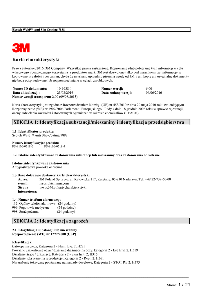 Scotch Weld™ Anti Slip Coating 7888 Karta charakterystyki Prawa autorskie, 2016, 3M Company Wszystkie prawa zastrzeżone. Kopiowanie i/lub pobieranie tych informacji w celu właściwego i bezpiecznego korzystania z produktów marki 3M jest dozwolone tylko pod warunkiem, że: informacje są kopiowane w całości i bez zmian, chyba że uzyskano uprzednio pisemną zgodę od 3M, i ani kopie ani oryginalne dokumenty nie będą odsprzedawane lub rozpowszechniane w celach zarobkowych. 10-9938-1 Numer ID dokumentu: 25/08/2016 Data aktualizacji: Numer wersji transportu: 2.00 (09/08/2015) Numer wersji: Data zmiany wersji: 6.00 06/06/2016 Karta charakterystyki jest zgodna z Rozporządzeniem Komisji (UE) nr 453/2010 z dnia 20 maja 2010 roku zmieniającym Rozporządzenie (WE) nr 1907/2006 Parlamentu Europejskiego i Rady z dnia 18 grudnia 2006 roku w sprawie rejestracji, oceny, udzielania zazwoleń i stosowanych ograniczeń w zakresie chemikaliów (REACH). SEKCJA 1: Identyfikacja substancji/mieszaniny i identyfikacja przedsiębiorstwa 1.1. Identyfikator produktu Scotch Weld™ Anti Slip Coating 7888 Numery identyfikacyjne produktu FS-9100-0718-6 FS-9100-0719-4 1.2. Istotne zidentyfikowane zastosowania substancji lub mieszaniny oraz zastosowania odradzane Istotne zidentyfikowane zastosowania Antypoślizgowa powłoka ochronna. 1.3 Dane dotyczące dostawcy karty charakterystyki 3M Poland Sp. z o.o. al. Katowicka 117, Kajetany, 05-830 Nadarzyn; Tel: +48 22-739-60-00 Adres: [email protected] e-mail: www.3M.pl/kartycharakterystyki Strona internetowa: 1.4. Numer telefonu alarmowego 112 Ogólny telefon alarmowy (24 godziny) 999 Pogotowie medyczne (24 godziny) 998 Straż pożarna (24 godziny) SEKCJA 2: Identyfikacja zagrożeń 2.1. Klasyfikacja substancji lub mieszaniny Rozporządzenie (WE) nr 1272/2008 (CLP) Klasyfikacja: Łatwopalna ciecz, Kategoria 2 - Flam. Liq. 2, H225 Poważne uszkodzenie oczu / działanie drażniące na oczy, kategoria 2 - Eye Irrit. 2, H319 Działanie żrące / drażniące, Kategoria 2 - Skin Irrit. 2, H315 Działanie toksyczne na reprodukcję, Kategoria 2 - Repr. 2, H361 Nararażenie toksyczne powtarzane na narządy docelowe, Kategoria 2 - STOT RE 2; H373 __________________________________________________________________________________________ Strona: 1 z 21 Scotch Weld™ Anti Slip Coating 7888 Pełne brzmienie zwrotów H w sekcji 16. 2.2. Elementy oznakowania Rozporządzenie (WE) nr 1272/2008 (CLP) Hasło ostrzegawcze: NIEBEZPIECZEŃSTWO Symbole:: GHS02 (Płomień)GHS07 (Wykrzyknik) GHS08 (Zagrożenie dla zdrowia) Piktogramy: Zawiera: Nazwa substancji Toluen Nr CAS 108-88-3 Stężenie % 10 - 15 Zwroty wskazujące rodzaj zagrożenia: H225 Wysoce łatwopalna ciecz i pary. H319 Działa drażniąco na oczy. H315 Działa drażniąco na skórę. H361d Podejrzewa się, że działa szkodliwie na dziecko w łonie matki. H373 Może powodować uszkodzenie narządów poprzez długotrwałe lub narażenie powtarzane: układ nerwowy | narządy zmysłów | Zwroty wskazujące środki ostrożności: Zapobieganie: P210A P260A P280E Reagowanie: P305 + P351 + P338 P308 + P313 P370 + P378G Przechowywać z dala od źródeł ciepła, gorących powierzchni, iskrzenia, otwartego ognia i innych źródeł zapłonu. Palenie wzbronione. Nie wdychać par. Stosować rękawice ochronne. W PRZYPADKU DOSTANIA SIĘ DO OCZU: Ostrożnie płukać wodą przez kilka minut. Wyjąć soczewki kontaktowe, jeżeli są i można je łatwo usunąć. Nadal płukać. W przypadku narażenia lub styczności: Zasięgnąć porady/zgłosić się pod opiekę lekarza. W przypadku pożaru: Użyć środka gaśniczego odpowiedniego dla cieczy palnych, takich jak suche chemikalia lub dwutlenek węgla do gaszenia. Informacje uzupełniające: Informacje uzupełniające o zagrożeniach: EUH208 Zawiera Produkt reakcji bisfenolu A z epichlorohydryną. Może powodować wystąpienie reakcji alergicznej. 9% w mieszaninie znajdują się składniki o nieznanej toksyczności ostrej doustnej. 11% mieszaniny zawiera składniki o nieznanej toksyczności ostrej inhalacyjnej. __________________________________________________________________________________________ Strona: 2 z 21 Scotch Weld™ Anti Slip Coating 7888 Wskazówki dotyczące oznakowania: Zwrot H304 nie jest wymagany na etykiecie ze względu na lepkość produktu. 2.3. Inne zagrożenia Nieznane SEKCJA 3: Skład/informacja o składnikach Nazwa substancji Tlenek glinu Nr CAS 1344-28-1 Nr WE 215-691-6 Stężenie % 35 - 45 4-metylopentan-2-on (Numer rejestracji REACH:01-2119473980-30,012119965182-37) 108-10-1 203-550-1 15 - 25 Toluen 108-88-3 203-625-9 10 - 15 Glinokrzemian sodowo-potasowy 37244-96-5 Brak 5 - 10 Polimer chlorku winylu i octanu winylu 9003-22-9 Brak 5 - 10 Kopolimer akrylonitrylu/1,3butadienu/diwinylobenzenu Kopolimer octanu winylu / chlorek winylu / kwas dikarboksylowy Ditlenek tytanu 9052-77-1 Brak 3- 7 Tajemnica handlowa 13463-67-7 Brak 0- 3 236-675-5 0- 3 Pyły sadzy technicznej (Numer rejestracji REACH:01-2119384822-32) 1333-86-4 215-609-9 0- 3 Produkt reakcji bisfenolu A z epichlorohydryną 25068-38-6 NLP 500-033- 0,1 - 1 5 Klasyfikacja Substancja niesklasyfikowana jako niebezpieczna Flam. Liq. 2, H225; Acute Tox. 4, H332; Eye Irrit. 2, H319; STOT SE 3, H335; EUH066 (CLP) Flam. Liq. 2, H225; Asp. Tox. 1, H304; Skin Irrit. 2, H315; Repr. 2, H361d; STOT SE 3, H336; STOT RE 2, H373 (CLP) Aquatic Chronic 3, H412 (Dostawca) Eye Irrit. 2, H319 (Klasyfikacja 3M) Substancja niesklasyfikowana jako niebezpieczna Substancja niesklasyfikowana jako niebezpieczna Substancja niesklasyfikowana jako niebezpieczna Substancja niesklasyfikowana jako niebezpieczna Substancja z określoną na poziomie Wspólnoty wartością najwyższego dopuszczalnego stężenia w środowisku pracy Substancja z określoną na poziomie Wspólnoty wartością najwyższego dopuszczalnego stężenia w środowisku pracy Skin Irrit. 2, H315; Eye Irrit. 2, H319; Skin Sens. 1, H317; Aquatic Chronic 2, H411 (CLP) W sekcji 