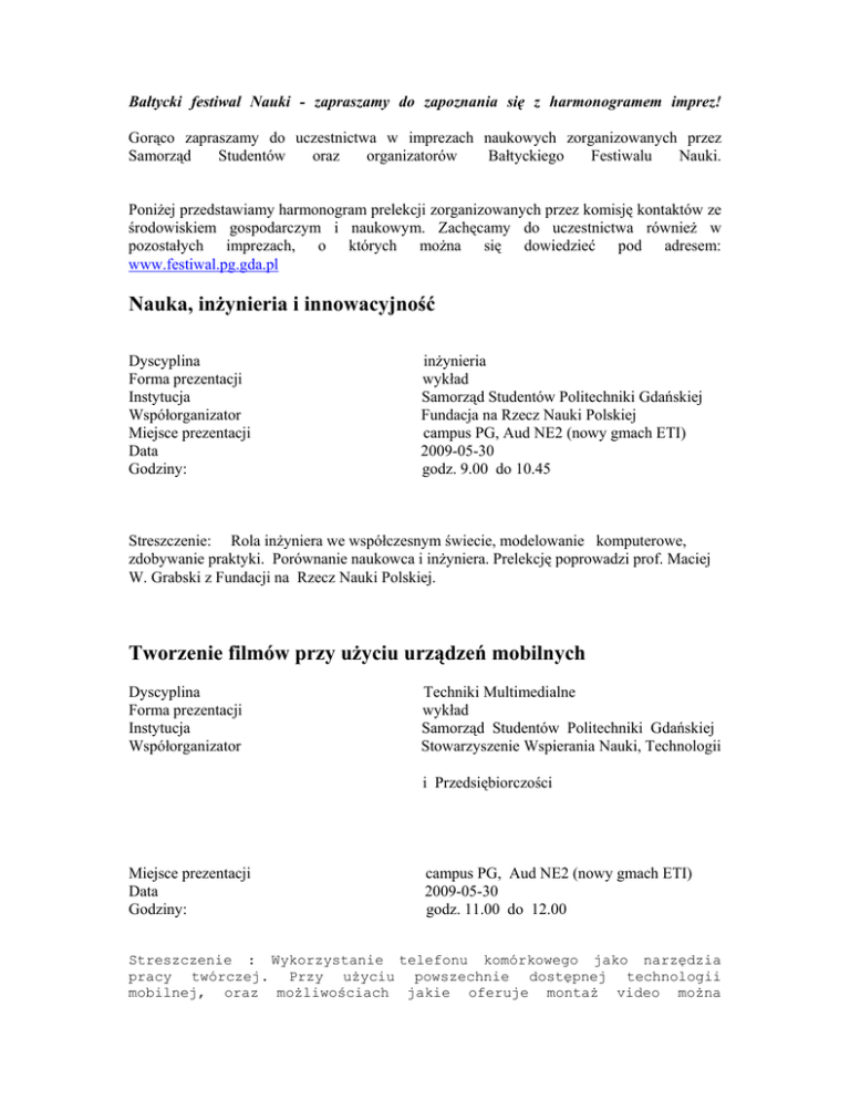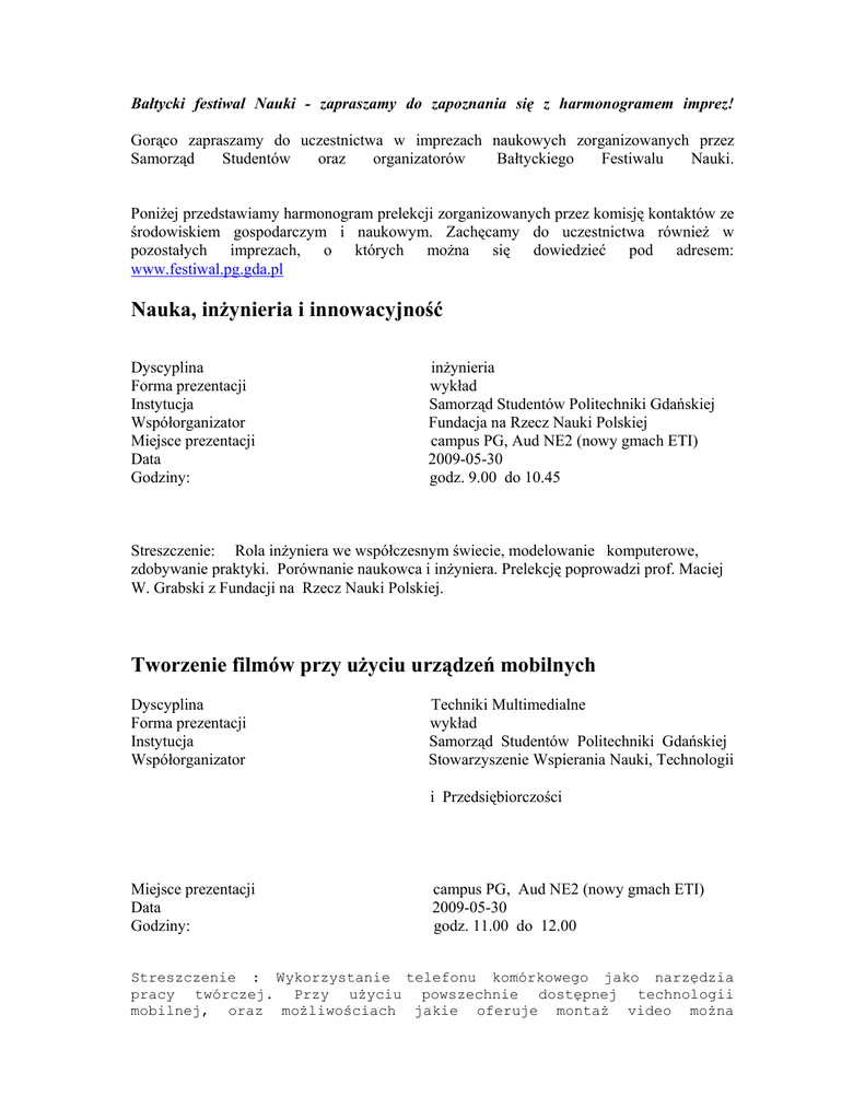 Bałtycki festiwal Nauki - zapraszamy do zapoznania się z harmonogramem imprez! Gorąco zapraszamy do uczestnictwa w imprezach naukowych zorganizowanych przez Samorząd Studentów oraz organizatorów Bałtyckiego Festiwalu Nauki. Poniżej przedstawiamy harmonogram prelekcji zorganizowanych przez komisję kontaktów ze środowiskiem gospodarczym i naukowym. Zachęcamy do uczestnictwa również w pozostałych imprezach, o których można się dowiedzieć pod adresem: www.festiwal.pg.gda.pl Nauka, inżynieria i innowacyjność Dyscyplina Forma prezentacji Instytucja Współorganizator Miejsce prezentacji Data Godziny: inżynieria wykład Samorząd Studentów Politechniki Gdańskiej Fundacja na Rzecz Nauki Polskiej campus PG, Aud NE2 (nowy gmach ETI) 2009-05-30 godz. 9.00 do 10.45 Streszczenie: Rola inżyniera we współczesnym świecie, modelowanie komputerowe, zdobywanie praktyki. Porównanie naukowca i inżyniera. Prelekcję poprowadzi prof. Maciej W. Grabski z Fundacji na Rzecz Nauki Polskiej. Tworzenie filmów przy użyciu urządzeń mobilnych Dyscyplina Forma prezentacji Instytucja Współorganizator Techniki Multimedialne wykład Samorząd Studentów Politechniki Gdańskiej Stowarzyszenie Wspierania Nauki, Technologii i Przedsiębiorczości Miejsce prezentacji Data Godziny: campus PG, Aud NE2 (nowy gmach ETI) 2009-05-30 godz. 11.00 do 12.00 Streszczenie : Wykorzystanie telefonu komórkowego jako narzędzia pracy twórczej. Przy użyciu powszechnie dostępnej technologii mobilnej, oraz możliwościach jakie oferuje montaż video można dzisiaj "produkować" filmy. Zaprezentujemy Państwu jak w prosty i szybki sposób możemy stworzyć ciekawy materiał filmowy. Prelekcję poprowadzi Kasper Kędzierski ze Stowarzyszenia Wspierania Nauki, Technologii i Przedsiębiorczości Kryminalistyka cyfrowa i bezpieczeństwo sieci komputerowych Dyscyplina Forma prezentacji Instytucja Współorganizator Informatyka wykład Samorząd Studentów Politechniki Gdańskiej Stowarzyszenie Wspierania Nauki, Technologii i Przedsiębiorczości Miejsce prezentacji Data Godziny: campus PG, Aud NE2 (nowy gmach ETI) 2009-05-30 godz. 12.15 do 14.00 Streszczenie : Włamania do systemów komputerowych staja się coraz częstszym problemem dotykającym zarówno użytkowników indywidualnych jak i wielkie korporacje. Utrata i ujawnienie danych może powodować jeszcze większe szkody. Ustalenie i ściganie winnych coraz częściej staje się priorytetem – stąd też rosnąca rola specjalistów od systemów zabezpieczeń i kryminalistyki cyfrowej. W trakcie prezentacji przedstawione zostaną przykłady ataków opartych o techniki spoofingu [podszywania się] oraz metody Man-in-theMiddle, na które mogą być narażeni potencjalni użytkownicy Internetu. Podane zostaną też propozycje działań zapobiegawczych, które utrudnią skompromitowanie systemu komputerowego. Na zakończenie uczestnikom zostaną przybliżone zagadnienia kryminalistyki cyfrowej na przykładzie ustalenia rzeczywistego nadawcy fałszywej korespondencji. Prelekcję poprowadzi Karol Szczepanowski ze Stowarzyszenia Wspierania Nauki, Technologii i Przedsiębiorczości „Czym obserwować niebo?” Dyscyplina Forma prezentacji Instytucja Współorganizator astronomia wykład Samorząd Studentów Politechniki Gdańskiej PAN, Centrum Astronomiczne im. M. Kopernika w Warszawie Miejsce prezentacji Data Godziny: campus PG, Aud NE2 (nowy gmach ETI) 2009-05-28 godz. 12.00 do 12.50 Strzeszczenie: Sprzęt optyczny używany do obserwacji astronomicznych jest bardzo różny: poczynając od "gołego oka", poprzez lornetki, na większych teleskopach kończąc. Podczas wykładu dowiemy się czym można obserwować niebo. Dowiemy się również o najciekawszych obiektach, które możemy dostrzec używając różnych typów instrumentów. Omówione zostaną też sposoby konstruowania instrumentów optycznych oraz wady optyczne, z jakimi muszą borykać się konstruktorzy i użytkownicy. Wykład ten z pewnością będzie nie lada gratką dla tych wszystkich, którzy kiedyś marzyli lub wciąż marzą o tym, by samemu obserwować niebo.Prelekcję poprowadzi dr Arkadiusz Olech z Centrum Astronomicznego im. M. Kopernika w Warszawie „Jak złapać spadającą gwiazdę?” Dyscyplina Forma prezentacji Instytucja Współorganizator astronomia wykład Samorząd Studentów Politechniki Gdańskiej PAN, Centrum Astronomiczne im. M. Kopernika w Warszawie Miejsce prezentacji Data Godziny: campus PG, Aud NE2 (nowy gmach ETI) 2009-05-28 godz. 13.00 do 13.50 Strzeszczenie: Gdy widzimy "spadającą gwiazdę" wypowiadamy życzenie. Ten błysk na niebie wywołała drobina wielkości ziarnka piasku, która mogła rozpocząć swoją samodzielną podróż przez Układ Słoneczny setki lat temu. Jak powstają meteory, zwane „spadającymi gwiazdami”, dowiedzie się właśnie na tym wykładzie. Prelekcję poprowadzi mgr Kamil Złoczewski z Centrum Astronomicznego im. M. Kopernika w Warszawie „Planety pozasłoneczne” Dyscyplina Forma prezentacji Instytucja Współorganizator Miejsce prezentacji Data Godziny: Liczebność grup Ograniczenia wieku Dostęp dla osób niepełnosprawnych Inne uwagi astronomia wykład Samorząd Studentów Politechniki Gdańskiej PAN, Centrum Astronomiczne im. M. Kopernika w Warszawie campus PG, Aud NE2 (nowy gmach ETI) 2009-05-28 godz. 14.00 do 14.50 max. 161 b.o. tak Strzeszczenie Dowiemy się m.in. jak astronomowie poszukują układów pozasłonecznych oraz co na podstawie ich badań możemy powiedzieć o warunkach panujących na innych planetach. Poszukiwania planet pozasłonecznych to również poszukiwania „drugiej Ziemi”. Na koniec dowiemy się jak zobaczyć pozasłoneczną planetę z własnego podwórka. Prelekcję poprowadzi mgr Kamil Złoczewski z Centrum Astronomicznego im. M. Kopernika w Warszawie „Kosmiczna linijka” Dyscyplina Forma prezentacji Instytucja Współorganizator Miejsce prezentacji Data Godziny: astronomia wykład Samorząd S