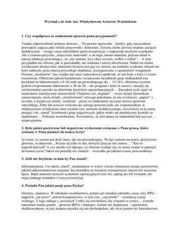 Wywiad z dr hab. inż. Władysławem Arturem Woźniakiem 1. Czy współpraca ze studentami sprawia panu przyjemność? Trudno odpowiedzieć jednym słowem… Na pewno sprawiała – kiedyś, gdy zaczynałem prowadzić zajęcia jako młody pracownik i doktorant. Zresztą chyba zawsze miałem zacięcie dydaktyczne – swego czasu udzielałem sporo korepetycji, z naprawdę niezłymi wynikami. Ale z czasem przyszło „zmęczenie materiału” a do tego, moim zdaniem, pewien trend w naszej edukacji powodujący, że „nie matura, lecz chęć szczera, zrobić z ciebie”… w tym przypadku nie oficera, jak w porzekadle, ale studenta i nawet absolwenta. Nabór na studia zwiększono drastycznie, obniżono kryteria przyjęć (w istocie, na niektóre wydziały niemal nie było żadnych, poza chęcią przyszłego studenta), zrezygnowano z egzaminów wstępnych. Poziom „studentów” (no, trudno nie użyć cudzysłowu) spadł tak, że nie było z kim i o czym rozmawiać. Obniżono jakość kształcenia: zwiększono liczebność grup studenckich (na przykład na laboratoriach z 8-10 osób na prowadzącego do… 15-18!), obniżono wymiar godzin (wspomniane laboratoria: z 3h do 2h – ale program i treść ta sama!), zaczęły się (nieformalne) naciski na obniżenie kryteriów egzaminacyjnych… Zacząłem tych zajęć ze studentami autentycznie nienawidzić! Ostatnio coś „drgnęło” – może dzięki kierunkom zamawianym, może dzięki „otrzeźwieniu” nowego pokolenia, że nie wystarczy „papier” z uczelni, a trzeba coś umieć, wiedzieć – praca ze studentami zaczyna znowu sprawiać satysfakcję. Żeby tak jeszcze wrócono do starego pensum (ach, nie wspomniałem, w międzyczasie zwiększono nam wymiar tzw. pensum dydaktycznego, oczywiście za tę samą pensję) i do „starej” liczebności grup zajęciowych, gdzie miało się autentyczny kontakt ze studentami… Pobożne westchnienia. Powiedzmy, że dziś praca ze studentami nie jest już… nieprzyjemna. 2. Było jakieś pozytywne lub negatywne wydarzenie związane z Pana pracą, które zostanie w Pana pamięci do końca życia? Ja wiem, że jestem już dość stary, ale nie przesadzajmy. Wciąż czekam na nowe, pozytywne głownie, wydarzenia. „Ważne są tylko te dni, których jeszcze nie znamy…” Kto to napisał/śpiewał? A czy zaszło coś takiego, co chociaż wydaje się, że może zostać w pamięci do końca życia? Jakoś nie potrafię nic znaleźć – wszystko po jakimś czasie powszednieje. 3. Jeśli nie fizykiem, to kim by Pan został? Informatykiem. I to takim „hard”, zamkniętym w wieży z kości słoniowej swojej serwerowni, jakimś administratorem systemu, bez kontaktu ze światem zewnętrznym innym niż sieciowe łącze. Bądź autorem nowych systemów operacyjnych (oni też, sądząc po ich tworach, nie mają żadnego kontaktu z rzeczywistością). 4. Posiada Pan jakieś pasje poza fizyką? Niestety, mnóstwo. W młodości modelarstwo, potem już (studia) zabrakło czasu. Gry RPG – najpierw „na żywo”, potem komputerowe, w tym tzw. „sieciówki” – mordercy czasu wolnego. Z tego nałogu („sieciówek”) niby się uwolniłem, ale czasami to wraca… Została natomiast mania grania – głownie RPGi i strategie. Jestem też żeglarzem – wprawdzie słodkowodnym, wyżej stopnia sternika się nie dochrapałem, ale za to jestem tez Instruktorem PZŻ i co roku spędzam wiele czasu na obozach szkoleniowych, ucząc młodzież żeglarstwa i starając się ich zarazić tą pasją. Niestety, patrz punkt 1, jest coraz gorzej: roszczeniowa postawa młodzieży, coraz bardziej niechętnej jakiejkolwiek pracy, bezmyślność rodziców, wysyłających swoje pociechy na obóz żeglarski, aby spełnić jakieś swoje ambicje – to powoduje, że takie obozy są coraz mniej pasją, coraz więcej zwykłą pracą, i to dającą coraz mniej satysfakcji. Kolejna pasja: piłka nożna. Nigdy nie umiałem dobrze kopnąć piłki, więc zostałem… sędzią piłkarskim. Podobno niezłym. Ale byłem „za krótki” żeby doskoczyć prawdziwych konfitur więc moja kariera skończyła się na III lidze jako sędzia główny i na II lidze jako asystent. Skończyłem kilka lat temu, trochę ze względu na stan zdrowia (liczne kontuzje stawów skokowych), trochę ze względu na niemożność osiągnięcia już niczego więcej, trochę ze względu na atmosferę wokół piłki nożnej i sędziowania w szczególności. 5. Opublikował Pan wiele prac, około pięćdziesięciu. Nad którą najdłużej Pan pracował? Czas pracy nad publikacjami jest naprawdę porównywalny. To pewien „cykl wydawniczy”: pomysł, jakieś dyskusje w grupie, jakieś eksperymenty potwierdzające słuszność, potem samo pisanie. Ogólnie to czas pisania przynajmniej się zmniejsza – dochodzę do wprawy, wreszcie… Myślę więc, że ogólnie najdłuższe były prace pierwsze, te zaraz po doktoracie. Trudno wskazać tę jedną. 6. Większość wydanych publikacji jest w języku angielskim. Czy pisząc je, spodziewał się Pan dużego zainteresowania w świecie? Jaki był tego efekt? Pisząc pracę zawsze spodziewam się zainteresowania. Prace muszą być po angielsku, bo tylko w takim języku wydają je liczące się czasopisma na świecie – obowiązuje pewien ranking czasopism naukowych i nie warto pisać do tych poniżej pewnego poziomu. Z tych publikacji jestem w końcu jakoś w pracy rozliczany. Efekt niestety nigdy nie był spodziewany. Wciąż czekam na zainteresowanie niektórymi pracami, ale tak jak w wielu dziedzinach życia, także i tu obowiązuje zasada „sprzężenia zwrotnego”: jesteś znany, to cię czytają – czytają cię, to jesteś znany. Trudno się przebić do grona autorytetów w danych dziedzinach. Pamiętajmy zresztą, że prace są recenzowane i jeśli zbytnio odstają od linii, wytyczonej przez owe autorytety, są odrzucane. Reasumując: efekty w postaci oddźwięku (cytowań!) są wciąż niesatysfakcjonujące.