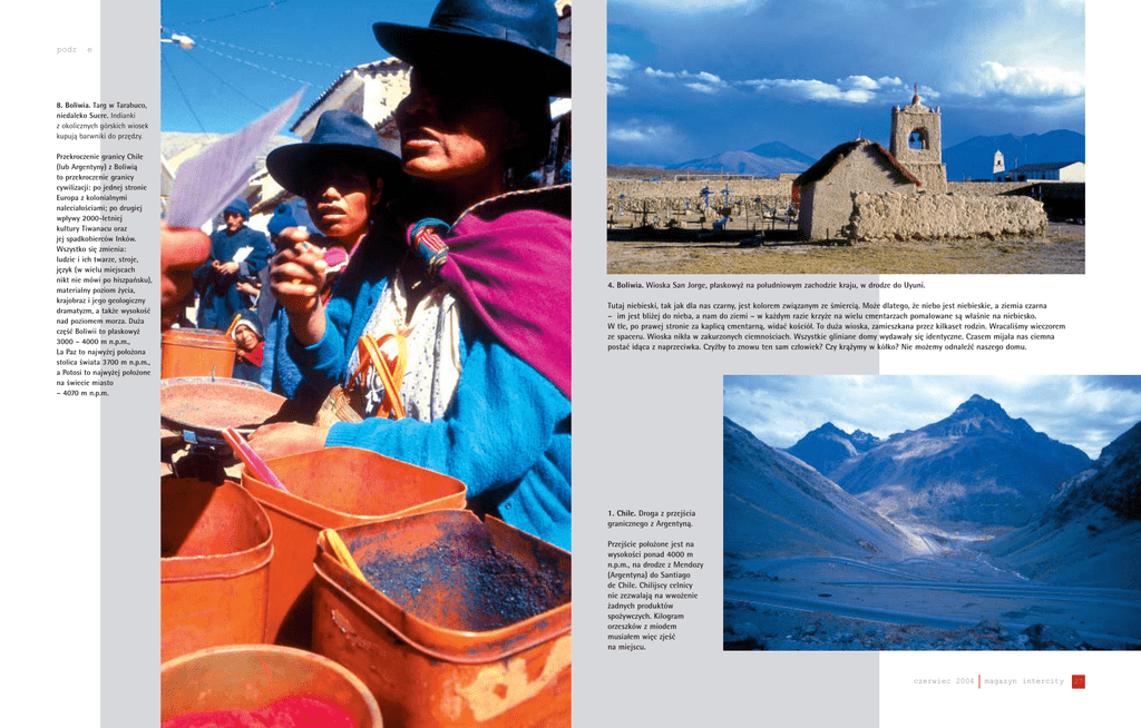podr e 8. Boliwia. Targ w Tarabuco, niedaleko Sucre. Indianki z okolicznych górskich wiosek kupujà barwniki do prz´dzy. Przekroczenie granicy Chile (lub Argentyny) z Boliwià to przekroczenie granicy cywilizacji: po jednej stronie Europa z kolonialnymi nalecia∏oÊciami; po drugiej wp∏ywy 2000-letniej kultury Tiwanacu oraz jej spadkobierców Inków. Wszystko si´ zmienia: ludzie i ich twarze, stroje, j´zyk (w wielu miejscach nikt nie mówi po hiszpaƒsku), materialny poziom ˝ycia, krajobraz i jego geologiczny dramatyzm, a tak˝e wysokoÊç nad poziomem morza. Du˝a cz´Êç Boliwii to p∏askowy˝ 3000 – 4000 m n.p.m., La Paz to najwy˝ej po∏o˝ona stolica Êwiata 3700 m n.p.m., a Potosi to najwy˝ej po∏o˝one na Êwiecie miasto – 4070 m n.p.m. 4. Boliwia. Wioska San Jorge, p∏askowy˝ na po∏udniowym zachodzie kraju, w drodze do Uyuni. Tutaj niebieski, tak jak dla nas czarny, jest kolorem zwiàzanym ze Êmiercià. Mo˝e dlatego, ˝e niebo jest niebieskie, a ziemia czarna – im jest bli˝ej do nieba, a nam do ziemi – w ka˝dym razie krzy˝e na wielu cmentarzach pomalowane sà w∏aÊnie na niebiesko. W tle, po prawej stronie za kaplicà cmentarnà, widaç koÊció∏. To du˝a wioska, zamieszkana przez kilkaset rodzin. WracaliÊmy wieczorem ze spaceru. Wioska nik∏a w zakurzonych ciemnoÊciach. Wszystkie gliniane domy wydawa∏y si´ identyczne. Czasem mija∏a nas ciemna postaç idàca z naprzeciwka. Czy˝by to znowu ten sam cz∏owiek? Czy krà˝ymy w kó∏ko? Nie mo˝emy odnaleêç naszego domu. 1. Chile. Droga z przejÊcia granicznego z Argentynà. PrzejÊcie po∏o˝one jest na wysokoÊci ponad 4000 m n.p.m., na drodze z Mendozy (Argentyna) do Santiago de Chile. Chilijscy celnicy nie zezwalajà na wwo˝enie ˝adnych produktów spo˝ywczych. Kilogram orzeszków z miodem musia∏em wi´c zjeÊç na miejscu. czerwiec 2004 magazyn intercity 27