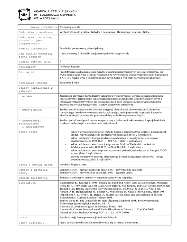 Nazwa przedmiotu Archeologia szkła Jednostka prowadząca Wydział Ceramiki i Szkła / Katedra Konserwacji i Restauracji Ceramiki i Szkła Jednostka dla której przedmiot jest przygotowany Rodzaj przedmiotu Przedmiot podstawowy, obowiązkowy. Rok studiów/semestr; forma studiów II rok, semestry 3-4, studia stacjonarne jednolite magisterskie Liczba punktów ECTS 2 Prowadzący Dr Paweł Rzeźnik Cel zajęć Przedstawienie aktualnego stanu wiedzy z zakresu najdawniejszych dziejów szklarstwa, od wynalezienia szkliw na Bliskim Wschodzie po wytwórczość środkowoeuropejskich hut leśnych z XIII-XV wieku wraz z podstawami metodyki badań i wyborem najważniejszych źródeł. Wymagania wstępne Zaliczenie I roku Efekty kształcenia w zakresie: – wiedzy Znajomość głównego nurtu dziejów szklarstwa w starożytności i średniowieczu; znajomość specjalistycznej terminologii szklarskiej; znajomość asortymentu wyrobów szkliwionych i szklanych reprezentatywnych dla poszczególnych epok i kręgów kulturowych; znajomość nazwisk czołowych badaczy oraz tytułów czołowych opracowań. – umiejętności Student potrafi samodzielnie dokonać wstępnej identyfikacji chronologiczno-kulturowej starożytnego i średniowiecznego zabytku szklanego; umie poprawnie rozpoznać kategorię, określić funkcję i przedstawić prawdopodobną technikę wykonania zabytku. – kompetencji personalnych i społecznych Student potrafi nawiązać kontakt merytoryczny z badaczami szkła o różnych specjalnościach: z zakresu archeologii, muzealnictwa i historii sztuki. Treść zajęć - szkło w archeologii: pojęcia i metody badań; charakterystyka wartości poznawczych źródeł i wprowadzenie do problematyki badawczej (blok 2 wykładów); szkło i szklarstwo Europy środkowo-wschodniej w starożytności i wczesnym średniowieczu, ca 1950 B.C. – 1200 A.D. (blok 10 wykładów); szkło i szklarstwo starożytne i antyczne na Bliskim Wschodzie i w świecie śródziemnomorskim 4000 B.C. – 450 A.D.(blok 10 wykładów); szkło i szklarstwo post-antyczne, wczesno- i późnośredniowieczne w Europie, V-XV w. n.e. (blok 6 wykładów); główne momenty w rozwoju starożytnego i średniowiecznego szklarstwa – uwagi podsumowujące (blok 2 wykładów). Forma i wymiar zajęć Wykłady 30 godz./ sem. Metody i kryteria oceny Semestr 3: 50% - przygotowanie do zajęć; 50% - aktywność na zajęciach Semestr 4: 50% - aktywność na zajęciach; 50% - egzamin ustny. Sposób zaliczenia Semestr 3: zaliczenie, semestr 4: egzamin końcowy ze stopniem. Literatura Baumgartner E., Krueger I., 1988, Phönix aus Sand und Asche. Glas des Mittelalters, München. Grose D. F., 1989, Early Ancient Glass. Core-formed, Rod-formed, and Cast Vessels and Objects from the Late Bronze Age to the Early Roman Empire, 1600 B.C. to A.D. 50, New York. Harden D. B., Hellenkemper H., Painter K., Whitehouse D., Glass of the Caesars, Milan 1987. Oppenheim A. L., Brill R. H., Barag D., Saldern A. von, Glass and glassmaking in ancient Mesopotamia, Corning-London-Toronto 1988. Schlick-Nolte B., Die Glasgefäße im alten Ägypten, München 1968. Seria wydawnicza: Münchener ägyptologische Studien, Bd. 14. Venclová N., Prehistoric glass in Bohemia, Praha 1990. Annales du Congrès International d’Etude Historique du Verre, t. 1-17 (1959-2009). Journal of Glass Studies, Corning, N.Y., t. 1–52 (1959-2010). Uwagi Wykłady mają formę prezentacji multimedialnych. Język wykładowy Język polski z możliwością komunikowania się w języku niemieckim.