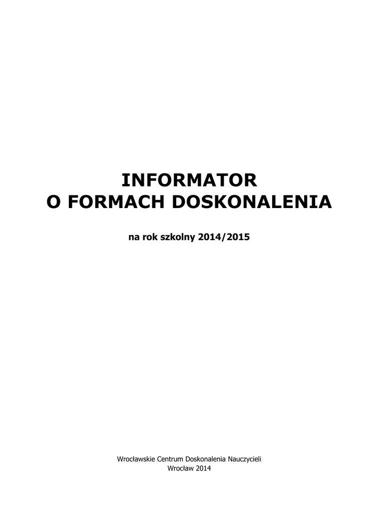 INFORMATOR O FORMACH DOSKONALENIA na rok szkolny 2014/2015 Wrocławskie Centrum Doskonalenia Nauczycieli Wrocław 2014 Wydawca: Wrocławskie Centrum Doskonalenia Nauczycieli 50-089 Wrocław, ul. Swobodna 73a Tel. +48 71 796 45 60, fax +48 71 796 45 61 ISBN 978-83-931468-4-0 Szanowni Państwo Dyrektorzy i Nauczyciele Szkół i Placówek Oświatowych we Wrocławiu Wrocławskie Centrum Doskonalenia Nauczycieli przez kolejny rok pragnie wspierać Państwa w codziennej pracy. Wsłuchując się w Państwa uwagi i propozycje, a także mając na uwadze badania ankietowe, badania online, spotkania w szkołach oraz informacje zebrane po szkoleniach, zamieściliśmy w Informatorze różnorodne propozycje warsztatów, kursów, seminariów i konsultacji. Szczególnie polecamy Państwa uwadze zajęcia mające na celu wzmocnienie metodyki przedmiotu – szkolenia uwzględniają potrzeby nauczycieli zainteresowanych egzaminami zewnętrznymi (np. nową formułą matury i sprawdzianu od 2015 r.). Do Informatora włączyliśmy nowy dział Kreatywność i innowacyjność w edukacji, a także formy uwzględniające wykorzystywanie metod coachingowych w edukacji. Od września kontynuowany będzie innowacyjny projekt „Przeciw obojętności, ignorancji...”, umożliwiający nauczycielom uczestniczenie w zajęciach otwartych. Wprowadziliśmy również formy doskonalenia, które – wpisując się w ideę „Szkoły w mieście” – ułatwiają prowadzenie zajęć terenowych oraz związanych z miejscami pamięci. Poza tym zachowaliśmy te formy, które cieszyły się dotąd największym Państwa zainteresowaniem i były najczęściej wybierane przez dyrektorów i nauczycieli. Warto też zapoznać się z różnorodnymi, krótkimi formami nieodpłatnymi. Zachęcamy więc do korzystania z różnych form doskonalenia, przygotowanych przez doradców i konsultantów, zachęcamy do uczestnictwa w seminariach, wykładach, debatach i diagnozach WCDN. Walorem naszych propozycji są: interesująca, aktualizowana wiedza i otwartość na Państwa potrzeby. Z ofertą szkoleń mogą się Państwo zapoznać również na stronie www.wcdn.wroc.pl w linku Informator. Na początku Informatora znajdą Państwo druki zgłoszeń oraz cennik. Bardzo prosimy o uważne zapoznanie się z treścią rozdziału Zgłoszenia udziału w formie doskonalenia WCDN – zostały tam zawarte najważniejsze informacje dotyczące udziału w szkoleniu. Dziękujemy Państwu za wieloletnią współpracę i życzymy wielu sukcesów oraz satysfakcji w nowym roku szkolnym. Z wyrazami szacunku Dyrektor oraz Pracownicy Wrocławskiego Centrum Doskonalenia Nauczycieli Spis treści I. Zgłoszenia na szkolenia i zasady odpłatności / Tryb zgłoszenia i odpłatności / 17 Zasady wystawiania faktur / 18 Zgłoszenie udziału w formie doskonalenia WCDN / Zgłoszenie szkolenia rady pedagogicznej / 21 II. Konferencje otwarcia / 15 19 23 Wychowanie przedszkolne i edukacja wczesnoszkolna / Szkoła podstawowa / 25 Gimnazjum / 27 Szkoła ponadgimnazjalna / 29 25 III. Szkolenia dla dyrektorów i wicedyrektorów szkół i placówek oświatowych / 33 Repetytorium z pomiaru dydaktycznego w kontekście diagnoz przygotowanych przez WCDN / 35 Awans zawodowy nauczyciela – zadania dyrektora – repetytorium / 36 Nadzór dyrektora nad awansem zawodowym nauczyciela / 37 Współpraca dyrektora/wicedyrektora z pedagogiem, psychologiem szkolnym oraz z poradnią psychologiczno-pedagogiczną / 38 Kompetencje kluczowe wicedyrektora szkoły / 39 Kodeks etyczny dyrektora i wicedyrektora w pracy szkoły / 40 Nadzór dyrektora nad wypełnianiem przez nauczycieli obowiązków wynikających ze sprawowania opieki nad uczniami / 41 Dyrektor – kreator kultury organizacyjnej szkoły / 42 Instrukcja kancelaryjna / 43 Prawidłowe prowadzenie dokumentacji pedagogicznej / 44 Organizacja nadzoru pedagogicznego / 45 Zmiany w prawie oświatowym i ich konsekwencje / 46 Kontrola sprawowana przez dyrektora szkoły, czyli co, kogo, kiedy i jak kontrolować / 47 Ocena pracy nauczyciela / 48 Procedura tworzenia Szkolnych Zestawów Programów Nauczania / 49 Obserwacja lekcji jako element nadzoru pedagogicznego / 50 Innowacje i eksperymenty pedagogiczne / 51 5 Informator o formach doskonalenia Społeczne organy szkoły / 52 Ocena pracy pedagoga szkolnego / 53 Prawo pracy i prawo oświatowe (spotkania tematyczne) / 54 Zakładanie organizacji pozarządowych dla wspierania realizacji zadań edukacyjnych w szkole / 55 Aplikowanie o środki zewnętrzne do jednostek samorządowych i rządowych na wspomaganie zadań edukacyjnych szkolnych i pozaszkolnych / 56 Prowadzenie rozmów z wykorzystaniem technik coachingowych / 57 Prawo w praktyce szkolnej / 58 Tworzenie prawa wewnątrzszkolnego / 59 Dyrektor jako organ prowadzący postępowanie administracyjne / 60 Dyskryminacja i mobbing w pracy / 61 Idea FranklinCovey „7 nawyków skutecznego działania” w pracy dyrektora szkoły i nauczycieli / 62 IV. Szkolenia dla nauczycieli / 63 KURSY KWALIFIKACYJNE Kurs kwalifikacyjny z organizacji i zarządzania oświatą / 67 REFORMA PROGRAMOWA ABC matury 2015 / 71 Zajęcia terenowe w nauczaniu przyrody i geografii / 72 Komunikacja wizualna – plakat / 73 Egzamin ustny z języka polskiego od 2015 roku / 74 Zmiany w nauczaniu geografii wynikające z reformy programowej / 75 Przygotowanie i modyfikacja programu nauczania w zawodzie / 76 Praca z uczniem zainteresowanym zdawaniem biologii na maturze / 77 Modyfikowanie programów nauczania (język obcy nowożytny) / 78 Indywidualizacja nauczania – kwadratura koła? / 79 Matura 2015 – konstruowanie zadań przygotowujących do egzaminu maturalnego z chemii / 80 AWANS ZAWODOWY Działania w trakcie stażu – przygotowanie dokumentacji oraz wystąpienia podczas egzaminu, rozmowy na kolejny stopień awansu zawodowego nauczyciela / 83 Nauczyciel stażysta w przedszkolu / 84 Awans zawodowy – od nauczyciela kontraktowego do mianowanego / 85 6 Spis treści Awans zawodowy na stopień 