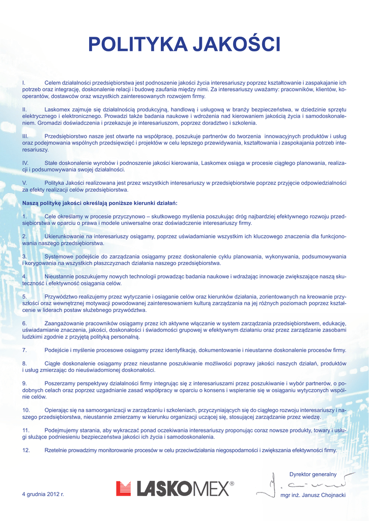 POLITYKA JAKOŚCI I. Celem działalności przedsiębiorstwa jest podnoszenie jakości życia interesariuszy poprzez kształtowanie i zaspakajanie ich potrzeb oraz integrację, doskonalenie relacji i budowę zaufania między nimi. Za interesariuszy uważamy: pracowników, klientów, kooperantów, dostawców oraz wszystkich zainteresowanych rozwojem firmy. II. Laskomex zajmuje się działalnością produkcyjną, handlową i usługową w branży bezpieczeństwa, w dziedzinie sprzętu elektrycznego i elektronicznego. Prowadzi także badania naukowe i wdrożenia nad kierowaniem jakością życia i samodoskonaleniem. Gromadzi doświadczenia i przekazuje je interesariuszom, poprzez doradztwo i szkolenia. III. Przedsiębiorstwo nasze jest otwarte na współpracę, poszukuje partnerów do tworzenia innowacyjnych produktów i usług oraz podejmowania wspólnych przedsięwzięć i projektów w celu lepszego przewidywania, kształtowania i zaspokajania potrzeb interesariuszy. IV. Stałe doskonalenie wyrobów i podnoszenie jakości kierowania, Laskomex osiąga w procesie ciągłego planowania, realizacji i podsumowywania swojej działalności. V. Polityka Jakości realizowana jest przez wszystkich interesariuszy w przedsiębiorstwie poprzez przyjęcie odpowiedzialności za efekty realizacji celów przedsiębiorstwa. Naszą politykę jakości określają poniższe kierunki działań: 1. Cele określamy w procesie przyczynowo – skutkowego myślenia poszukując dróg najbardziej efektywnego rozwoju przedsiębiorstwa w oparciu o prawa i modele uniwersalne oraz doświadczenie interesariuszy firmy. 2. Ukierunkowanie na interesariuszy osiągamy, poprzez uświadamianie wszystkim ich kluczowego znaczenia dla funkcjonowania naszego przedsiębiorstwa. 3. Systemowe podejście do zarządzania osiągamy przez doskonalenie cyklu planowania, wykonywania, podsumowywania i korygowania na wszystkich płaszczyznach działania naszego przedsiębiorstwa. 4. Nieustannie poszukujemy nowych technologii prowadząc badania naukowe i wdrażając innowacje zwiększające naszą skuteczność i efektywność osiągania celów. 5. Przywództwo realizujemy przez wytyczanie i osiąganie celów oraz kierunków działania, zorientowanych na kreowanie przyszłości oraz wewnętrznej motywacji powodowanej zainteresowaniem kulturą zarządzania na jej różnych poziomach poprzez kształcenie w liderach postaw służebnego przywództwa. 6. Zaangażowanie pracowników osiągamy przez ich aktywne włączanie w system zarządzania przedsiębiorstwem, edukację, uświadamianie znaczenia, jakości, doskonałości i świadomości grupowej w efektywnym działaniu oraz przez zarządzanie zasobami ludzkimi zgodnie z przyjętą polityką personalną. 7. Podejście i myślenie procesowe osiągamy przez identyfikację, dokumentowanie i nieustanne doskonalenie procesów firmy. 8. Ciągłe doskonalenie osiągamy przez nieustanne poszukiwanie możliwości poprawy jakości naszych działań, produktów i usług zmierzając do nieuświadomionej doskonałości. 9. Poszerzamy perspektywy działalności firmy integrując się z interesariuszami przez poszukiwanie i wybór partnerów, o podobnych celach oraz poprzez uzgadnianie zasad współpracy w oparciu o konsens i wspieranie się w osiąganiu wytyczonych wspólnie celów. 10. Opierając się na samoorganizacji w zarządzaniu i szkoleniach, przyczyniających się do ciągłego rozwoju interesariuszy i naszego przedsiębiorstwa, nieustannie zmierzamy w kierunku organizacji uczącej się, stosującej zarządzanie przez wiedzę. 11. Podejmujemy starania, aby wykraczać ponad oczekiwania interesariuszy proponując coraz nowsze produkty, towary i usługi służące podniesieniu bezpieczeństwa jakości ich życia i samodoskonalenia. 12. Rzetelnie prowadzimy monitorowanie procesów w celu przeciwdziałania niegospodarności i zwiększania efektywności firmy. Dyrektor generalny 4 grudnia 2012 r. mgr inż. Janusz Chojnacki