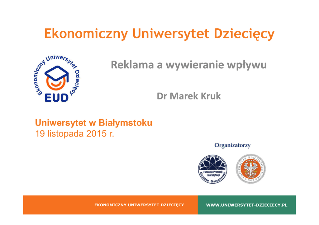 Ekonomiczny Uniwersytet Dziecięcy Reklama a wywieranie wpływu Dr Marek Kruk Uniwersytet w Białymstoku 19 listopada 2015 r. EKONOMICZNY UNIWERSYTET DZIECIĘCY WWW.UNIWERSYTET-DZIECIECY.PL Zamiast wstępu Który produkt bardziej się Wam podoba? A B EKONOMICZNY UNIWERSYTET DZIECIĘCY WWW.UNIWERSYTET-DZIECIECY.PL Po co firmom reklama: - klienci nie wiedzą o wszystkim ;) - trzeba zaprezentować się lepiej niż konkurencja ;) - poprzez przypominanie się klientowi utrwala się markę ;) EKONOMICZNY UNIWERSYTET DZIECIĘCY WWW.UNIWERSYTET-DZIECIECY.PL Jak działa reklama? EKONOMICZNY UNIWERSYTET DZIECIĘCY WWW.UNIWERSYTET-DZIECIECY.PL Jak działa reklama? EKONOMICZNY UNIWERSYTET DZIECIĘCY WWW.UNIWERSYTET-DZIECIECY.PL Jak działa reklama? - dostrzeganie fizycznych cech informacji – kształty, barwy, jasność; - dostrzeganie cech przestrzennych - relacje wielkości, związki przestrzenne; - cechy semantyczne – znaczenie informacji i związki skojarzeniowe. EKONOMICZNY UNIWERSYTET DZIECIĘCY WWW.UNIWERSYTET-DZIECIECY.PL Jak działa reklama? – model AIDA - A (uwaga) – jeśli odbiorca nie zwróci uwagi na reklamę to ona nie zadziała! - I (zainteresowanie) – jeśli reklama nie będzie ciekawa to klient ją zignoruje! - D (pragnienie) – klient musi mocno odczuć chęć posiadania produktu! - A (działanie) – klient musi mocno odczuć chęć posiadania produktu! EKONOMICZNY UNIWERSYTET DZIECIĘCY WWW.UNIWERSYTET-DZIECIECY.PL Jak przyciągnąć klientów za pomocą reklamy? - poprzez zabawę; - poprzez szokowanie; - poprzez uczenie postaw; - poprzez dobre hasło. EKONOMICZNY UNIWERSYTET DZIECIĘCY WWW.UNIWERSYTET-DZIECIECY.PL Co to jest copywriting? Jest to sztuka pisania skutecznych oraz kreatywnych tekstów marketingowych (m. in.): ● tytułów, ● nagłówków, ● sloganów, ● scenariuszy spotów reklamowych. To proces, który ma zadanie promować biznes, produkt, osobę oraz ideę za pomocą słowa pisanego. EKONOMICZNY UNIWERSYTET DZIECIĘCY WWW.UNIWERSYTET-DZIECIECY.PL Dziękuję za uwagę ☺ EKONOMICZNY UNIWERSYTET DZIECIĘCY WWW.UNIWERSYTET-DZIECIECY.PL A teraz zadanie dla Was: Tworzenie skutecznej reklamy EUD Niech to będzie coś niezwykłego ;) EKONOMICZNY UNIWERSYTET DZIECIĘCY WWW.UNIWERSYTET-DZIECIECY.PL