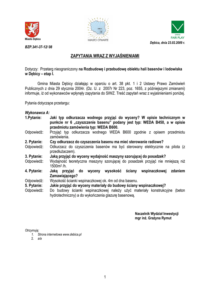 Miasto Dębica Dębica, dnia 23.02.2009 r. BZP.341-37-12/ 08 ZAPYTANIA WRAZ Z WYJAŚNIENIAMI Dotyczy: Przetarg nieograniczony na Rozbudowę i przebudowę obiektu hali basenów i lodowiska w Dębicy – etap I. Gmina Miasta Dębicy działając w oparciu o art. 38 pkt. 1 i 2 Ustawy Prawo Zamówień Publicznych z dnia 29 stycznia 2004r. (Dz. U. z 2007r Nr 223, poz. 1655, z późniejszymi zmianami) informuje, iŜ od wykonawców wpłynęły zapytania do SIWZ. Treść zapytań wraz z wyjaśnieniami poniŜej. Pytania dotyczące przetargu: Wykonawca A: 1.Pytanie: Jaki typ odkurzacza wodnego przyjąć do wyceny? W opisie technicznym w punkcie nr 6 „czyszczenie basenu” podany jest typ: WEDA B450, a w opisie przedmiotu zamówienia typ: WEDA B600. Odpowiedź: Przyjąć typ odkurzacza wodnego WEDA B600 zgodnie z opisem przedmiotu zamówienia. 2. Pytanie: Czy odkurzacz do czyszczenia basenu ma mieć sterowanie radiowe? Odpowiedź: Odkurzacz do czyszczenia basenów ma być sterowany elektrycznie na pilota (z przedłuŜaczem). 3. Pytanie: Jaką przyjąć do wyceny wydajność maszyny szorującej do posadzek? Odpowiedź: Wydajność teoretyczna maszyny szorującej do posadzek przyjąć nie mniejszą niŜ 1500m2 /h. 4. Pytanie: Jaką przyjąć do wyceny wysokość ściany wspinaczkowej zdaniem Zamawiającego? Odpowiedź: Wysokość ścianki wspinaczkowej ok. 4m od dna basenu. 5. Pytanie: Jakie przyjąć do wyceny materiały do budowy ściany wspinaczkowej? Odpowiedź: Do budowy ścianki wspinaczkowej naleŜy uŜyć materiały konstrukcyjne (beton hydrotechniczny) a do wykończenia glazurę basenową. Naczelnik Wydział Inwestycji mgr inŜ. GraŜyna Rymut Otrzymują: 1. Strona internetowa www.debica.pl 2. a/a 1