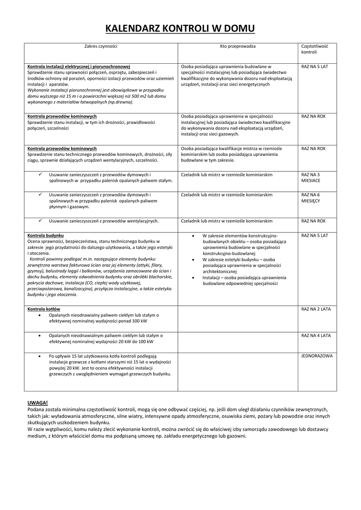 KALENDARZ KONTROLI W DOMU Zakres czynności Kto przeprowadza Częstotliwość kontroli Kontrola instalacji elektrycznej i piorunochronowej Sprawdzenie stanu sprawności połączeń, osprzętu, zabezpieczeń i środków ochrony od porażeń, oporności izolacji przewodów oraz uziemień instalacji i aparatów. Wykonanie instalacji piorunochronnej jest obowiązkowe w przypadku domu wyższego niż 15 m i o powierzchni większej niż 500 m2 lub domu wykonanego z materiałów łatwopalnych (np.drewna). Osoba posiadająca uprawnienia budowlane w specjalności instalacyjnej lub posiadająca świadectwo kwalifikacyjne do wykonywania dozoru nad eksploatacją urządzeń, instalacji oraz sieci energetycznych RAZ NA 5 LAT Kontrola przewodów kominowych Sprawdzenie stanu instalacji, w tym ich drożności, prawidłowości połączeń, szczelności Osoba posiadająca uprawnienia w specjalności instalacyjnej lub posiadająca świadectwo kwalifikacyjne do wykonywania dozoru nad eksploatacją urządzeń, instalacji oraz sieci gazowych. RAZ NA ROK Kontrola przewodów kominowych Sprawdzenie stanu technicznego przewodów kominowych, drożności, siły ciągu, sprawnie działających urządzeń wentylacyjnych, szczelności. Osoba posiadająca kwalifikacje mistrza w rzemiośle kominiarskim lub osoba posiadająca uprawnienia budowlane w tym zakresie. RAZ NA ROK Usuwanie zanieczyszczeń z przewodów dymowych i spalinowych w przypadku palenisk opalanych paliwem stałym. Czeladnik lub mistrz w rzemiośle kominiarskim RAZ NA 3 MIESIACE Usuwanie zanieczyszczeń z przewodów dymowych i spalinowych w przypadku palenisk opalanych paliwem płynnym i gazowym. Czeladnik lub mistrz w rzemiośle kominiarskim RAZ NA 6 MIESIĘCY Usuwanie zanieczyszczeń z przewodów wentylacyjnych. Czeladnik lub mistrz w rzemiośle kominiarskim RAZ NA ROK Kontrola budynku Ocena sprawności, bezpieczeństwa, stanu technicznego budynku w zakresie jego przydatności do dalszego użytkowania, a także jego estetyki i otoczenia. Kontroli powinny podlegać m.in. następujące elementy budynku: zewnętrzna warstwa fakturowa ścian oraz jej elementy (attyki, filary, gzymsy), balustrady loggii i balkonów, urządzenia zamocowane do ścian i dachu budynku, elementy odwodnienia budynku oraz obróbki blacharskie, pokrycia dachowe, instalacja (CO, ciepłej wody użytkowej, przeciwpożarowa, kanalizacyjna), przyłącza instalacyjne, a także estetyka budynku i jego otoczenia. Kontrola kotłów Opalanych nieodnawialny paliwem ciekłym lub stałym o efektywnej nominalnej wydajności ponad 100 kW W zakresie elementów konstrukcyjnobudowlanych obiektu – osoba posiadająca uprawnienia budowlane w specjalności konstrukcyjno-budowlanej W zakresie estetyki budynku – osoba posiadająca uprawnienia w specjalności architektonicznej Instalacji – osoba posiadająca uprawnienia budowlane odpowiedniej specjalności RAZ NA 5 LAT RAZ NA 2 LATA Opalanych nieodnawialnym paliwem ciekłym lub stałym o efektywnej nominalnej wydajności 20 kW do 100 kW RAZ NA 4 LATA Po upływie 15 lat użytkowania kotła kontroli podlegają instalacje grzewcze z kotłami starszymi niż 15 lat o wydajności powyżej 20 kW. Jest to ocena efektywności instalacji grzewczych z uwzględnieniem wymagań grzewczych budynku. JEDNORAZOWA UWAGA! Podana została minimalna częstotliwość kontroli, mogą się one odbywać częściej, np. jeśli dom uległ działaniu czynników zewnętrznych, takich jak: wyładowania atmosferyczne, silne wiatry, intensywne opady atmosferyczne, osuwiska ziemi, pożary lub powodzie oraz innych skutkujących uszkodzeniem budynku. W razie wątpliwości, komu należy zlecić wykonanie kontroli, można zwrócić się do właściwej izby samorządu zawodowego lub dostawcy medium, z którym właściciel domu ma podpisaną umowę np. zakładu energetycznego lub gazowni.