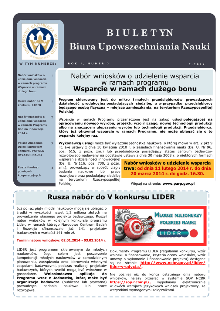 B I U L E T YN Biura Upowszechniania Nauki W TYM NUMERZE: Nabór wniosków o 1 udzielenie wsparcia w ramach programu Wsparcie w ramach dużego bonu Rusza nabór do V 1 konkursu LIDER Nabór wniosków o 2 udzielenie wsparcia w ramach Programu Bon na innowacje 2014 r. Polska Akademia 3 Dzieci laureatem konkursu POPULARYZATOR NAUKI Rusza fundusz powiązań kooperacyjnych 4 R O K 1 , N U M E R 3 2 . 2 0 1 4 Nabór wniosków o udzielenie wsparcia w ramach programu Wsparcie w ramach dużego bonu Program skierowany jest do mikro i małych przedsiębiorców prowadzących działalność produkcyjną posiadających siedzibę, a w przypadku przedsiębiorcy będącego osobą fizyczną – miejsce zamieszkania, na terytorium Rzeczypospolitej Polskiej. Wsparcie w ramach Programu przeznaczone jest na zakup usługi polegającej na opracowaniu nowego wyrobu, projektu wzorniczego, nowej technologii produkcji albo na znaczącym ulepszeniu wyrobu lub technologii produkcji. Przedsiębiorca, który już otrzymał wsparcie w ramach Programu, nie może ubiegać się o to wsparcie kolejny raz. Wykonawcą usługi może być wyłącznie jednostka naukowa, o której mowa w art. 2 pkt 9 lit. a-e ustawy z dnia 30 kwietnia 2010 r. o zasadach finansowania nauki (Dz. U. Nr 96, poz. 615, z późn. zm.) lub przedsiębiorca posiadający status centrum badawczorozwojowego nadawany na podstawie ustawy z dnia 30 maja 2008 r. o niektórych formach wspierania działalności innowacyjnej (Dz. U. Nr 116, poz. 730, z późn. Nabór wniosków o udzielenie wsparcia zm.), prowadzący w sposób ciągły trwa: od dnia 11 lutego 2014 r. do dnia badania naukowe lub prace 20 marca 2014 r. do godz. 16.30. rozwojowe oraz posiadający siedzibę na terytorium Rzeczypospolitej Polskiej. Więcej na stronie: www.parp.gov.pl Rusza nabór do V konkursu LIDER Już po raz piąty młodzi naukowcy mogą się ubiegać o środki w wysokości nawet 1,2 miliona złotych na prowadzenie własnego projektu badawczego. Ruszył nabór wniosków w kolejnym konkursie programu Lider, w ramach którego Narodowe Centrum Badań i Rozwoju sfinansowało już 141 projektów badawczych o wartości 141 mln zł. Termin naboru wniosków: 02.01.2014 - 03.03.2014 r. LIDER jest programem skierowanym do młodych naukowców. Jego celem jest poszerzenie kompetencji młodych naukowców w samodzielnym planowaniu, zarządzaniu oraz kierowaniu własnymi zespołami badawczymi, podczas realizacji projektów badawczych, których wyniki mogą być wdrożone w gospodarce. Wnioskodawca aplikuje do Programu wraz z Jednostką, którą może być organizacja badawcza (publiczna lub prywatna) prowadząca badania naukowe lub prace rozwojowe. Dokumenty Programu LIDER (regulamin konkursu, wzór wniosku o finansowanie, kryteria oceny wniosków, wzór umowy o wykonanie i finansowanie projektu) dostępne są na stronie http://www.ncbr.gov.pl/lider/ lider-v-edycja/. Nie później niż do końca ostatniego dnia naboru wniosków, należy przesłać w systemie SOP NCBR https://sop.ncbir.pl/, wypełniony elektronicznie w dwóch wersjach językowych wniosek projektowy, ze wszystkimi wymaganymi załącznikami. STR. 2 Program Bon na innowacje - nabór wniosków o udzielenie wsparcia w 2014 Celem Programu jest zainicjowanie kontaktów mikro lub małych przedsiębiorców z jednostkami naukowymi. Wsparcie w ramach Programu jest przeznaczone na zakup usługi, bezpośrednio dotyczy rozwoju produktu lub technologii Wnioskodawcy. która Program jest skierowany do mikro i małych przedsiębiorców, którzy w roku złożenia wniosku oraz w ciągu 3 lat kalendarzowych poprzedzających rok złożenia wniosku o udzielenie wsparcia w ramach programu Bon na innowacje, nie korzystali z usług jednostki naukowej w zakresie wdrożenia lub rozwoju produktu lub technologii. Przedsiębiorca, który już uzyskał wsparcie w ramach Programu Bon na innowacje, nie może ubiegać się o wsparcie kolejny raz. POLECAMY LINKI Proszę nakierować kursor na link, który ma zostać otwarty. Wykonawcą usługi może być wyłącznie jednostka naukowa określona w art. 2 pkt. 9a-e ustawy z dnia 30 kwietnia 2010 r. o zasadach finansowania nauki (Dz. U. Nr 96 poz. 615) prowadząca w sposób ciągły badania naukowe lub prace rozwojowe oraz posiadająca siedzibę na terytorium Rzeczpospolitej Polskiej. Usługę dla przedsiębiorcy może realizować wyłącznie jedna jednostka naukowa. Dokumentacja dla Programu Bon na innowacje Kwota wsparcia udzielona jednemu przedsiębiorcy w ramach programu Bon na innowacje nie może przekroczyć 15 000 zł. Wielkość wsparcia może wynosić do 100% wydatków kwalifikujących się do objęcia wsparciem pod warunkiem, iż rzeczywisty koszt netto zrealizowanej usługi dotyczącej wdrożenia lub rozwoju produktu lub technologii wynosi maksymalnie 15 000 zł. Nabór wniosków trwa od dnia 13 lutego 2014 r. Przedsiębiorca zobowiązany jest do zapewnienia do dnia 14 marca 2014 r. do godz. 16.30. finansowania projektu w części nieobjętej wsparciem (tj. kwoty podatku od towarów i usług, wartości usługi W przypadku zarejestrowania wniosków w Generatorze netto przekraczającej kwotę 15 000 zł). Wniosków na kwotę wyczerpującą 100% alokacji, PARP poinformuje na stronie internetowej www.parp.gov.pl z 3 dniowym wyprzedzeniem o skróconym terminie zakończe- Wsparcie w ramach programu Bon na innowacje stanowi nia składania wniosków. pomoc de minimis i jest udzielane zgodnie z przepisami rozporządzenia Komisji (WE) nr 1998/2006 z dnia 15 grudnia 2006 r. w sprawie stosowania art. 87 i 88 Traktatu WE do pomocy de minimis (Dz. Urz. UE L 379 z 28.12.2006 r., str. 5). Program finansowany jest przez Ministerstwo Gospodarki ze środków budżetu państwa. Proces złożenia wniosku o udzielenie wsparcia obejmuje kolejno dwie obowiązkowe czynności - tj. złożenie (zarejestrowanie) wniosku o udzielenie wsparcia po jego wypełnieniu i zablokowaniu po pozytywnej walidacji poprzez naciśnięcie przycisku „złó