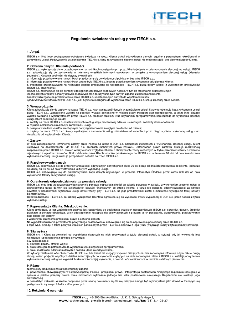 Regulamin świadczenia usług przez iTECH s.c. 1. Angaż ITECH s.c. i/lub jego podwykonawca/dostawca świadczy na rzecz Klienta usługi odzyskiwania danych zgodne z parametrami określonymi w zamówieniu usługi. Podwyższenie ustalonej przez ITECH s.c. ceny za wykonanie zleconej usługi nie może nastąpić bez pisemnej zgody Klienta. 2. Ochrona danych. Klauzula poufności. ITECH s.c. wykorzystuje dane przechowywane na nośnikach udostępnionych przez Klienta jedynie w celu wykonania zleconej mu usługi. ITECH s.c. zobowiązuje się do zachowania w tajemnicy wszelkich informacji uzyskanych w związku z wykonywaniem zleconej usługi (klauzula poufności). Klauzula poufności nie dotyczy sytuacji gdy: a. informacje przechowywane na nośnikach przedostaną się do wiadomości publicznej bez winy ITECH s.c.; b. informacje przechowywane na nośnikach znane były ITECH s.c. jeszcze przed zleceniem wykonania usługi przez Klienta; c. informacje przechowywane na nośnikach zostaną przekazane do wiadomości ITECH s.c. przez osoby trzecie (z wyłączeniem pracowników ITECH s.c. oraz Klienta); ITECH s.c. zobowiązuje się do ochrony udostępnionych danych osobowych Klienta, w tym do stosowania organizacyjnych i technicznych środków ochrony danych osobowych oraz do używania tych danych zgodnie z zaleceniami Klienta. Klient wyraża zgodę na przekazywanie przez ITECH s.c. udostępnionych danych do współpracowników i podwykonawców/dostawców ITECH s.c., jeśli będzie to niezbędne do wykonania przez ITECH s.c. usługi zleconej przez Klienta. 3. Wynagrodzenie Klient zobowiązuje się do zapłaty na rzecz ITECH s.c. kwot wyszczególnionych w zamówieniu usługi. Kwoty te obejmują koszt wykonania usługi przez ITECH s.c., uzasadnione wydatki na podróże, wydatki poniesione w miejscu pracy, transport oraz ubezpieczenie, a także inne bieżące wydatki związane z wykorzystaniem przez ITECH s.c. środków przekazu i/lub używaniem oprogramowania koniecznego do wykonania zleconej usługi. Klient zobowiązuje się do: a. zapłaty na rzecz ITECH s.c. odsetek liczonych według stopy procentowej odsetek ustawowych za każdy dzień opóźnienia w zapłacie należności określonej w zamówieniu usługi. b. pokrycia wszelkich kosztów niezbędnych do wyegzekwowania zaległych należności od Klienta; c. zapłaty na rzecz ITECH s.c. kwoty wynikającej z zamówienia usługi niezależnie od akceptacji przez niego wyników wykonanej usługi oraz niezależnie od wypłacalności Klienta. 4. Zastaw W celu zabezpieczenia terminowej zapłaty przez Klienta na rzecz ITECH s.c. należności związanych z wykonaniem zleconej usługi, Klient ustanawia na dostarczonych do ITECH s.c. rzeczach ruchomych prawo zastawu. Ustanowione prawo zastawu skutkuje możliwością zaspokojenia przez ITECH s.c. swoich wierzytelności względem Klienta z obciążonych rzeczy ruchomych w trybie przepisów ustawy o zastawie rejestrowym i rejestrze zastawów. Brak odebrania przez Klienta nośnika przekazanego do ITECH s.c. w terminie 90 dni od dnia zakończenia wykonania zleconej usługi skutkuje przepadkiem nośnika na rzecz ITECH s.c.. 5. Przechowywanie danych ITECH s.c. zobowiązuje się do przechowywania kopii odzyskanych danych przez okres 30 dni licząc od dnia ich przekazania do Klienta, jednakże nie dłużej niż 40 dni od dnia wystawienia faktury za wykonaną usługę. ITECH s.c. zobowiązuje się do przechowywania kopii danych uzyskanych w procesie Informatyki Śledczej przez okres 360 dni od dnia wystawienia faktury za wykonaną usługę. 6. Ograniczenie odpowiedzialności za powstałą szkodę. ITECH s.c. oraz jego podwykonawcy/dostawcy nie ponoszą odpowiedzialności za szkodę powstałą w związku z wykonaniem zleconej usługi a spowodowaną utratą danych lub jakichkolwiek korzyści finansowych po stronie Klienta, a także nie ponoszą odpowiedzialności za szkodę powstałą w konsekwencji wykonania usługi, nawet wtedy, gdy ITECH s.c. lub jego przedstawiciel został o możliwości wystąpienia takiej szkody poinformowany. Odpowiedzialność ITECH s.c. za szkodę wyrządzoną Klientowi ogranicza się do wysokości kwoty wypłaconej ITECH s.c. przez Klienta z tytułu wykonanej usługi. 7. Reprezentacja Klienta. Odszkodowanie. Klient oświadcza, iż jest właścicielem oraz/lub jest uprawniony do posiadania wszelkich udostępnionych ITECH s.c. sprzętów, danych, środków przekazu, a ponadto oświadcza, iż ich udostępnienie następuje dla celów zgodnych z prawem, a ich posiadanie, przetwarzanie, przekazywanie oraz odbiór jest zgodny z właściwymi dla Klienta przepisami prawa o ochronie danych. Na wypadek naruszenia przez Klienta powyższego postanowienia, zobowiązuje się on do naprawienia poniesionej przez ITECH s.c. z tego tytułu szkody, a także pokrycia wszelkich poniesionych przez ITECH s.c. kosztów z tego tytułu (włączając koszty z tytułu pomocy prawnej). 8. Siła wyższa ITECH s.c. i Klient są zwolnieni od wypełnienia ciążących na nich zobowiązań z tytułu zleconej usługi, w sytuacji gdy jej wykonanie jest niemożliwe lub utrudnione z powodu siły wyższej, a w szczególności: a. powodzi, pożaru, strajku, wojny; b. braku dostępu do potrzebnych do wykonania usługi części lub oprogramowania; c. braku możliwości odczytania danych z nośnika (dane nieodzyskiwalne). W sytuacji zaistnienia w/w okoliczności ITECH s.c. lub Klient nie mogący wypełnić ciążących na nim zobowiązań informuje o tym fakcie drugą stronę, celem podjęcia wspólnych działań zmierzających do wykonania ciążących na nich zobowiązań. Klient i ITECH s.c. ustalają nowy termin wykonania zleconej usługi na wypadek braku możliwości jej wykonania, z powodu w/w okoliczności, w terminie ustalonym pierwotnie. 9. Różne Niemniejszy Regulamin został sporządzony zgodnie z powszechnie obowiązującymi w Rzeczypospolitej Polskiej przepisami prawa. Interpretacja postanowień niniejszego regulaminu następuje w