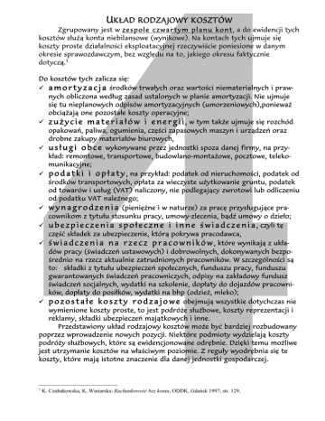UKŁAD RODZAJOWY KOSZTÓW Zgrupowany jest w zespole czwartym planu kont, a do ewidencji tych kosztów służą konta niebilansowe (wynikowe). Na kontach tych ujmuje się koszty proste działalności eksploatacyjnej rzeczywiście poniesione w danym okresie sprawozdawczym, bez względu na to, jakiego okresu faktycznie dotyczą.1 Do kosztów tych zalicza się: a m o r t y z a c j a środków trwałych oraz wartości niematerialnych i praw- nych obliczona według zasad ustalonych w planie amortyzacji. Nie ujmuje się tu nieplanowych odpisów amortyzacyjnych (umorzeniowych),ponieważ obciążają one pozostałe koszty operacyjne; z u ż y c i e m a t e r i a ł ó w i e n e r g i i , w tym także ujmuje się rozchód opakowań, paliwa, ogumienia, części zapasowych maszyn i urządzeń oraz drobne zakupy materiałów biurowych, u s ł u g i o b c e wykonywane przez jednostki spoza danej firmy, na przy- kład: remontowe, transportowe, budowlano-montażowe, pocztowe, telekomunikacyjne; p o d a t k i i o p ł a t y , na przykład: podatek od nieruchomości, podatek od środków transportowych, opłata za wieczyste użytkowanie gruntu, podatek od towarów i usług (VAT) naliczony, nie podlegający zwrotowi lub odliczeniu od podatku VAT należnego; w y n a g r o d z e n i a (pieniężne i w naturze) za pracę przysługujące pra- cownikom z tytułu stosunku pracy, umowy-zlecenia, bądź umowy o dzieło; u b e z p i e c z e n i a s p o ł e c z n e i i n n e ś w i a d c z e n i a , czyli tę część składek za ubezpieczenie, którą pokrywa pracodawca, ś w i a d c z e n i a n a r z e c z p r a c o w n i k ó w , które wynikają z ukła- dów pracy (świadczeń ustawowych) i dobrowolnych, dokonywanych bezpośrednio na rzecz aktualnie zatrudnionych pracowników. W szczególności są to: składki z tytułu ubezpieczeń społecznych, funduszu pracy, funduszu gwarantowanych świadczeń pracowniczych, odpisy na zakładowy fundusz świadczeń socjalnych, wydatki na szkolenie, dopłaty do dojazdów pracowników, dopłaty do posiłków, wydatki na bhp (odzież, mleko); p o z o s t a ł e k o s z t y r o d z a j o w e obejmują wszystkie dotychczas nie wymienione koszty proste, to jest podróże służbowe, koszty reprezentacji i reklamy, składki ubezpieczeń majątkowych i inne. Przedstawiony układ rodzajowy kosztów może być bardziej rozbudowany poprzez wprowadzenie nowych pozycji. Niektóre podmioty wydzielają koszty podróży służbowych, które są ewidencjonowane odrębnie. Dzięki temu możliwe jest utrzymanie kosztów na właściwym poziomie. Z reguły wyodrębnia się te koszty, które mają istotne znaczenie dla danej jednostki gospodarczej. 1 K. Czubakowska, K. Winiarska: Rachunkowość bez konta, ODDK, Gdańsk 1997, str. 129. UKŁAD PODMIOTOWY (WEDŁUG MIEJSC POWSTAWANIA) (funkcjonalny) kosztów odzwierciedla zespół piąty zakładowego planu kont. W tym układzie wyróżnia się 2: koszty działalności podstawowej, które stanowią koszty działalności produkcyjnej, usługowej, handlowej lub innej uznanej za podstawową. Mogą to być poniesione koszty proste oraz koszty rozliczane w czasie; koszty działalności pomocniczej i socjalnej, obejmującej głównie usługi świadczone na rzecz działalności podstawowej i zarządu, na potrzeby bytowe i socjalne pracowników. Są to usługi transportowe, remontowe, komputerowe, wytwarzanie na własne potrzeby energii, pary lub inne mające na celu zaspokojenie potrzeb bytowych (socjalnych) pracowników, na przykład: prowadzenie hoteli robotniczych lub domów mieszkalnych, internatów, zakładowej służby zdrowia, ośrodków wypoczynkowych; koszty zarządu dotyczące jednostki jako całości. Związane są z zarządzaniem, organizacją, kierownictwem i obsługą administracyjną. Celowe może być wyodrębnienie kosztów ogólno-administracyjnych (na przykład: wynagrodzenia wraz z narzutami na płace pracowników zarządu, delegacje służbowe, opłaty pocztowo-telekomunikacyjne) oraz kosztów ogólnych (na przykład: utrzymanie terenu, magazynów, ochrona mienia); koszty sprzedaży, ponoszone w związku ze sprzedażą produktów gotowych, na przykład: koszty transportu, załadunku i wyładunku, ubezpieczenia produktów w czasie podróży, opakowań, reklamy, utrzymania stoisk handlowych na targach i inne, koszty zakupu, ponoszone w związku z zakupem materiałów lub towarów takie jak transport, wyładunek, załadunek lub ubezpieczenie transportowe. 2 K. Czubakowska, K. Winiarska: Rachunkowość bez konta, ODDK, Gdańsk 1997, str. 130.