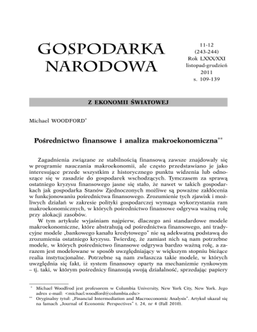 GOSPODARKA NARODOWA 11-12 (243-244) Rok LXXX/XXI listopad-grudzień 2011 s. 109-139 Z EKONOMII ŚWIATOWEJ Michael WOODFORD* Pośrednictwo finansowe i analiza makroekonomiczna** Zagadnienia związane ze stabilnością finansową zawsze znajdowały się w programie nauczania makroekonomii, ale często przedstawiano je jako interesujące przede wszystkim z historycznego punktu widzenia lub odnoszące się w zasadzie do gospodarek wschodzących. Tymczasem za sprawą ostatniego kryzysu finansowego jasne się stało, że nawet w takich gospodarkach jak gospodarka Stanów Zjednoczonych możliwe są poważne zakłócenia w funkcjonowaniu pośrednictwa finansowego. Zrozumienie tych zjawisk i możliwych działań w zakresie polityki gospodarczej wymaga wykorzystania ram makroekonomicznych, w których pośrednictwo finansowe odgrywa ważną rolę przy alokacji zasobów. W tym artykule wyjaśniam najpierw, dlaczego ani standardowe modele makroekonomiczne, które abstrahują od pośrednictwa finansowego, ani tradycyjne modele „bankowego kanału kredytowego” nie są adekwatną podstawą do zrozumienia ostatniego kryzysu. Twierdzę, że zamiast nich są nam potrzebne modele, w których pośrednictwo finansowe odgrywa bardzo ważną rolę, a zarazem jest modelowane w sposób uwzględniający w większym stopniu bieżące realia instytucjonalne. Potrzebne są nam zwłaszcza takie modele, w których uwzględnia się fakt, iż system finansowy oparty na mechanizmie rynkowym – tj. taki, w którym pośrednicy finansują swoją działalność, sprzedając papiery * ** Michael Woodfrod jest profesorem w Columbia University, New York City, New York. Jego adres e-mail: <[email protected]> Oryginalny tytuł: „Financial Intermediation and Macroeconomic Analysis”. Artykuł ukazał się na łamach „Journal of Economic Perspectives” t. 24, nr 4 (Fall 2010). 110 GOSPODARKA NARODOWA Nr 11-12/2011 wartościowe na konkurencyjnych rynkach, a nie w drodze przyjmowania depozytów objętych wymogiem rezerwy obowiązkowej – to nie to samo, co system działający bez jakichkolwiek tarć. Następnie szkicuję podstawowe elementy podejścia, które pozwalają na włączenie pośrednictwa finansowego oraz tarć na rynku kredytów do analizy makroekonomicznej w prosty sposób. Wyjaśniam, w jaki sposób można wykorzystać model do analizy makroekonomicznych następstw ostatniego kryzysu finansowego, a w części końcowej omawiam niektóre ważne z punktu widzenia prowadzenia polityki pieniężnej wnioski wypływające z modelu. Dlaczego potrzebne są nowe ramy w analizie makroekonomicznej? Warto na wstępie ustalić, dlaczego dobrze znane modele makroekonomiczne nie zawierają elementów, które potrzebne są do wyjaśnienia ostatnich wydarzeń gospodarczych. Postaram się wykazać, że trudno jest zrozumieć, dlaczego istotny spadek cen domów, który rozpoczął się w 2006 r. lub znaczne straty poniesione przez przedsiębiorstwa finansowe miałyby mieć tak poważne przełożenie na łączne zatrudnienie i poziom aktywności gospodarczej, o ile nie sięgnie się po model, w którym pośrednicy finansowi odgrywają bardzo ważną rolę, a ich zdolność do wypełniania tej funkcji może być w pewnych okresach znacznie osłabiona. Ceny domów i popyt zagregowany Choć negatywne następstwa ostatniego kryzysu finansowego były szeroko dyskutowane, niektórzy zakwestionowali tezę, że był on naprawdę pierwszoplanową przyczyną wielkiej recesji (Great Recession). Przykładowo Baker [2010] stwierdził, że znaczna redukcja popytu zagregowanego może być wytłumaczona działaniem efektu majątkowego obniżającego wydatki konsumpcyjne, a wynikającego ze spadku wartości majątku mieszkaniowego gospodarstw domowych o kilka bilionów dolarów. W jego analizie „problemem nie jest przede wszystkim kryzys finansowy”. Jak jednak zauważył Buiter [2010] spadek cen domów nie wywołuje zagregowanego efektu majątkowego, ponieważ sektor gospodarstw domowych obejmuje zarówno właścicieli zasobów mieszkaniowych, jak i konsumentów usług dostarczanych przez te zasoby. Spadek cen domów zmniejsza wartość aktywów, ale jednocześnie redukuje dokładnie o tyle samo koszty związane z zakupem strumienia usług mieszkaniowych, które planowali nabyć ludzie. Możliwe jest wystąpienie niezerowego przełożenia (spadku cen domów) na zagregowane wydatki na inne dobra (przy założeniu, że ich ceny się nie zmieniają) – i to nawet wtedy, kiedy nie występują tarcia finansowe – ze względu na redystrybucję bogactwa między gospodarstwami domowymi zajmującymi „długą” pozycję netto w zasobach mieszkaniowych, a tymi, które zajmują „krótką” pozycję netto, jeżeli przeciętne krańcowe skłonności do konsumpcji z majątku są odmienne w obu grupach. Zważywszy jednak na fakt, iż dodatnie Michael Woodford, Pośrednictwo finansowe i analiza makroekonomiczna 111 i ujemne efekty majątkowe w znacznej mierze wzajemnie się skompensują, przełożenie tych zmian na popyt zagregowany będzie najprawdopodobniej bardzo małe w porównaniu z rozmiarami zagregowanego spadku wartości zasobów mieszkaniowych. Wystąpienie większego przełożenia jest natomiast możliwe, gdy przyjmie się, że straty spowodowane załamaniem się cen domów były w nieproporcjonalnie dużym stopniu skoncentrowane w tych instytucjach finansowych, które odgrywały ważną rolę w alokacji zasobów i które nie mogą łatwo być zastąpione przez podmioty, na rzecz których dokonała się redystrybucja. Model tego rodzaju przedstawiono w zarysie poniżej. Analizę ilościową skutków spadku cen domów w Stanach Zjednoczonych, w której podkreślano znaczenie tego rodzaju efektów, przedstawili Greenlaw, Hatzius, Kashyap i Shin [2008]. Bankowość i podaż pieniądza Trudno jest także zrozumieć, dlaczego duże straty instytucji finansowych na transakcjach związanych z nieruchomościami miałyby mieć istotny wpływ na realn