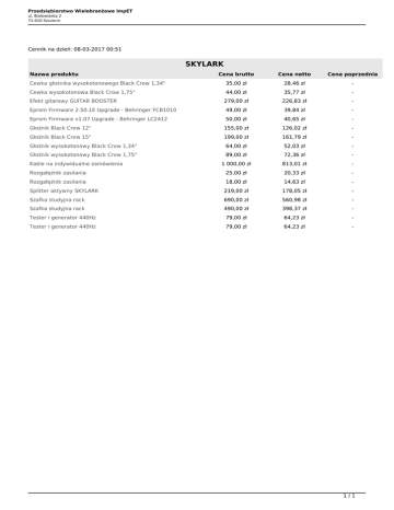 Przedsiębiorstwo Wielobranżowe ImpET ul. Białowieska 2 71-010 Szczecin Cennik na dzień: 08-03-2017 00:51 SKYLARK Nazwa produktu Cena brutto Cena netto Cena poprzednia Cewka głośnika wysokotonowego Black Crow 1,34" 35,00 zł 28,46 zł - Cewka wysokotonowa Black Crow 1,75" 44,00 zł 35,77 zł - 279,00 zł 226,83 zł - Eprom Firmware 2.50.1E Upgrade - Behringer FCB1010 49,00 zł 39,84 zł - Eprom Firmware v1.07 Upgrade - Behringer LC2412 50,00 zł 40,65 zł - Głośnik Black Crow 12" 155,00 zł 126,02 zł - Głośnik Black Crow 15" Efekt gitarowy GUITAR BOOSTER 199,00 zł 161,79 zł - Głośnik wysokotonowy Black Crow 1,34" 64,00 zł 52,03 zł - Głośnik wysokotonowy Black Crow 1,75" 89,00 zł 72,36 zł - 1 000,00 zł 813,01 zł - Rozgałęźnik zasilania 25,00 zł 20,33 zł - Rozgałęźnik zasilania 18,00 zł 14,63 zł - Splitter aktywny SKYLARK 219,00 zł 178,05 zł - Szafka studyjna rack 690,00 zł 560,98 zł - Szafka studyjna rack 490,00 zł 398,37 zł - Tester i generator 440Hz 79,00 zł 64,23 zł - Tester i generator 440Hz 79,00 zł 64,23 zł - Kable na indywidualne zamówienia 1/1 Powered by TCPDF (www.tcpdf.org)