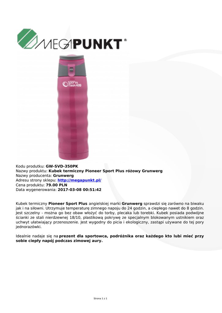 Kodu produtku: GW-SVD-350PK Nazwy produktu: Kubek termiczny Pioneer Sport Plus różowy Grunwerg Nazwy producenta: Grunwerg Adresu strony sklepu: http://megapunkt.pl/ Cena produktu: 79.00 PLN Data wygenerowania: 2017-03-08 00:51:42 Kubek termiczny Pioneer Sport Plus angielskiej marki Grunwerg sprawdzi się zarówno na biwaku jak i na siłowni. Utrzymuje temperaturę zimnego napoju do 24 godzin, a ciepłego nawet do 8 godzin. Jest szczelny - można go bez obaw włożyć do torby, plecaka lub torebki. Kubek posiada podwójne ścianki ze stali nierdzewnej 18/10, plastikową pokrywę ze specjalnym blokowanym ustnikiem oraz uchwyt ułatwiający przenoszenie. Jest wygodny do picia i ekologiczny, zastąpi używane do tej pory jednorazówki. Idealnie nadaje się na prezent dla sportowca, podróżnika oraz każdego kto lubi mieć przy sobie ciepły napój podczas zimowej aury. Strona 1 z 1