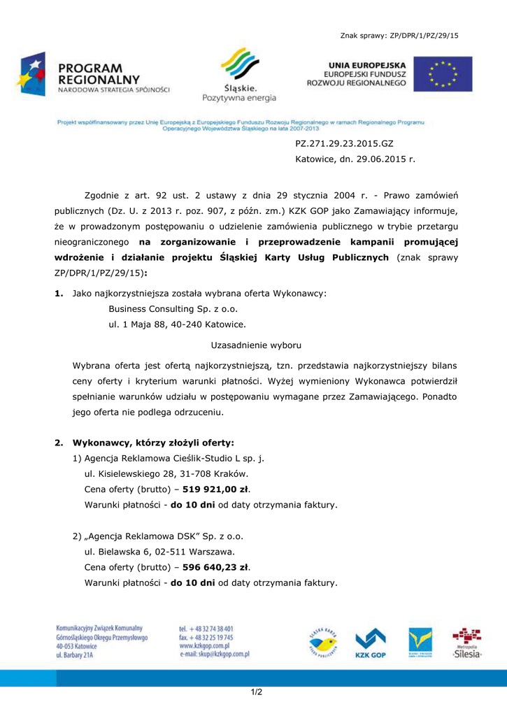 Znak sprawy: ZP/DPR/1/PZ/29/15 PZ.271.29.23.2015.GZ Katowice, dn. 29.06.2015 r. Zgodnie z art. 92 ust. 2 ustawy z dnia 29 stycznia 2004 r. - Prawo zamówień publicznych (Dz. U. z 2013 r. poz. 907, z późn. zm.) KZK GOP jako Zamawiający informuje, że w prowadzonym postępowaniu o udzielenie zamówienia publicznego w trybie przetargu nieograniczonego na zorganizowanie i przeprowadzenie kampanii promującej wdrożenie i działanie projektu Śląskiej Karty Usług Publicznych (znak sprawy ZP/DPR/1/PZ/29/15): 1. Jako najkorzystniejsza została wybrana oferta Wykonawcy: Business Consulting Sp. z o.o. ul. 1 Maja 88, 40-240 Katowice. Uzasadnienie wyboru Wybrana oferta jest ofertą najkorzystniejszą, tzn. przedstawia najkorzystniejszy bilans ceny oferty i kryterium warunki płatności. Wyżej wymieniony Wykonawca potwierdził spełnianie warunków udziału w postępowaniu wymagane przez Zamawiającego. Ponadto jego oferta nie podlega odrzuceniu. 2. Wykonawcy, którzy złożyli oferty: 1) Agencja Reklamowa Cieślik-Studio L sp. j. ul. Kisielewskiego 28, 31-708 Kraków. Cena oferty (brutto) – 519 921,00 zł. Warunki płatności - do 10 dni od daty otrzymania faktury. 2) „Agencja Reklamowa DSK” Sp. z o.o. ul. Bielawska 6, 02-511 Warszawa. Cena oferty (brutto) – 596 640,23 zł. Warunki płatności - do 10 dni od daty otrzymania faktury. 1/2 Znak sprawy: ZP/DPR/1/PZ/29/15 3) .bringMore advertising Włodzimierz Rajczyk ul. Armii Krajowej 9A, 41-506 Chorzów. Cena oferty (brutto) – 527 657,70 zł. Warunki płatności - do 10 dni od daty otrzymania faktury. 4) Business Consulting Sp. z o.o. ul. 1 Maja 88, 40-240 Katowice. Cena oferty (brutto) – 426 071,00 zł. Warunki płatności - do 10 dni od daty otrzymania faktury. 3. Punktacja przyznana ofertom w każdym kryterium oceny ofert i łączna punktacja: Punktacja w kryterium Punktacja w kryterium Wykonawca cena oferty Łączna warunki płatności 5 % punktacja 77,85 pkt 5,00 pkt 82,85 pkt 67,84 pkt 5,00 pkt 72,84 pkt 76,71 pkt 5,00 pkt 81,71 pkt 95,00 pkt 5,00 pkt 100,00 pkt 95% Agencja Reklamowa Cieślik-Studio L sp. j., Kraków „Agencja Reklamowa DSK” Sp. z o.o., Warszawa .bringMore advertising Włodzimierz Rajczyk, Chorzów Business Consulting Sp. z o.o., Katowice Przewodniczący Zarządu (-) Roman Urbańczyk 2/2