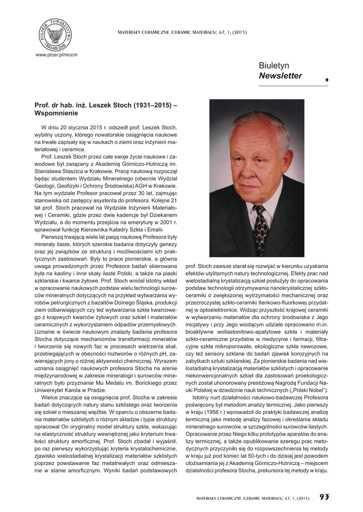 MATERIA£Y CERAMICZNE /CERAMIC MATERIALS/, 67, 1, (2015) 1984 www.ptcer.pl/mccm Biuletyn Newsletter ♦ Prof. dr hab. inż. Leszek Stoch (1931‒2015) – Wspomnienie W dniu 20 stycznia 2015 r. odszedł prof. Leszek Stoch, wybitny uczony, którego nowatorskie osiągnięcia naukowe na trwałe zapisały się w naukach o ziemi oraz inżynierii materiałowej i ceramice. Prof. Leszek Stoch przez całe swoje życie naukowe i zawodowe był związany z Akademią Górniczo-Hutniczą im. Stanisława Staszica w Krakowie. Pracę naukową rozpoczął będąc studentem Wydziału Mineralnego (obecnie Wydział Geologii, Geofizyki i Ochrony Środowiska) AGH w Krakowie. Na tym wydziale Profesor pracował przez 30 lat, zajmując stanowiska od zastępcy asystenta do profesora. Kolejne 21 lat prof. Stoch pracował na Wydziale Inżynierii Materiałowej i Ceramiki, gdzie przez dwie kadencje był Dziekanem Wydziału, a do momentu przejścia na emeryturę w 2001 r. sprawował funkcję Kierownika Katedry Szkła i Emalii. Pierwszą trwającą wiele lat pasją naukową Profesora były minerały ilaste, których szerokie badania dotyczyły genezy oraz jej związków ze strukturą i możliwościami ich praktycznych zastosowań. Były to prace pionierskie, a główna uwaga prowadzonych przez Profesora badań skierowana była na kaoliny i inne skały ilaste Polski, a także na piaski szklarskie i kwarce żyłowe. Prof. Stoch wniósł istotny wkład w opracowanie naukowych podstaw wielu technologii surowców mineralnych dotyczących na przykład wytwarzania wyrobów petrurgicznych z bazaltów Dolnego Śląska, produkcji ziem odbarwiających czy też wytwarzania szkła kwarcowego z krajowych kwarców żyłowych oraz szkieł i materiałów ceramicznych z wykorzystaniem odpadów przemysłowych. Uznanie w świecie naukowym znalazły badania profesora Stocha dotyczące mechanizmów transformacji minerałów i tworzenia się nowych faz w procesach wietrzenia skał, przebiegających w obecności roztworów o różnych pH, zawierających jony o różnej aktywności chemicznej. Wyrazem uznania osiągnięć naukowych profesora Stocha na arenie międzynarodowej w zakresie mineralogii i surowców mineralnych było przyznanie Mu Medalu im. Borickiego przez Uniwersytet Karola w Pradze. Wielce znaczące są osiągnięcia prof. Stocha w zakresie badań dotyczących natury stanu szklistego oraz tworzenia się szkieł o mieszanej więźbie. W oparciu o obszerne badania materiałów szklistych o różnym składzie i typie struktury opracował On oryginalny model struktury szkła, wskazując na elastyczność struktury wewnętrznej jako kryterium trwałości struktury amorficznej. Prof. Stoch zbadał i wyjaśnił, po raz pierwszy wykorzystując kryteria krystalochemiczne, zjawisko wielostadialnej krystalizacji materiałów szklistych poprzez powstawanie faz metatrwałych oraz odmieszanie w stanie amorficznym. Wyniki badań podstawowych prof. Stoch zawsze starał się rozwijać w kierunku uzyskania efektów utylitarnych natury technologicznej. Efekty prac nad wielostadialną krystalizacją szkieł posłużyły do opracowania podstaw technologii otrzymywania nanokrystalicznej szkłoceramiki o zwiększonej wytrzymałości mechanicznej oraz przezroczystej szkło-ceramiki tlenkowo-fluorkowej przydatnej w optoelektronice. Widząc przyszłość krajowej ceramiki w wytwarzaniu materiałów dla ochrony środowiska z Jego inicjatywy i przy Jego wiodącym udziale opracowano m.in. bioaktywne wollastonitowo-apatytowe szkła i materiały szkło-ceramiczne przydatne w medycynie i farmacji, filtracyjne szkła mikroporowate, ekologiczne szkła nawozowe, czy też sensory szklane do badań zjawisk korozyjnych na zabytkach sztuki szklarskiej. Za pionierskie badania nad wielostadialną krystalizacją materiałów szklistych i opracowanie niekonwencjonalnych szkieł dla zastosowań proekologicznych został uhonorowany prestiżową Nagrodą Fundacji Nauki Polskiej w dziedzinie nauk technicznych („Polski Nobel”). Istotny nurt działalności naukowo-badawczej Profesora poświęcony był metodom analizy termicznej. Jako pierwszy w kraju (1956 r.) wprowadził do praktyki badawczej analizę termiczną jako metodę analizy fazowej i określania składu mineralnego surowców, w szczególności surowców ilastych. Opracowanie przez Niego kilku prototypów aparatów do analizy termicznej, a także opublikowanie szeregu prac metodycznych przyczyniło się do rozpowszechnienia tej metody w kraju już pod koniec lat 50-tych i do dzisiaj jest powodem utożsamiania jej z Akademią Górniczo-Hutniczą – miejscem działalności profesora Stocha, prekursora tej metody w kraju. MATERIA£Y CERAMICZNE /CERAMIC MATERIALS/, 67, 1, (2015) 93 Efektem bogatej i różnorodnej działalności naukowej prof. Stocha jest ponad 260 publikacji, głównie w czasopismach o obiegu międzynarodowym, autorstwo i współautorstwo wielu wydawnictw książkowych, 14 patentów o zróżnicowanej tematyce, a także ponad 100 referatów wygłaszanych w kraju i zagranicą, w wielu wypadkach jako invited lecture. Na podkreślenie, jako szczególnie cenna pozycja w dorobku naukowym Profesora, zasługuje książka Minerały Ilaste wydana w 1976 r., stanowiąca stale ważne i aktualne źródło wiedzy. Równolegle z działalnością naukową prof. Stoch tworzył i stale unowocześniał proces kształcenia studentów. Jego osobę studenci kojarzyli zwykle z wykładami: Surowce Ceramiczne lub Technologia Szkła. Do innych stworzonych przez niego i wykładanych przez szereg lat przedmiotów należały m.in.: Fizykochemia procesów minerałotwórczych, Tworzywa amorficzne, Technologia surowców mineralnych, Mineralogia techniczna, Materiały w ochronie środowiska. Dla rozszerzenia zakresu kształcenia zorganizował studia doktoranckie z zakresu Mineralogia Stosowana i Gospodarka Surowcami Mineralnymi, którymi kierował w latach 1973‒1980. Jako wieloletni nauczyciel akademicki, będąc promotorem ponad 10