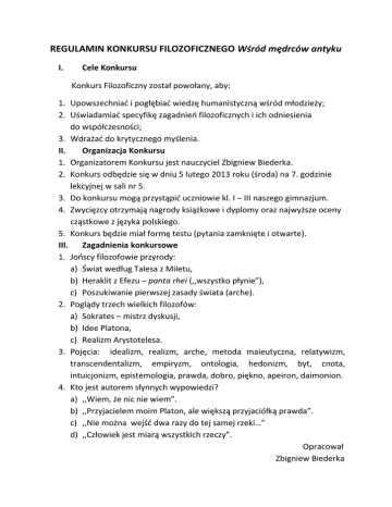 REGULAMIN KONKURSU FILOZOFICZNEGO Wśród mędrców antyku I. Cele Konkursu Konkurs Filozoficzny został powołany, aby: 1. Upowszechniać i pogłębiać wiedzę humanistyczną wśród młodzieży; 2. Uświadamiać specyfikę zagadnień filozoficznych i ich odniesienia do współczesności; 3. Wdrażać do krytycznego myślenia. II. Organizacja Konkursu 1. Organizatorem Konkursu jest nauczyciel Zbigniew Biederka. 2. Konkurs odbędzie się w dniu 5 lutego 2013 roku (środa) na 7. godzinie lekcyjnej w sali nr 5. 3. Do konkursu mogą przystąpić uczniowie kl. I – III naszego gimnazjum. 4. Zwycięzcy otrzymają nagrody książkowe i dyplomy oraz najwyższe oceny cząstkowe z języka polskiego. 5. Konkurs będzie miał formę testu (pytania zamknięte i otwarte). III. Zagadnienia konkursowe 1. Jońscy filozofowie przyrody: a) Świat według Talesa z Miletu, b) Heraklit z Efezu – panta rhei (,,wszystko płynie”), c) Poszukiwanie pierwszej zasady świata (arche). 2. Poglądy trzech wielkich filozofów: a) Sokrates – mistrz dyskusji, b) Idee Platona, c) Realizm Arystotelesa. 3. Pojęcia: idealizm, realizm, arche, metoda maieutyczna, relatywizm, transcendentalizm, empiryzm, ontologia, hedonizm, byt, cnota, intuicjonizm, epistemologia, prawda, dobro, piękno, apeiron, daimonion. 4. Kto jest autorem słynnych wypowiedzi? a) ,,Wiem, że nic nie wiem”. b) ,,Przyjacielem moim Platon, ale większą przyjaciółką prawda”. c) ,,Nie można wejść dwa razy do tej samej rzeki…” d) ,,Człowiek jest miarą wszystkich rzeczy”. Opracował Zbigniew Biederka