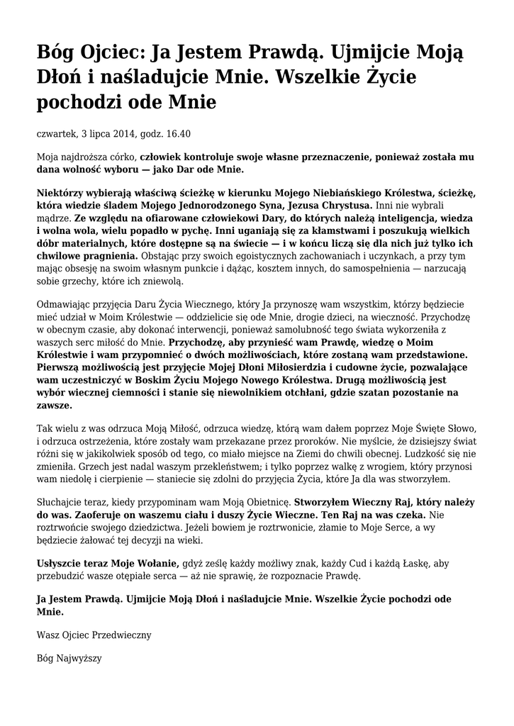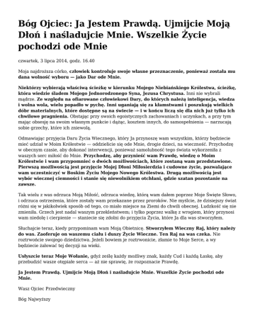 Bóg Ojciec: Ja Jestem Prawdą. Ujmijcie Moją Dłoń i naśladujcie Mnie. Wszelkie Życie pochodzi ode Mnie czwartek, 3 lipca 2014, godz. 16.40 Moja najdroższa córko, człowiek kontroluje swoje własne przeznaczenie, ponieważ została mu dana wolność wyboru — jako Dar ode Mnie. Niektórzy wybierają właściwą ścieżkę w kierunku Mojego Niebiańskiego Królestwa, ścieżkę, która wiedzie śladem Mojego Jednorodzonego Syna, Jezusa Chrystusa. Inni nie wybrali mądrze. Ze względu na ofiarowane człowiekowi Dary, do których należą inteligencja, wiedza i wolna wola, wielu popadło w pychę. Inni uganiają się za kłamstwami i poszukują wielkich dóbr materialnych, które dostępne są na świecie — i w końcu liczą się dla nich już tylko ich chwilowe pragnienia. Obstając przy swoich egoistycznych zachowaniach i uczynkach, a przy tym mając obsesję na swoim własnym punkcie i dążąc, kosztem innych, do samospełnienia — narzucają sobie grzechy, które ich zniewolą. Odmawiając przyjęcia Daru Życia Wiecznego, który Ja przynoszę wam wszystkim, którzy będziecie mieć udział w Moim Królestwie — oddzielicie się ode Mnie, drogie dzieci, na wieczność. Przychodzę w obecnym czasie, aby dokonać interwencji, ponieważ samolubność tego świata wykorzeniła z waszych serc miłość do Mnie. Przychodzę, aby przynieść wam Prawdę, wiedzę o Moim Królestwie i wam przypomnieć o dwóch możliwościach, które zostaną wam przedstawione. Pierwszą możliwością jest przyjęcie Mojej Dłoni Miłosierdzia i cudowne życie, pozwalające wam uczestniczyć w Boskim Życiu Mojego Nowego Królestwa. Drugą możliwością jest wybór wiecznej ciemności i stanie się niewolnikiem otchłani, gdzie szatan pozostanie na zawsze. Tak wielu z was odrzuca Moją Miłość, odrzuca wiedzę, którą wam dałem poprzez Moje Święte Słowo, i odrzuca ostrzeżenia, które zostały wam przekazane przez proroków. Nie myślcie, że dzisiejszy świat różni się w jakikolwiek sposób od tego, co miało miejsce na Ziemi do chwili obecnej. Ludzkość się nie zmieniła. Grzech jest nadal waszym przekleństwem; i tylko poprzez walkę z wrogiem, który przynosi wam niedolę i cierpienie — staniecie się zdolni do przyjęcia Życia, które Ja dla was stworzyłem. Słuchajcie teraz, kiedy przypominam wam Moją Obietnicę. Stworzyłem Wieczny Raj, który należy do was. Zaoferuje on waszemu ciału i duszy Życie Wieczne. Ten Raj na was czeka. Nie roztrwońcie swojego dziedzictwa. Jeżeli bowiem je roztrwonicie, złamie to Moje Serce, a wy będziecie żałować tej decyzji na wieki. Usłyszcie teraz Moje Wołanie, gdyż ześlę każdy możliwy znak, każdy Cud i każdą Łaskę, aby przebudzić wasze otępiałe serca — aż nie sprawię, że rozpoznacie Prawdę. Ja Jestem Prawdą. Ujmijcie Moją Dłoń i naśladujcie Mnie. Wszelkie Życie pochodzi ode Mnie. Wasz Ojciec Przedwieczny Bóg Najwyższy
