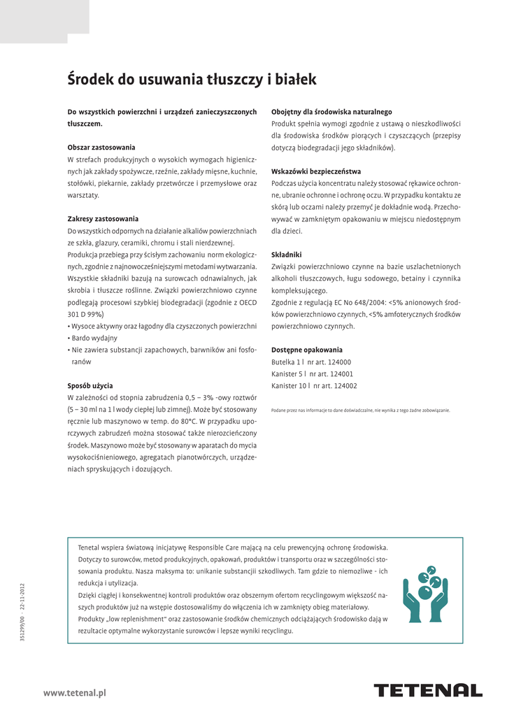 Środek do usuwania tłuszczy i białek Do wszystkich powierzchni i urządzeń zanieczyszczonych tłuszczem. Obszar zastosowania W strefach produkcyjnych o wysokich wymogach higienicznych jak zakłady spożywcze, rzeźnie, zakłady mięsne, kuchnie, stołówki, piekarnie, zakłady przetwórcze i przemysłowe oraz warsztaty. Zakresy zastosowania Do wszystkich odpornych na działanie alkaliów powierzchniach ze szkła, glazury, ceramiki, chromu i stali nierdzewnej. Produkcja przebiega przy ścisłym zachowaniu norm ekologicznych, zgodnie z najnowocześniejszymi metodami wytwarzania. Wszystkie składniki bazują na surowcach odnawialnych, jak skrobia i tłuszcze roślinne. Związki powierzchniowo czynne podlegają procesowi szybkiej biodegradacji (zgodnie z OECD 301 D 99%) • Wysoce aktywny oraz łagodny dla czyszczonych powierzchni • Bardo wydajny •N ie zawiera substancji zapachowych, barwników ani fosforanów Sposób użycia W zależności od stopnia zabrudzenia 0,5 – 3% -owy roztwór (5 – 30 ml na 1 l wody ciepłej lub zimnej). Może być stosowany ręcznie lub maszynowo w temp. do 80°C. W przypadku uporczywych zabrudzeń można stosować także nierozcieńczony środek. Maszynowo może być stosowany w aparatach do mycia wysokociśnieniowego, agregatach pianotwórczych, urządzeniach spryskujących i dozujących. Obojętny dla środowiska naturalnego Produkt spełnia wymogi zgodnie z ustawą o nieszkodliwości dla środowiska środków piorących i czyszczących (przepisy dotyczą biodegradacji jego składników). Wskazówki bezpieczeństwa Podczas użycia koncentratu należy stosować rękawice ochronne, ubranie ochronne i ochronę oczu. W przypadku kontaktu ze skórą lub oczami należy przemyć je dokładnie wodą. Przechowywać w zamkniętym opakowaniu w miejscu niedostępnym dla dzieci. Składniki Związki powierzchniowo czynne na bazie uszlachetnionych alkoholi tłuszczowych, ługu sodowego, betainy i czynnika kompleksującego. Zgodnie z regulacją EC No 648/2004: <5% anionowych środków powierzchniowo czynnych, <5% amfoterycznych środków powierzchniowo czynnych. Dostępne opakowania Butelka 1 l nr art. 124000 Kanister 5 l nr art. 124001 Kanister 10 l nr art. 124002 Podane przez nas informacje to dane doświadczalne, nie wynika z tego żadne zobowiązanie. Tenetal wspiera światową inicjatywę Responsible Care mającą na celu prewencyjną ochronę środowiska. Dotyczy to surowców, metod produkcyjnych, opakowań, produktów i transportu oraz w szczególności sto351299/00 · 22-11-2012 sowania produktu. Nasza maksyma to: unikanie substancjii szkodliwych. Tam gdzie to niemozliwe - ich redukcja i utylizacja. Dzięki ciągłej i konsekwentnej kontroli produktów oraz obszernym ofertom recyclingowym większość naszych produktów już na wstępie dostosowaliśmy do włączenia ich w zamknięty obieg materiałowy. Produkty „low replenishment“ oraz zastosowanie środków chemicznych odciążających środowisko dają w rezultacie optymalne wykorzystanie surowców i lepsze wyniki recyclingu. www.tetenal.pl