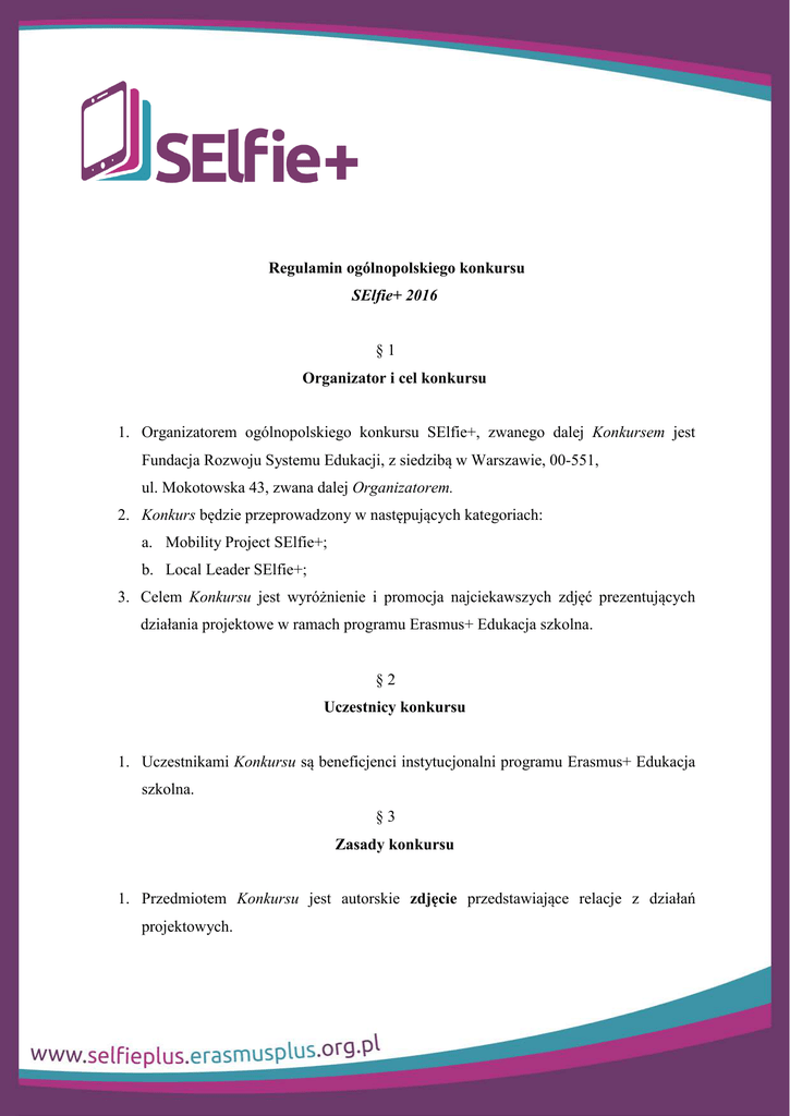 Regulamin ogólnopolskiego konkursu SElfie+ 2016 §1 Organizator i cel konkursu 1. Organizatorem ogólnopolskiego konkursu SElfie+, zwanego dalej Konkursem jest Fundacja Rozwoju Systemu Edukacji, z siedzibą w Warszawie, 00-551, ul. Mokotowska 43, zwana dalej Organizatorem. 2. Konkurs będzie przeprowadzony w następujących kategoriach: a. Mobility Project SElfie+; b. Local Leader SElfie+; 3. Celem Konkursu jest wyróżnienie i promocja najciekawszych zdjęć prezentujących działania projektowe w ramach programu Erasmus+ Edukacja szkolna. §2 Uczestnicy konkursu 1. Uczestnikami Konkursu są beneficjenci instytucjonalni programu Erasmus+ Edukacja szkolna. §3 Zasady konkursu 1. Przedmiotem Konkursu jest autorskie zdjęcie przedstawiające relacje z działań projektowych. 2. Pod pojęciem „relacja z działań projektowych” należy rozumieć: a. Zdjęcie w kategorii Mobility Project SElfie+ - fotografia obrazująca zagraniczne działania projektowe; b. Zdjęcie w kategorii Local Leader SElfie+ - fotografia obrazująca lokalne działania projektowe. 3. Uczestnik może opublikować maksymalnie jedno zdjęcie w każdej z kategorii wymienionych w §1 ust.2.pkt. a-b. 4. Zgłoszone zdjęcie musi zostać dodatkowo przypisane do kategorii Konkurs. 5. Każde opublikowane zdjęcie musi zawierać krótki opis (maksymalnie 500 znaków). 6. Zasady i techniczne wymagania dotyczące publikowania zdjęć i filmów na stronie selfieplus.erasmusplus.org.pl zawarte są w Regulaminie korzystania z platformy SElfie+. 7. Beneficjent biorący udział w Konkursie zobowiązuje się do przestrzegania zasad w zawartych w Regulaminie korzystania z platformy SElfie+. 8. Zgłoszenie do Konkursu następuje po opublikowaniu przez Uczestnika, z konta przypisanego dla danego projektu, zdjęcia na stronie internetowej selfieplus.erasmusplus.org.pl w okresie od 4 stycznia 2016 do 14 marca 2016r. §4 Ocena formalna i merytoryczna 1. Ocenę formalną zgłoszeń do Konkursu przeprowadza Organizator. 2. Ocenę merytoryczną zgłoszeń spełniających warunki formalne przeprowadzają eksperci wewnętrzni (pracownicy FRSE z zespołu programu Erasmus+ Edukacja szkolna). 3. Prace konkursowe oceniane są w dwóch kategoriach wymienionych w §1 ust.2.pkt. ab niniejszego Regulaminu według następujących kryteriów: a. Interpretacja i nawiązanie do tematu projektu; b. Adekwatność zdjęcia do kategorii konkursowej; c. Jakość wykonania, pomysłowość i atrakcyjność zdjęcia. §5 Laureaci konkursu i nagrody 1. W ramach Konkursu zostaną przyznane miejsca od I do III w każdej z kategorii Konkursu wymienionych w § 1 ust.2.pkt. a-b niniejszego Regulaminu. 2. Organizator zastrzega sobie prawo do nieprzyznawania któregokolwiek z miejsc wymienionych w ust.1, w zależności od poziomu ocenianych materiałów. 3. Dla wszystkich laureatów przewidziane są nagrody rzeczowe. 4. Nagrody przyznane w Konkursie przeznaczone są dla beneficjenta instytucjonalnego, realizującego projekt. 5. Lista laureatów Konkursu zostanie opublikowana dnia 4 kwietnia 2016r. na stronie selfieplus.erasmusplus.org.pl, a laureaci zostaną powiadomieni o tym fakcie pocztą elektroniczną. 6. Szczegółowe informacje o poszczególnych miejscach zdobytych przez laureatów Konkursu zostaną podane podczas dorocznej gali rozdania nagród SElfie+. 7. Należy pamiętać, iż zgodnie z przepisami ustawy z dnia 15 lutego 1992 r. o podatku dochodowym od osób prawnych (Dz. U. z 2014 r., poz. 851 z późn. zm.) otrzymana nagroda jest dochodem, czyli co do zasady podlega opodatkowaniu (art. 7 ust. 1 ustawy o podatku dochodowym od osób prawnych). Jednakże, jeżeli instytucja przeznaczy nagrodę na cele swojej działalności statutowej takie jak: działalność naukowa, naukowo-techniczna, oświatowa, w tym również kształcenie studentów, kulturalna, sportowa, ochrona środowiska, ochrona zdrowia i inne podobne wymienione w art. 17 ust. 1 pkt 4 uCIT, wówczas dochód w postaci nagrody podlega zwolnieniu od podatku. Ponadto informujemy, że istnieje katalog podmiotów, które są zwolnione z podatku z mocy przepisów ustawy o podatku dochodowym od osób prawnych, np. Skarb Państwa, jednostki budżetowe, jednostki samorządu terytorialnego w zakresie dochodów określonych w przepisach ustawy o dochodach jednostek samorządu terytorialnego i inne określone w art. 6 ust. 1 u CIT). §6 Postanowienia końcowe 1. Regulamin stanowi podstawę Konkursu i określa prawa i obowiązki jego uczestników. 2. Wzięcie udziału w Konkursie jest równoznaczne z wyrażeniem zgody na: a. Przetwarzanie i publikowanie przez Organizatora danych osobowych uczestników z zapisami Ustawy z dnia 29 sierpnia 1997 r. o ochronie danych osobowych (Dz. U. Nr 133, poz. 883) dla potrzeb związanych z realizacją Konkursu; b. Wykorzystywanie wizerunku w materiałach stworzonych przez FRSE do celów promocyjnych. 3. Beneficjent, który przystępuje do Konkursu, oświadcza, że wszystkie opublikowane przez niego treści na stronie internetowej Konkursu nie naruszają praw osób trzecich, w szczególności Ustawy z dnia 4 lutego 1994 r. o prawie autorskim i prawach pokrewnych (Dz. U. z 2006 r. Nr 90, poz. 631 z późn. zm.) oraz dóbr osobistych. 4. Beneficjent publikuje na stronie Konkursu utwory, do których przysługują mu autorskie prawa majątkowe. Beneficjent udostępnia Organizatorowi wskazane wyżej utwory na licencji CC Uznanie Autorstwa. 5. Beneficjent przystępując do konkursu, musi posiadać: a. W przypadku opublikowania na stronie internetowej konkursu zdjęć lub filmów, na których występują osoby trzecie, zgodę tych osób na wykorzystanie ich wizerunku na potrzeby Konkursu organizowanego w ramach Platformy SElfie+ oraz w materiałach promocyjnych, przygotowanych przez FRSE (wzór znajduje się w Załączniku nr 1); b. W przypadku, gdy na zdjęciach lub filmach znajduje się osoba niepełnoletnia, zgodę jej rodziców lub opiekunów prawnych na rozpowszechnianie wizerunku te