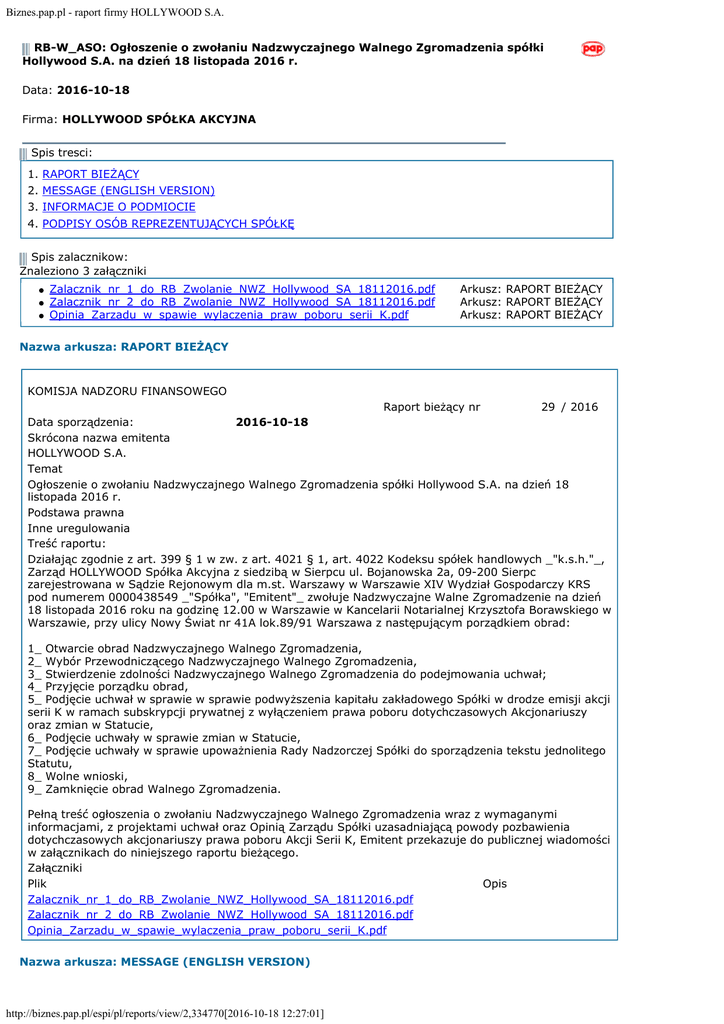 Biznes.pap.pl - raport firmy HOLLYWOOD S.A. RB-W_ASO: Ogłoszenie o zwołaniu Nadzwyczajnego Walnego Zgromadzenia spółki Hollywood S.A. na dzień 18 listopada 2016 r. Data: 2016-10-18 Firma: HOLLYWOOD SPÓŁKA AKCYJNA Spis tresci: 1. 2. 3. 4. RAPORT BIEŻĄCY MESSAGE (ENGLISH VERSION) INFORMACJE O PODMIOCIE PODPISY OSÓB REPREZENTUJĄCYCH SPÓŁKĘ Spis zalacznikow: Znaleziono 3 załączniki Zalacznik_nr_1_do_RB_Zwolanie_NWZ_Hollywood_SA_18112016.pdf Zalacznik_nr_2_do_RB_Zwolanie_NWZ_Hollywood_SA_18112016.pdf Opinia_Zarzadu_w_spawie_wylaczenia_praw_poboru_serii_K.pdf Arkusz: RAPORT BIEŻĄCY Arkusz: RAPORT BIEŻĄCY Arkusz: RAPORT BIEŻĄCY Nazwa arkusza: RAPORT BIEŻĄCY KOMISJA NADZORU FINANSOWEGO Raport bieżący nr 29 / 2016 Data sporządzenia: 2016-10-18 Skrócona nazwa emitenta HOLLYWOOD S.A. Temat Ogłoszenie o zwołaniu Nadzwyczajnego Walnego Zgromadzenia spółki Hollywood S.A. na dzień 18 listopada 2016 r. Podstawa prawna Inne uregulowania Treść raportu: Działając zgodnie z art. 399 § 1 w zw. z art. 4021 § 1, art. 4022 Kodeksu spółek handlowych _"k.s.h."_, Zarząd HOLLYWOOD Spółka Akcyjna z siedzibą w Sierpcu ul. Bojanowska 2a, 09-200 Sierpc zarejestrowana w Sądzie Rejonowym dla m.st. Warszawy w Warszawie XIV Wydział Gospodarczy KRS pod numerem 0000438549 _"Spółka", "Emitent"_ zwołuje Nadzwyczajne Walne Zgromadzenie na dzień 18 listopada 2016 roku na godzinę 12.00 w Warszawie w Kancelarii Notarialnej Krzysztofa Borawskiego w Warszawie, przy ulicy Nowy Świat nr 41A lok.89/91 Warszawa z następującym porządkiem obrad: 1_Otwarcie obrad Nadzwyczajnego Walnego Zgromadzenia, 2_Wybór Przewodniczącego Nadzwyczajnego Walnego Zgromadzenia, 3_Stwierdzenie zdolności Nadzwyczajnego Walnego Zgromadzenia do podejmowania uchwał; 4_Przyjęcie porządku obrad, 5_Podjęcie uchwał w sprawie w sprawie podwyższenia kapitału zakładowego Spółki w drodze emisji akcji serii K w ramach subskrypcji prywatnej z wyłączeniem prawa poboru dotychczasowych Akcjonariuszy oraz zmian w Statucie, 6_Podjęcie uchwały w sprawie zmian w Statucie, 7_Podjęcie uchwały w sprawie upoważnienia Rady Nadzorczej Spółki do sporządzenia tekstu jednolitego Statutu, 8_Wolne wnioski, 9_Zamknięcie obrad Walnego Zgromadzenia. Pełną treść ogłoszenia o zwołaniu Nadzwyczajnego Walnego Zgromadzenia wraz z wymaganymi informacjami, z projektami uchwał oraz Opinią Zarządu Spółki uzasadniającą powody pozbawienia dotychczasowych akcjonariuszy prawa poboru Akcji Serii K, Emitent przekazuje do publicznej wiadomości w załącznikach do niniejszego raportu bieżącego. Załączniki Plik Opis Zalacznik_nr_1_do_RB_Zwolanie_NWZ_Hollywood_SA_18112016.pdf Zalacznik_nr_2_do_RB_Zwolanie_NWZ_Hollywood_SA_18112016.pdf Opinia_Zarzadu_w_spawie_wylaczenia_praw_poboru_serii_K.pdf Nazwa arkusza: MESSAGE (ENGLISH VERSION) http://biznes.pap.pl/espi/pl/reports/view/2,334770[2016-10-18 12:27:01] Biznes.pap.pl - raport firmy HOLLYWOOD S.A. MESSAGE _ENGLISH VERSION_ Nazwa arkusza: INFORMACJE O PODMIOCIE HOLLYWOOD SPÓŁKA AKCYJNA _pełna nazwa emitenta_ HOLLYWOOD S.A. _skrócona nazwa emitenta_ 09-200 _kod pocztowy_ Bojanowska _ulica_ +48 24 275 81 29 _telefon_ _e-mail_ 7761698650 _NIP_ Usługi inne _uin_ _sektor wg. klasyfikacji GPW w W-wie_ Sierpc _miejscowość_ 2a _numer_ +48 24 275 81 29 _fax_ _www_ 146351367 _REGON_ Nazwa arkusza: PODPISY OSÓB REPREZENTUJĄCYCH SPÓŁKĘ PODPISY OSÓB REPREZENTUJĄCYCH SPÓŁKĘ Data Imię i Nazwisko 2016-10-18 Adam Andrzej Konieczkowski Identyfikator raportu Nazwa raportu Symbol raportu Nazwa emitenta Symbol Emitenta Tytul Sektor Kod Miasto Ulica Nr Tel. Fax e-mail NIP REGON Data sporzadzenia Rok biezacy Numer adres www Stanowisko/Funkcja Prezes Zarządu Podpis ct9oscrwj1 RB-W_ASO RB-W_ASO HOLLYWOOD SPÓŁKA AKCYJNA HOLLYWOOD S.A. Ogłoszenie o zwołaniu Nadzwyczajnego Walnego Zgromadzenia spółki Hollywood S.A. na dzień 18 listopada 2016 r. Usługi inne (uin) 09-200 Sierpc Bojanowska 2a +48 24 275 81 29 +48 24 275 81 29 7761698650 146351367 2016-10-18 2016 29 Serwis Ekonomiczny Polskiej Agencji Prasowej SA http://biznes.pap.pl/espi/pl/reports/view/2,334770[2016-10-18 12:27:01] 2016 Copyright PAP SA - Wszelkie prawa zastrzezone.