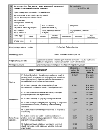 W y p e ł n i a Nazwa przedmiotu: Rola rozumu i uczuć w procesach poznawczych związanych z wydawaniem sądów moralnych Kod przedmiotu: 08.9I43AI04_41 Wykład monograficzny z modułu „Człowiek i kultura” Nazwa jednostki prowadzącej przedmiot / moduł: Wydział Humanistyczny, Instytut Filozofii Nazwa kierunku: Kognitywistyka komunikacji Z Forma studiów: e stacjonarne, pierwszego stopnia s p Rok / semestr: ó Rok 2, semestr 4 ł Forma zajęć wykład K i e Wymiar zajęć 30 r u n Koordynator przedmiotu / modułu k u Profil kształcenia: ogólnoakademicki (A) Specjalność: Status przedmiotu /modułu: do wyboru Język przedmiotu / modułu: polski ćwiczenia ćwiczenia laboratoryjne konwersatorium seminarium inne (wpisać jakie) - - - - - Prof. dr hab. Tadeusz Szubka Dr hab. Mirosław Rutkowski prof. US Prowadzący zajęcia Cel przedmiotu / modułu Zapoznanie studentów z historią sporu na temat roli rozumu i uczuć w wydawaniu sądów moralnych oraz z najnowszym stanem badań w tym temacie. Wymagania wstępne Znajomość podstawowych pojęć filozoficznych i kognitywistycznych. Odniesienie do efektów dla programu Odniesienie do efektów dla obszaru 01 Student identyfikuje i charakteryzuje poglądy na temat roli rozumu i uczuć w moralnym ocenianiu, dostrzega wewnętrzne trudności omawianych stanowisk, potrafi zrekonstruować ich uzasadnienia i zna ich najnowsze interpretacje. K_W02 H1A_W03 S1A_W05 02 Student rozpoznaje i charakteryzuje filozoficzne uwarunkowania problemów i koncepcji kognitywistycznych. K_W11 H1A_W03 H1A_W09 H1A_W10 03 Student samodzielnie definiuje cele swojego rozwoju i planuje indywidualną ścieżkę kształcenia. K_U02 H1A_U02 H1A_U03 04 Student rozpoznaje motywy kognitywistyczne w etyce K_U06 H1A_U05 05 Student analizuje i poddaje krytyce argumenty za lub przeciw omawianym stanowiskom, identyfikuje ich kluczowe tezy i założenia. K_U10 H1A_U06 H1A_U07 06 Student ma świadomość odpowiedzialności za swój rozwój intelektualny. K_K01 H1A_K01 07 Student docenia rolę wiedzy i wrażliwości etycznej w praktyce badawczej oraz życiu społecznym, ma świadomość zagrożeń wynikających z jej braku. K_K07 K_K10 H1A_K04 H1A_K05 H1A_K06 08 Student zachowuje ostrożność w wyrażaniu opinii, jest otwarty na rewizję swoich przekonań w świetle dostępnej argumentacji. K_K02 H1A_K04 H1A_K05 H1A_K05 EFEKTY KSZTAŁCENIA Wiedza Umiejętności Kompetencje społeczne K_K08 TREŚCI PROGRAMOWE Liczba godzin Wykład 30 1. Racjonalizm etyczny w angielskiej filozofii moralnej okresu Oświecenia: Ralph Cudworth, Samuel Clarke, William Wollaston. 4 2. Początki sentymentalizmu: Anthony Shaftesbury, Joseph Butler, Francis Hutcheson. 4 3. Psychologia moralna Davida Hume’a. 4 4. Racjonalizm etyczny Immanuela Kanta. 4 5. Spór o logiczny status sądów moralnych: kognitywizm i nonkognitywizm. 4 6. Sposoby poznawania wartości moralnych w perspektywie metaetycznej: intuicjonizm, realizm, ekspresywizm. 6 7. Podejmowanie decyzji moralnych z punktu widzenia współczesnej neurobiologii. 4 Metody kształcenia Metody weryfikacji efektów kształcenia Wykład historyczny, przeglądowy i analityczny, prezentacja multimedialna. Nr efektu kształcenia z sylabusa Sprawdzian ustny Wybór przedmiotu przez studenta Czynne uczestnictwo w wykładach 01, 02, 04, 05, 07, 08 03, 06 03, 06 Forma i warunki zaliczenia Zaliczenie na ocenę z treści wykładu i literatury podstawowej. Literatura podstawowa 1. D. Hume, Traktat o naturze ludzkiej, Warszawa 1963. 2. I. Kant, Uzasadnienie metafizyki moralności, Warszawa 1984. 3. M. Ossowska, Myśl moralna oświecenia angielskiego, Warszawa 1966. 4. M. Rutkowski, Rola rozumu w decyzjach moralnych. Etyka Davida Hume’a, Wrocław 2001. 5. J. Green, Emocje i procesy poznawcze zaangażowane w wydawanie sądów moralnych. Dane z neuroobrazowania, Studia z Kognitywistyki i Filozofii Umysłu 2012, t. 6. Literatura uzupełniająca 1. R.B. Brandt, Etyka. Zagadnienia etyki normatywnej i metaetyki, Warszawa 1996. 2. A. MacIntyre, Dziedzictwo cnoty. Studium z teorii moralności, Warszawa 1996. 3 M. Ossowska, Podstawy nauki o moralności, Wrocław 1994, cz. I. 4. P. Singer (red.), Przewodnik po etyce, Warszawa 1993. 5. M. Weiss, Umysł moralny a namysł etyczny: między neurotyką a tradycyjną filozofią moralności, Studia z Kognitywistyki i Filozofii Umysłu 2012, t. 6. NAKŁAD PRACY STUDENTA: Liczba godzin Zajęcia dydaktyczne 30 Przygotowanie się do zajęć — Studiowanie literatury 16 Udział w konsultacjach 10 Udział w egzaminie / zaliczeniu 4 Przygotowanie projektu / eseju / itp. — Przygotowanie się do egzaminu / zaliczenia 15 Inne (np. udział w warsztatach przedmiotowych, prezentacja wyników projektu itp.) — ŁĄCZNY nakład pracy studenta w godz. 75 Liczba godzin wymagających bezpośredniego kontaktu z prowadzącym zajęcia: 44 Liczba punktów ECTS 3