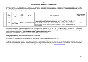 W Y K A Z NIERUCHOMOŚCI PRZEZNACZONYCH DO DZIERŻAWY Działając na podstawie art. 23 ust. 1 pkt 7a w związku z art. 35 ust. 1 i 2 ustawy z dnia 21 sierpnia 1997 r. o gospodarce nieruchomościami (Dz. U. z 2014 r., poz. 518, z późn. zm.), Starosta Radomszczański, wykonujący zadania z zakresu administracji rządowej informuje, że przeznaczył w drodze bezprzetargowej do dzierżawy nieruchomość rolną, położoną w gminie Żytno w obrębie Czechowiec. Nr działki ewid. L.p 1. 643 Nr obrębu ewid. 0007 Czechowiec Pow. działki w ha 0,31 ha Nr KW Opis nieruchomości Nieruchomość rolna, położona w miejscowości Czechowiec w gminie Żytno. Zgodnie z zapisem w ewidencji gruntów użytki stanową Ps V – 0,12 ha, R IVb – 0,07 ha, RV– PT1R/00090393/5 0,12ha. Działka znajduje się w terenie użytków rolnych przy drodze gruntowej. Nieruchomość nie jest objęta aktualnym miejscowym planem zagospodarowania przestrzennego. Oplata roczna w zł z tytułu dzierżawy 150 zł Osoby, którym przysługuje pierwszeństwo w nabyciu ww. nieruchomości na podstawie art. 34 ust. 1 pkt 1 i 2 ustawy z dnia 21 sierpnia 1997 r. o gospodarce nieruchomościami ( Dz. U. z 2014 r., poz. 518, z późn. zm.), mogą składać do Starosty Radomszczańskiego ( na adres 97-500 Radomsko, ul. Leszka Czarnego 22) wnioski o nabycie nieruchomości, w terminie 6 tygodni od dnia wywieszenia niniejszego wykazu. Przeznaczenie nieruchomości: Brak miejscowego planu zagospodarowania przestrzennego. Sposób zagospodarowania: Nieruchomość gruntowa rolna – użytki rolne. Forma dzierżawy: Nieruchomość ozn. nr działki 643 w obrębie Czechowiec - dzierżawa w trybie bezprzetargowym na okres do 3 lat. Szczegółowe informacje można uzyskać w Starostwie Powiatowym w Radomsku (97-500 Radomsko, ul. Leszka Czarnego 22) w Wydziale Geodezji – pok. 212 lub telefonicznie pod numerem 44 6858942. Informacja o wywieszeniu wykazu podana została do publicznej wiadomości przez ogłoszenie w prasie lokalnej oraz w drodze umieszczenia na tablicy ogłoszeń i stronie internetowej Starostwa Powiatowego w Radomsku – www.radomszczanski.pl . str. 1