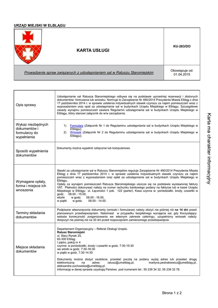 URZĄD MIEJSKI W ELBLĄGU KARTA USŁUGI Prowadzenie spraw związanych z udostępnianiem sal w Ratuszu Staromiejskim Opis sprawy Wykaz niezbędnych dokumentów i formularzy do wypełnienia Sposób wypełnienia dokumentów KU-283/DO Obowiązuje od: 01.04.2015 Udostępnianie sal Ratusza Staromiejskiego odbywa się na podstawie uprzedniej rezerwacji i złożonych dokumentów: formularza lub wniosku. Normuje to Zarządzenie Nr 490/2014 Prezydenta Miasta Elbląg z dnia 17 października 2014 r. w sprawie ustalenia indywidualnych stawek czynszu za najem pomieszczeń wraz z wyposażeniem oraz opat za udostępnianie sal w budynkach Urzędu Miejskiego w Elblągu. Szczegółowe zasady wynajmu pomieszczeń zawiera Regulamin udostępniania sal w budynkach Urzędu Miejskiego w Elblągu, który stanowi załącznik do w/w zarządzenia. 1) 2) Formularz (Załącznik Nr 1 do Regulaminu udostępniania sal w budynkach Urzędu Miejskiego w Elblągu); Wniosek (Załącznik Nr 2 do Regulaminu udostępniania sal w budynkach Urzędu Miejskiego w Elblągu); Dokumenty można wypełnić odręcznie lub komputerowo. Wymagane opłaty, forma i miejsce ich wnoszenia Stawki za udostępnianie sal w Ratuszu Staromiejskim reguluje Zarządzenie Nr 490/2014 Prezydenta Miasta Elbląg z dnia 17 października 2014 r. w sprawie ustalenia indywidualnych stawek czynszu za najem pomieszczeń wraz z wyposażeniem oraz opłat za udostępnianie sal w budynkach Urzędu Miejskiego w Elblągu. Opłaty za wynajem pomieszczeń Ratusza Staromiejskiego uiszcza się na podstawie wystawionej faktury VAT. Płatności dokonywać należy na numer rachunku bankowego podany na fakturze lub w kasie Urzędu Miejskiego w Elblągu ul. Łączności 1 pok. 122 (parter). Kasa czynna w: poniedziałki, środy, czwartki w godz. 08.00 - 15.00, wtorki w godz. 08.00 - 16.00, w piątki w godz. 08.00 - 14.00. Terminy składania dokumentów Podpisane własnoręcznie dokumenty (wnioski i formularze) należy złożyć nie później niż na 14 dni przed planowanym przedsięwzięciem. Natomiast w przypadku bezpłatnego wynajęcia sal, gdy Korzystający wskaże konieczność zorganizowania we własnym zakresie cateringu, uzupełniony wniosek należy doręczyć nie później niż na 30 dni przed rozpoczęciem zamierzonego przedsięwzięcia. Miejsce składania dokumentów Departament Organizacyjny – Referat Obsługi Urzędu Ratusz Staromiejski ul. Stary Rynek 25, 82-300 Elbląg I piętro, pokój nr 4 czynne: w poniedziałki, środy i czwartki w godz. 7:30-15:30 we wtorki w godz. 7:30-16:30 w piątki w godz. 7:30-14:30 Dokumenty można złożyć osobiście, przesłać pocztą na podany wyżej adres lub przesłać drogą elektroniczną na adres: [email protected], [email protected], [email protected]. Informację w danej sprawie uzyskają Państwo pod numerami tel.: 55 239 34 32, 55 239 32 78. Strona 1 z 2 Sposób i termin załatwienia Odpowiedź w sprawie odbywa się bez zbędnej zwłoki w formie pisemnej lub za pośrednictwem poczty elektronicznej. Tryb odwoławczy Nie dotyczy Informacje dodatkowe Przed złożeniem dokumentu klient może skontaktować się osobiście, telefonicznie lub drogą elektroniczną z pracownikiem Departamentu Organizacyjnego – Referatu Obsługi Urzędu w Ratuszu Staromiejskim w celu otrzymania szczegółowych informacji dotyczących rezerwacji sal (wolnych terminów). Podstawa prawna Zarządzenie Nr 490/2014 Prezydenta Miasta Elbląg z dnia 17 października 2014 r. w sprawie ustalenia indywidualnych stawek czynszu za najem pomieszczeń wraz z wyposażeniem oraz opłat za udostępnianie sal w budynkach Urzędu Miejskiego w Elblągu. Strona 2 z 2