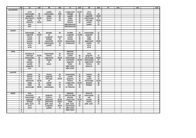 poniedziałek wtorek środa czwartek piątek lek. 0 1 2 3 4 5 6 7 8 9 0 1 2 3 4 5 6 7 8 9 0 1 2 3 4 5 6 7 8 9 0 1 2 3 4 5 6 7 8 9 0 1 2 3 4 5 6 7 8 9 1a wf ch matematyka geografia ang I/niem II j.polski niemI/inf kosz kosz matematyka angI/infII chemia j.polski muzyka historia wf dz wf dz sala 26 15 23/33 13 33/25 26 23/25 32 13 38 28 wf dz/bas ch infI/angII matematyka religia plastyka j.polski geografia kosz 25/24 26 16 38 13 15 j.polski historia chemia infI/niemII religia fizyka niemI/angII 13 26 32 25/33 16 34 33/24 kosz ba dz/kosz matematyka angI/angII biologia godz. wych. wf ch wf ch 24 23/24 22 32 1b sala 1c sala 1d sala j.polski matematyka religia chemia fizyka 13 0:00 16 32 34 j.ang/j.niem biologia j.polski religia chemia historia piłka/pływanie piłka/pływanie 21/31 22 36 16 32 26 wf ch chemia angI/infII matematyka infI/angII j.polski j.polski 32 24/25 27 25/24 13 13 plastyka wf j.angielski biologia niemI/infII matematyka j.polski 38 inf piłka j.angielski j.polski muzyka matematyka inf pływanie 25 21/38 36 38 27 25 matematyka geografia fizyka religia angI/niemII j.polski wf dz wf dz pływanie pływanie j.polski matematyka j.niemiecki geografia fizyka piłka nożna piłka nożna 36 27 31/33 15 34 matematyka j.polski geografia historia j.ang/j.niem chemia inf. Pływanie 27 36 15 28 21/31 32 25 21/23 22 31/25 14 13 matematyka historia angI/niemII muzyka wf basen 14 37 23/33 38 chemia geografia infI/angII wf j.polski religia matematyka 32 15 25/24 geografia historia infI/niemII infII/niemI godz. wych j.angielski j.polski 15 37 25/33 25/31 37 23/24 13 13 16 14 pływanie pływ/inf piłka plastyka j.ang/j.niem religia godz. wych. matematyka piłka nożna piłka nożna /25 38 21/31 16 21 27 27 15 34 16 24/33 13 wf dz geografia niemI/angII matematyka angI/niemII historia basen ch 15 31/24 27 24/31 28 historia religia j.polski niemI/angII plastyka biologia 28 16 13 31/24 38 22 basen dz matematyka wdż muzyka chemia godz. wych. 27 22 38 32 21 1e sala sala sala