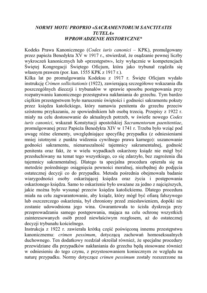 NORMY MOTU PROPRIO «SACRAMENTORUM SANCTITATIS TUTELA» WPROWADZENIE HISTORYCZNE* Kodeks Prawa Kanonicznego (Codex iuris canonici – KPK), promulgowany przez papieża Benedykta XV w 1917 r., stwierdzał, że osądzanie pewnej liczby wykroczeń kanonicznych lub «przestępstw», leży wyłącznie w kompetencjach Świętej Kongregacji Świętego Oficjum, która jako trybunał rządziła się własnym prawem (por. kan. 1555 KPK z 1917 r.). Kilka lat po promulgowaniu Kodeksu z 1917 r. Święte Oficjum wydało instrukcję Crimen sollicitationis (1922), zawierającą szczegółowe wskazania dla poszczególnych diecezji i trybunałów w sprawie sposobu postępowania przy rozpatrywaniu kanonicznego przestępstwa nakłaniania do grzechu. Tym bardzo ciężkim przestępstwem było naruszenie świętości i godności sakramentu pokuty przez księdza katolickiego, który namawia penitenta do grzechu przeciw szóstemu przykazaniu, ze spowiednikiem lub osobą trzecią. Przepisy z 1922 r. miały na celu dostosowanie do aktualnych potrzeb, w świetle nowego Codex iuris canonici, wskazań Konstytucji apostolskiej Sacramentorum paenitentiae, promulgowanej przez Papieża Benedykta XIV w 1741 r. Trzeba było wziąć pod uwagę różne elementy, uwzględniające specyfikę przypadku (z odniesieniami mniej istotnymi z punktu widzenia cywilnego prawa karnego): uszanowanie godności sakramentu, nienaruszalność tajemnicy sakramentalnej, godność penitenta oraz fakt, że w wielu wypadkach oskarżony ksiądz nie mógł być przesłuchiwany na temat tego wszystkiego, co się zdarzyło, bez zagrożenia dla tajemnicy sakramentalnej. Dlatego ta specjalna procedura opierała się na metodzie pośredniego osiągnięcia pewności moralnej, niezbędnej do podjęcia ostatecznej decyzji co do przypadku. Metoda pośrednia obejmowała badanie wiarygodności osoby oskarżającej księdza oraz życia i postępowania oskarżonego księdza. Samo to oskarżenie było uważane za jedno z najcięższych, jakie można było wysunąć przeciw księdzu katolickiemu. Dlatego procedura miała na celu zagwarantowanie, aby ksiądz, który mógł być ofiarą fałszywego lub oszczerczego oskarżenia, był chroniony przed zniesławieniem, dopóki nie zostanie udowodniona jego wina. Gwarantowała to ścisła dyskrecja przy przeprowadzaniu samego postępowania, mająca na celu ochronę wszystkich zainteresowanych osób przed niewłaściwym rozgłosem, aż do ostatecznej decyzji trybunału kościelnego. Instrukcja z 1922 r. zawierała krótką część poświęconą innemu przestępstwu kanonicznemu: crimen pessimum, dotyczącą zachowań homoseksualnych duchownego. Ten dodatkowy rozdział określał również, że specjalne procedury przewidziane dla przypadków nakłaniania do grzechu będą stosowane również w odniesieniu do tego czynu, z przystosowaniem koniecznym ze względu na naturę przypadku. Normy dotyczące crimen pessimum zostały rozszerzone na odrażające przestępstwo wykorzystywania seksualnego dzieci przed okresem dojrzewania oraz bestialitas. Celem instrukcji Crimen sollicitationis nie było zatem przedstawienie całego sposobu postępowania Kościoła katolickiego w odniesieniu do niewłaściwych zachowań seksualnych duchowieństwa, a jedynie ustalenie procedury pozwalającej zaradzić całkowicie wyjątkowej i szczególnie delikatnej sytuacji, jaką jest spowiedź, w której całkowitemu otwarciu wnętrza duszy ze strony penitenta odpowiada, z prawa Bożego, obowiązek absolutnej dyskrecji ze strony kapłana. Jedynie stopniowo i przez analogię została ona rozszerzona na niektóre przypadki niemoralnego postępowania kapłanów. Stosunkowo niedawno zrodziła się myśl, że potrzebne są podstawowe przepisy dotyczące zachowań seksualnych osób odpowiedzialnych za wychowanie, dlatego jest poważnym anachronizmem chęć osądzania w tej perspektywie normatywnych tekstów kanonicznych, pochodzących w znacznej części z ubiegłego wieku. Instrukcja z 1922 r. została wysłana do biskupów, którzy mieli się zajmować szczególnymi przypadkami dotyczącymi nakłaniania do grzechu, homoseksualności duchownego, wykorzystywania seksualnego dzieci i bestialitas. W 1962 r. papież Jan XXIII zezwolił na przedruk instrukcji z 1922 r. z krótkim dodatkiem na temat procedur administracyjnych w przypadkach dotyczących duchownych zakonnych. Egzemplarze przedruku z 1962 r. miały być rozpowszechnione wśród biskupów zgromadzonych na Soborze Watykańskim II (1962-1965). Pewna liczba egzemplarzy przedruku została przekazana biskupom, którzy w międzyczasie byli zmuszeni zajmować się przypadkami leżącymi w kompetencjach Świętego Oficjum; jednakże większość egzemplarzy nie została nigdy rozprowadzona. Zmiany proponowane przez Sobór Watykański II obejmowały również reformę Codex iuris canonici z 1917 r. oraz Kurii Rzymskiej. W okresie między r. 1965 i 1983 (rokiem, w którym został promulgowany nowy Codex iuris canonici dla Kościoła łacińskiego) występowały różne tendencje wśród ekspertów prawa kanonicznego w odniesieniu do celów kanonicznego prawa karnego oraz potrzeby zdecentralizowanego traktowania przypadków, z uwzględnieniem w większym stopniu władzy i rozeznania biskupów lokalnych. Preferowano «podejście duszpasterskie» w odniesieniu do niewłaściwych zachowań; niektórzy uważali procesy kanoniczne za anachroniczne. Często brał górę «model terapeutyczny» w podejściu do przypadków nieodpowiednich zachowań osób duchownych. Oczekiwano, że biskup będzie w stanie raczej «uzdrawiać» niż «karać»). Zbyt optymistyczne przekonanie o dobrodziejstwach terapii psychologicznych warunkowało wiele decyzji dotyczących personelu diecezji i instytutów zakonnych, czasem bez należytego brania pod uwagę możliwości recydywy. W każdym razie po Soborze sprawy dotyczące godności sakramentu pokuty pozostały w gestii Kongregacji Nauki Wiary (poprzednio Świętego Oficjum; nazw