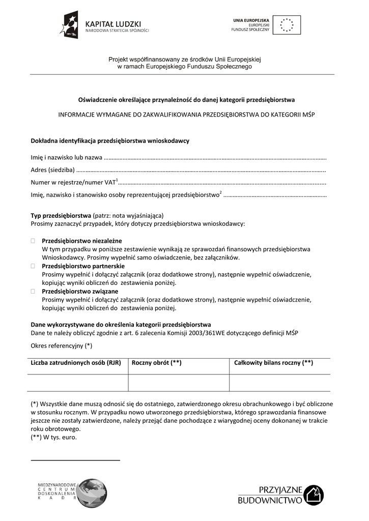 Oświadczenie określające przynależność do danej kategorii przedsiębiorstwa INFORMACJE WYMAGANE DO ZAKWALIFIKOWANIA PRZEDSIĘBIORSTWA DO KATEGORII MŚP Dokładna identyfikacja przedsiębiorstwa wnioskodawcy Imię i nazwisko lub nazwa ……………………………………………………………………………………………………………………………. Adres (siedziba) …………………………………………………………………………………………………………………………………………... Numer w rejestrze/numer VAT1…………………………………………………………………………………………………….………........ Imię, nazwisko i stanowisko osoby reprezentującej przedsiębiorstwo2 ………………………………………………………… Typ przedsiębiorstwa (patrz: nota wyjaśniająca) Prosimy zaznaczyć przypadek, który dotyczy przedsiębiorstwa wnioskodawcy: Przedsiębiorstwo niezależne W tym przypadku w poniższe zestawienie wynikają ze sprawozdań finansowych przedsiębiorstwa Wnioskodawcy. Prosimy wypełnić samo oświadczenie, bez załączników. Przedsiębiorstwo partnerskie Prosimy wypełnić i dołączyć załącznik (oraz dodatkowe strony), następnie wypełnić oświadczenie, kopiując wyniki obliczeń do zestawienia poniżej. Przedsiębiorstwo związane Prosimy wypełnić i dołączyć załącznik (oraz dodatkowe strony), następnie wypełnić oświadczenie, kopiując wyniki obliczeń do zestawienia poniżej. Dane wykorzystywane do określenia kategorii przedsiębiorstwa Dane te należy obliczyć zgodnie z art. 6 zalecenia Komisji 2003/361WE dotyczącego definicji MŚP Okres referencyjny (*) Liczba zatrudnionych osób (RJR) Roczny obrót (**) Całkowity bilans roczny (**) (*) Wszystkie dane muszą odnosić się do ostatniego, zatwierdzonego okresu obrachunkowego i być obliczone w stosunku rocznym. W przypadku nowo utworzonego przedsiębiorstwa, którego sprawozdania finansowe jeszcze nie zostały zatwierdzone, należy przejąć dane pochodzące z wiarygodnej oceny dokonanej w trakcie roku obrotowego. (**) W tys. euro. Uwaga W porównaniu z poprzednim okresem obrachunkowym nastąpiła zmiana danych, która może spowodować zmianę kategorii przedsiębiorstwa wnioskodawcy (mikro, małe, średnie lub duże przedsiębiorstwo). Nie Tak (w tym przypadku prosimy wypełnić i dołączyć oświadczenie dotyczące poprzedniego okresu obrachunkowego)3 Podpis Nazwisko i stanowisko osoby podpisującej, upoważnionej do reprezentowania przedsiębiorstwa: ……………………………………………………………………………………………………………………………………………………………………… Oświadczam, że dane zawarte w niniejszym oświadczeniu i załącznikach do niego są zgodne ze stanem faktycznym. Sporządzono w ………………………………………………………………………………………………………………………….…………….…… Podpis ……………………………………………………………………………………………………………………………………………………………………... 1) Ustala Państwo Członkowskie w zależności od swoich potrzeb. 2) Prezes, dyrektor naczelny lub osoba na równorzędnym stanowisku. 3) Definicja. Art. 4 ust. 2 załącznika do zalecenia Komisji 2003/361/WE. NOTA WYJAŚNIAJĄCA DOTYCZĄCA TYPÓW PRZEDSIĘBIORSTW BRANYCH POD UWAGĘ PRZY OBLICZANIU LICZBY OSÓB ZATRUDNIONYCH I DANYCH FINANSOWYCH I. TYP PRZEDSIĘBIORSTWA 1 Definicja MŚP rozróżnia trzy typy przedsiębiorstwa, w zależności od ich związków z innymi przedsiębiorstwami pod względem udzia2 łu w kapitale, prawach głosu lub wywierania dominującego wpływu . Typ 1: Przedsiębiorstwo niezależne Jak dotąd jest to najczęściej spotykany typ przedsiębiorstwa. Oznacza on każde przedsiębiorstwo, którego nie można zaliczyć do żadnego z dwóch pozostałych typów (przedsiębiorstwo partnerskie lub związane). Przedsiębiorstwo wnioskodawcy jest niezależne, jeśli: 3 nie posiada 25% lub więcej udziałów lub głosów w innym przedsiębiorstwie, inne przedsiębiorstwa lub podmioty publiczne nie posiadają, samodzielnie lub wspólnie z jednym lub kilkoma 3 przedsiębiorstwami związanymi lub podmiotami publicznymi 25% lub więcej udziałów lub głosów w przedsiębiorstwie 4 wnioskodawcy, poza niektórymi wyjątkami , nie sporządza skonsolidowanych sprawozdań finansowych i nie jest ujęte w sprawozdaniach finansowych przedsiębiorstwa, 5 które sporządza sprawozdania skonsolidowane, a zatem nie jest przedsiębiorstwem związanym . Typ 2: Przedsiębiorstwo partnerskie Ten typ oznacza sytuację przedsiębiorstw, które ustanowiły poważne partnerstwa finansowe z innymi przedsiębiorstwami, ale żadne z przedsiębiorstw pozostających w tym związku nie sprawuje skutecznej, bezpośredniej lub pośredniej kontroli nad drugim. Przedsiębiorstwa partnerskie to przedsiębiorstwa, które nie są ani niezależne, ani ze sobą związane. Przedsiębiorstwo wnioskodawcy jest partnerem drugiego przedsiębiorstwa, jeśli: posiada 25% lub więcej udziałów lub głosów w drugim przedsiębiorstwie lub drugie przedsiębiorstwo posiada 25% lub więcej udziałów lub głosów w przedsiębiorstwie wnioskodawcy, przedsiębiorstwa nie są przedsiębiorstwami związanymi, w poniższym rozumieniu, co oznacza, między innymi, że głosy jednego przedsiębiorstwa w drugim nie przekraczają 50% łącznej liczby głosów, przedsiębiorstwo wnioskodawcy nie sporządza skonsolidowanych sprawozdań finansowych, obejmujących, na zasadzie konsolidacji, dane innego przedsiębiorstwa oraz nie jest ujęte, na zasadzie konsolidacji, w sprawozdaniach skonsolidowanych 5 innego przedsiębiorstwa lub przedsiębiorstwa z nim związanego . 1) Odtąd w tekście termin „d