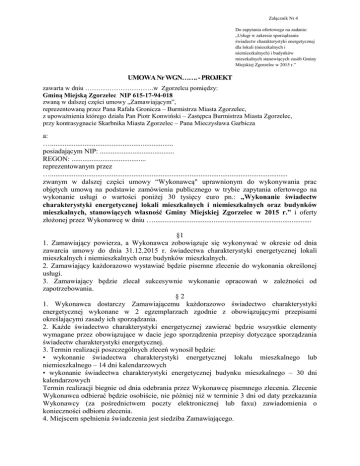 Załącznik Nr 4 Do zapytania ofertowego na zadanie: „Usługi w zakresie sporządzanie świadectw charakterystyki energetycznej dla lokali (mieszkalnych i niemieszkalnych) i budynków mieszkalnych stanowiących zasób Gminy Miejskiej Zgorzelec w 2015 r.” UMOWA Nr WGN……. - PROJEKT zawarta w dniu ………………………….w Zgorzelcu pomiędzy: Gminą Miejską Zgorzelec NIP 615-17-94-018 zwaną w dalszej części umowy „Zamawiającym”, reprezentowaną przez Pana Rafała Gronicza – Burmistrza Miasta Zgorzelec, z upoważnienia którego działa Pan Piotr Konwiński – Zastępca Burmistrza Miasta Zgorzelec, przy kontrasygnacie Skarbnika Miasta Zgorzelec – Pana Mieczysława Garbicza a: ….................................................................... posiadającym NIP: ......................................... REGON: ......................................... reprezentowanym przez …................................................................................................................................... zwanym w dalszej części umowy “Wykonawcą" uprawnionym do wykonywania prac objętych umową na podstawie zamówienia publicznego w trybie zapytania ofertowego na wykonanie usługi o wartości poniżej 30 tysięcy euro pn.: „Wykonanie świadectw charakterystyki energetycznej lokali mieszkalnych i niemieszkalnych oraz budynków mieszkalnych, stanowiących własność Gminy Miejskiej Zgorzelec w 2015 r.” i oferty złożonej przez Wykonawcę w dniu …....................................................................................... §1 1. Zamawiający powierza, a Wykonawca zobowiązuje się wykonywać w okresie od dnia zawarcia umowy do dnia 31.12.2015 r. świadectwa charakterystyki energetycznej lokali mieszkalnych i niemieszkalnych oraz budynków mieszkalnych. 2. Zamawiający każdorazowo wystawiać będzie pisemne zlecenie do wykonania określonej usługi. 3. Zamawiający będzie zlecał sukcesywnie wykonanie opracowań w zależności od zapotrzebowania. §2 1. Wykonawca dostarczy Zamawiającemu każdorazowo świadectwo charakterystyki energetycznej wykonane w 2 egzemplarzach zgodnie z obowiązującymi przepisami określającymi zasady ich sporządzania. 2. Każde świadectwo charakterystyki energetycznej zawierać będzie wszystkie elementy wymagane przez obowiązujące w dacie jego sporządzenia przepisy dotyczące sporządzania świadectw charakterystyki energetycznej. 3. Termin realizacji poszczególnych zleceń wynosił będzie: • wykonanie świadectwa charakterystyki energetycznej lokalu mieszkalnego lub niemieszkalnego – 14 dni kalendarzowych • wykonanie świadectwa charakterystyki energetycznej budynku mieszkalnego – 30 dni kalendarzowych Termin realizacji biegnie od dnia odebrania przez Wykonawcę pisemnego zlecenia. Zlecenie Wykonawca odbierać będzie osobiście, nie później niż w terminie 3 dni od daty przekazania Wykonawcy (za pośrednictwem poczty elektronicznej lub faxu) zawiadomienia o konieczności odbioru zlecenia. 4. Miejscem spełnienia świadczenia jest siedziba Zamawiającego. 5. Terminy określone w ust. 3 może ulec zmianie w razie powstania przeszkód mających wpływ na realizację pracy niezależnych od Zamawiającego i Wykonawcy. §3 1. Miejscem odbioru prac będzie siedziba Zamawiającego. 2. Zamawiający ma prawo do weryfikacji i wnoszenia uwag do przekazanej dokumentacji w terminie 14 dni od dnia przekazania, chyba że opracowanie ma wady, których w normalnym toku weryfikacji Zamawiający nie mógł zauważyć. 3. Jeżeli przekazana dokumentacja ma wady Zamawiający wyznaczy Wykonawcy odpowiedni termin do ich usunięcia, ustalony w protokóle podpisanym przez obie strony, nie dłuższy jednak niż 14 dni. Uchybienie temu terminowi spowoduje naliczenie kar umownych za opóźnienie od dnia, w którym dzieło miało zostać wydane bez wad zgodnie z pierwotnym zleceniem. 4. Dokumentem potwierdzającym każdorazowe przyjęcie przez Zamawiającego wykonania przedmiotu umowy będzie protokół zdawczo-odbiorczy, podpisany przez upoważnionych przedstawicieli stron. 5. Protokół, o którym mowa w ust.3 pkt 4 stanowi podstawę do wystawienia faktury, rachunku obejmującego wynagrodzenie umowne za przekazany Zamawiającemu przedmiot umowy. §4 Wykonawca nie może powierzyć prac objętych niniejsza umową innym osobom. 1. Szacunkowa łączna wartość brutto umowy, wynosi: …………………………..zł (słownie: ……………………………………………………………………..). W kwocie wynagrodzenia brutto uwzględnia się podatek od towarów i usług. 2. Strony ustalają, wynagrodzenie jednostkowe brutto za wykonanie każdego zlecenia zgodnie z formularzem ofertowym – Załączniku Nr 1 do niniejszej umowy. 3. Strony ustalają, że za wykonanie przedmiotu niniejszej umowy Wykonawca otrzyma wynagrodzenie w zależności od ilości zrealizowanych usług. 4. Strony postanawiają, iż wynagrodzenie Wykonawcy zostanie ustalone jako iloczyn cen jednostkowych brutto, określonych w formularzu ofertowym, stanowiącym Załącznik Nr 1 do niniejszej umowy oraz liczby wykonanych usług. 5. Wyszczególnione w formularzu ofertowym - Załączniku Nr 1 do niniejszej umowy, ceny jednostkowe brutto za usługi objęte przedmiotem niniejszej umowy stanowią wynagrodzenie ryczałtowe i zawierają wszystkie koszty mogące powstać w okresie realizacji przedmiotu niniejszej umowy są cenami stałymi nie podlegającymi waloryzacji w okresie związania z umową. 6. Zamawiający zastrzega sobie możliwość zwiększenia lub zmniejszenia ilości wykonanych usług, wymienionych w formularzu ofertowym - Załączniku nr 1 do niniejszej umowy, przy czym wynagrodzenie Wykonawcy za wykonane usługi nie może przekroczyć, szacunkowej łącznej wartości brutto określonej w § 5 ust. 1 niniejszej umowy. W takim przypadku Wykonawcy nie będą przysługiwać z tego tytułu żadne roszczenia. §5 Wykonawca za wykonany prze