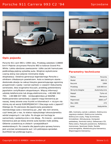Porsche 911 Carrera 993 C2 '94 Sprzedane Opis pojazdu Porsche 911 serii 993 z 1994 roku. Przebieg zaledwie 118800 km!!! Pięknie utrzymane Porsche 993 w kolorze Grand Prix White. Lekko obniżone zawieszenie i żółte zaciski hamulcowe podkreślają piękną sylwetkę auta. Wnętrze wykończone czarną skórą nosi jedynie minimalne ślady Parametry techniczne eksploatacji. Ostatnia generacja legendarnego Porsche z Marka Porsche silnikiem chłodzonym powietrzem. Auto w świetnym stanie – Model 993 C2 doskonała okazja na zakup klasyka gwarantującego ogromną przyjemność z jazdy i wzrost wartości z czasem! Dokumenty serwisowe, dwa oryginalne kluczyki, przebieg potwierdzony Rocznik Przebieg 1994 118 000 km japońskim certyfikatem eksportowym. Więcej informacji Skrzynia biegów udzielę telefonicznie lub drogą elektroniczną. +48 606 502 Napęd Tylna oś 793; +48 888 037 000; [email protected] WAŻNE : Paliwo Benzyna Kolekcjonerskie samochody z Japonii mają kierownicę po naszej, lewej stronie oraz liczniki w kilometrach = niczym nie różnią się od wersji EUROPEJSKICH!!! Dlaczego auto z Japonii? Dlatego że: Po pierwsze dla Japończyka posiadanie Pojemność Automatyczna 3600 cm3 Moc (KM) Kolor 272 biały/white niemieckiego auta z kierownicą po „złej” dla nich stronie, czyli lewej jak u nas, to status najwyższego luksusu/prestiżu wśród znajomych i nie tylko. Po drugie oni kochają te samochody i pedantycznie o nie dbają . Po trzecie – ponieważ kierownica jest po lewej stronie auta bardzo mało jeżdżą. ABS, Centralny zamek z pilotem, Elektryczna regulacja siedzeń, Elektryczne lusterka, Elektryczne szyby, Felgi aluminiowe, Immobilizer, Klimatyzacja, Komputer pokładowy, Kontrola trakcji, Odtwarzacz CD, Głównie uczestniczą w zlotach i przejażdżkach Pełna skóra, Poduszki powietrzne, Reflektory weekendowych. Po czwarte dla Japończyka sprawą honoru ksenonowe, Sportowe fotele, Światła jest uczciwe serwisowanie aut i ich późniejsza sprzedaż. przeciwmgielne, Wielofunkcyjna kierownica, DLATEGO też preferuję kupno… Copyright 2015 © KIMBEX - www.kimbex.pl Wspomaganie kierownicy Strona 1 z 1