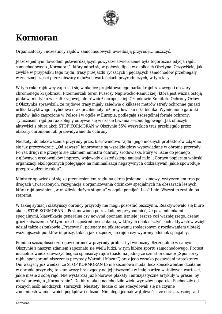 Kormoran Organizatorzy i uczestnicy rajdów samochodowych uwielbiają przyrodę… niszczyć. Jeszcze jednym dowodem potwierdzającym powyższe stwierdzenie była tegoroczna edycja rajdu samochodowego „Kormoran”, który odbył się w połowie lipca w okolicach Olsztyna. Oczywiście, jak zwykle w przypadku tego rajdu, trasy przejazdu ryczących i pędzących samochodów przebiegały w znacznej części przez obszary o dużych wartościach przyrodniczych, w tym lasy. W tym roku rajdowcy zaprosili się w okolice projektowanego parku krajobrazowego i obszary chronionego krajobrazu. Przemierzali teren Puszczy Napiwocko-Ramuckiej, która jest ważną ostoją ptaków, nie tylko w skali krajowej, ale również europejskiej. Członkowie Komitetu Ochrony Orłów z Olsztynka sprawdzili, że rajdowe trasy mijały zaledwie o kilkaset metrów strefy ochronne gniazd orlika krzykliwego i rybołowa oraz przebiegały tuż przy łowisku orła bielika. Wymienione gatunki ptaków, jako zagrożone w Polsce i w ogóle w Europie, podlegają szczególnej formie ochrony. Tymczasem rajd po raz kolejny odbywał się w czasie trwania sezonu lęgowego. Jak obliczyli aktywiści z biura akcji STOP KORMORAN w Olsztynie 55% wszystkich tras przebiegało przez obszary chronione lub przewidywane do ochrony. Niestety, do lekceważenia przyrody przez kierownictwo rajdu i jego możnych protektorów zdążono się już przyzwyczaić. „Od zawsze” ignorowane są wszelkie głosy wypowiadane w obronie przyrody. Po raz drugi nie przejęto się zdaniem ministra ochrony środowiska, który w liście do jednego z głównych orędowników imprezy, wojewody olsztyńskiego napisał m.in. „Gorąco popieram wnioski organizacji ekologicznych polegające na minimalizacji negatywnych oddziaływań, jakie spowoduje przeprowadzenie rajdu”. Minister opowiedział się za przeniesieniem rajdu na okres jesienno – zimowy, wytyczeniem tras po drogach utwardzonych, rezygnacją z organizowania odcinków specjalnych na obszarach leśnych, które rajd powinien „w możliwie dużym stopniu” w ogóle pomijać. I co? I nic. Wszystko zostało po staremu. W takiej sytuacji olsztyńscy obrońcy przyrody nie mogli pozostać bezczynni. Reaktywowało się biuro akcji „STOP KORMORAN”. Postanowiono po raz kolejny przypomnieć, że poza odcinkami specjalnymi, klasyfikacją generalną czy nowymi oponami istnieje jeszcze coś ważniejszego, czemu grozi zniszczenie. W tym roku bezpośrednie działania, w których obok olsztyńskich aktywistów wzięli udział także członkowie „Pracowni”, polegały na pikietowaniu (połączonym z rozdawaniem ulotek) ważniejszych punktów imprezy, takich jak rozpoczęcie rajdu czy wybrany odcinek specjalny. Pomimo szczupłości szeregów obrońców przyrody protest był widoczny. Szczególnie w samym Olsztynie z naszym zdaniem zapoznało się wielu ludzi, w tym kibice sportu samochodowego. Protest musieli również zauważyć bogaci sponsorzy rajdu (hasło na jednej ze szmat brzmiało: „Sponsorzy rajdu sponsorami niszczenia przyrody Warmii i Mazur”) oraz jego wysoko postawieni protektorzy. Oni wszyscy już wiedzą, że STOP KORMORAN to nie sezonowa moda, lecz konsekwentne działanie w obronie przyrody; to stanowczy brak zgody na jej niszczenie w imię bardzo wątpliwych wartości, jakie niesie z sobą rajd. Nie wystarczą już kolorowe plakaty i entuzjastyczne artykuły w prasie, by ukryć prawdę o „Kormoranie”. Do biura akcji nadchodziło wiele wyrazów poparcia. Pochodziły od różnych osób młodszych, starszych. Niestety, ludzie ci nie zdecydowali się na czynne zamanifestowanie swoich poglądów i odczuć. Nie ulega jednak wątpliwości, że coraz częściej rajd Kormoran 1 „Kormoran” jest postrzegany na Warmii i Mazurach jako rzeczywiste zagrożenie dla przyrody, jako impreza niepotrzebna, z gruntu obca dla regionu relatywnie mniej zniszczonego ekologicznie od większości innych w Polsce. Kormoran – tak od wieków nazywa się pięknego ptaka, między innymi zamieszkującego podolsztyńskie okolice. I to wystarczy. Ten drugi „Kormoran” powinien jak najszybciej zniknąć (przynajmniej w obecnej postaci). Dość, że będziemy go wspominać jako niechlubny przykład czysto przedmiotowego traktowania przyrody przez człowieka. A jak było na samej pikiecie? Po pierwsze tzw. kibice. To ich jest zwykle najwięcej przy rajdowych trasach. Znajdując się w okolicach pikiety ludzie ci niejednokrotnie zamieniali się w specjalistów od edukacji ekologicznej i próbowali uczyć nas uczestników akcji STOP KORMORAN – na czym polega prawdziwa ochrona przyrody. „Nie stójcie na trawie, bo ją niszczycie!” – było to w lesie. „Posprzątajcie ten las, przecież jest tak zaśmiecony!”. „Zajmijcie się miejskimi autobusami, to one trują, a odczepcie się od tych samochodów” słyszeliśmy od tych samozwańczych nauczycieli. Bardziej wnikliwi oceniali, wydając nam przy tym świadectwa moralności: „Buty mają ze skóry, więc są dwulicowi”. W oczach tych znawców ekologii byliśmy zupełnymi i na dodatek zaściankowymi ignorantami: „…jeżeli rajdy organizują w Finlandii, gdzie ekologia jest super, to i u nas mogłyby być choćby co miesiąc”. Poza owymi kibolami trasę rajdu oblegali ludzie w mundurach – policyjnych oczywiście. Zdarzały się całe „zmasowane oddziały” w kompletnym wyposażeniu i w pełnej gotowości do akcji. Ktoś zauważył (choć mam nadzieję, że się mylił), że w dniach rajdu Olsztyn był miastem bardzo „bezpiecznym dla złodziei i innych przestępców, gdyż cała miejscowa policja zajmowała się tym nieszczęsnym „Kormoranem” i niczym innym. Trzeba jednak przyznać, że policjanci opowiadali się za pełnym pluralizmem: „Każdy ma prawo do wyrażania swoich poglądów” i otoczyli nas troskliwą opieką: „Włos wam tutaj z głowy nie spadnie”. Bywało i tak: matka mówi do kilkuletniej córki, wyjaśniając sens naszego pro