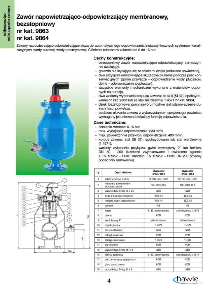 armatura napowietrzająco-odpowietrzająca Zawór napowietrzająco-odpowietrzający membranowy, bezstopniowy nr kat. 9863 nr kat. 9864 Zawory napowietrzająco-odpowietrzające służą do automatycznego odpowietrzania instalacji tłocznych systemów kanalizacyjnych, wody surowej, wody przemysłowej. Ciśnienie robocze w zakresie od 0 do 16 bar. Cechy konstrukcyjne: –– bezstopniowy zawór napowietrzająco-odpowietrzający, samoczynnie działający, –– gniazdo nie stykające się ze ściekami dzięki poduszce powietrznej, –– dwa przyłącza umożliwiające skuteczne płukanie podczas prac konserwacyjnych (górne przyłącze – doprowadzenie wody płuczącej, dolne – odprowadzenie popłuczyn), –– wszystkie elementy mechaniczne wykonane z materiałów odpornych na korozję, –– dwa warianty wykonania korpusu zaworu: ze stali (St 37), epoksydowanej nr kat. 9863 lub ze stali nierdzewnej 1.4571 nr kat. 9864, –– dzięki bezstopniowej pracy zaworu możliwe jest odprowadzenie dużych ilości powietrza, –– podczas płukania zaworu z wykorzystaniem sprężonego powietrza wymagany jest element blokujący funkcję odpowietrzania. Dane techniczne: –– ciśnienie robocze: 0-16 bar –– max. wydajność odpowietrzania: 230 m3/h, –– max. powierzchnia przekroju odpowietrzania: 480 mm2, –– korpus zaworu: stal (St 37), epoksydowana lub stal nierdzewna (1.4571), –– warianty wykonania przyłącza: gwint wewnętrzny 2’’ lub kołnierz DN 50 - 200 (kołnierze zwymiarowane i owiercone zgodnie z EN 1092-2 – PN10 standard, EN 1092-2 – PN16 DN 200 prosimy podać przy zamówieniu). Lp. Części składowe Wykonanie: nr kat. 9863 Wykonanie: nr kat. 9864 1 kolano wylotowe z sitem PE 100, sito 1.4301 PE 100, sito 1.4301 2 membrana z pierścieniem zabezpieczającym NBR-50 SHORE NBR-50 SHORE 3 uszczelki typu O-ring 95 x 8,5 NBR NBR 4 śruba z łbem sześciokątnym INOX A4 INOX A4 5 nakrętka z łbem sześciokątnym INOX A4 INOX A4 6 odbojnik 7 korpus 8 pływak POM POM 9 zawór kulowy 1” stal nierdzewna stal nierdzewna 10 drążek pływaka 1.4571 1.4571 11 pierścień tłumiący NBR NBR 12 uchwyt membrany POM POM 13 sprężyna dociskowa 1.4310 1.4310 14 sito tarczowe POM POM 15 uszczelki typu O-ring 157 x 6 NBR NBR 16 kołnierz zaciskowy St 37, epoksydowana stal nierdzewna 1.4571 17 pierścień osadczy sprężynujący POM POM 18 górna część zaworu POM POM 19 uszczelki typu O-ring 34 x 3 NBR NBR 4 PE PE St 37, epoksydowana stal nierdzewna 1.4571 Zawory napowietrzająco-odpowietrzające są dostępne w dwóch wersjach wykonania korpusu: –– nr kat. 9863: stal St 37, epoksydowna (ochrona antykorozyjna dzięki powłoce EWS), –– nr kat. 9864: stal nierdzewna 1.4571. nr kat. 9863 zawór napowietrzająco-odpowietrzający ze St 37, epoksydowanej nr kat. 9863 kołnierz DN PN B mm H mm masa kg gwint wew. 2” 10/16 270 600 21,5 50 10/16 270 615 23,5 270 615 27,0 80 10/16 100 10/16 270 615 25,5 150 10/16 270 (kołnierz ∅ 285) 615 26,5 200 10 270 (kołnierz ∅ 340) 615 33,0 200 16 270 (kołnierz ∅ 340) 615 33,0 nr kat. 9864 zawór napowietrzająco-odpowietrzający ze stali nierdzewnej (1.4571) nr kat. 9864 kołnierz DN PN B mm H mm masa kg gwint wew. 2” 10/16 270 600 20,0 50 10/16 270 615 22,5 80 10/16 270 615 20,5 100 10/16 270 615 25,0 150 10/16 270 (kołnierz ∅ 285) 615 28,0 200 10 270 (kołnierz ∅ 340) 615 33,0 200 16 270 (kołnierz ∅ 340) 615 33,0 5 armatura napowietrzająco-odpowietrzająca Zawory napowietrzająco-odpowietrzajace muszą być poddawane regularnej konserwacji, a w szczególności te zawory, które zabudowane są na ciśnieniowych przewodach kanalizacyjnych o wysokim stopniu zanieczyszczenia. Należy zwrócić szczególną uwagę na informacje zawarte w instrukcji obsługi dostępnej na stronie internetowej www.hawle.pl, na obowiązujące normy i uregulowania oraz przestrzegać przepisów BHP. W zamontowanych na sieci zaworach napowietrzająco-odpowietrzających znajduje się sprężone powietrze, dlatego przed rozpoczęciem prac konserwacyjnych należy zamknąć armaturę odcinającą przed zaworem, następnie otworzyć zawór kulowy 1” (9) i wypuścić z zaworu powietrze będące pod ciśnieniem. Zawór napowietrzająco-odpowietrzający firmy HAWLE umożliwia zarówno napowietrzanie rurociągów, jak też usuwanie znajdującego się w rurociągach powietrza. Zawór pracuje samoczynnie i dzięki jego szczególnej konstrukcji redukuje częściowo skutki uderzenia hydraulicznego. Gniazdo zaworu nie ma styczności ze ściekami (poduszka powietrzna). armatura napowietrzająco-odpowietrzająca Warianty wykonania zaworu na- i odpowietrzającego na zapytanie: –– tylko z funkcją napowietrzania, –– tylko z funkcją odpowietrzania. Zawór jednokierunkowy z gwintowanym kolanem rurowym – w zależności od kierunku wbudowania wyłącznie funkcja napowietrzania lub odpowietrzania! Sposób konserwacji zaworu – patrz instrukcja obsługi na str. 10 Przykład zabudowy w komorze lub w studzience: Zawory napowietrzająco-odpowietrzające montuje się w komorach lub studzienkach. W projekcie budowlanym należy uwzględnić odpowiedniej wielkości otwór dla niezakłóconego dopływu i odpływu powietrza. Aby uniknąć wnikania zanieczyszczeń lub owadów podczas eksploatacji, otwory należy zabezpieczyć odpowiednio gęstą siatką. Przy wykonywaniu pomieszczenia, należy zwrócić również uwagę na konieczność odprowadzania na zewnątrz studzienki bądź komory porwanych podczas odpowietrzania niewielkich ilości wody lub wody popłucznej przy prowadzeniu prac serwisowych. Woda ta musi być odprowadzona przez odpowiednio wykonane odwodnienie. UWAGA Przed zejściem do studzienki należy przewietrzyć komorę i upewnić się, czy zapewniony jest wystarczający dopływ świeżego powietrza, w razie potrzeby wentylować. Należy bezwzględnie przestrzegać określonych przepisów BHP – w tym dotyczących prac, które winny być wykonywane 