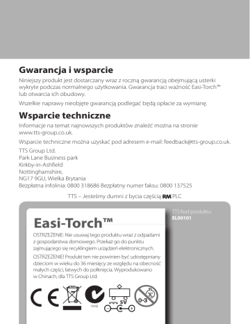 Gwarancja i wsparcie Niniejszy produkt jest dostarczany wraz z roczną gwarancją obejmującą usterki wykryte podczas normalnego użytkowania. Gwarancja traci ważność Easi-Torch™ lub otwarcia ich obudowy. Wszelkie naprawy nieobjęte gwarancją podlegać będą opłacie za wymianę. Wsparcie techniczne Informacje na temat najnowszych produktów znaleźć można na stronie www.tts-group.co.uk. Wsparcie techniczne można uzyskać pod adresem e-mail: [email protected]. TTS Group Ltd. Park Lane Business park Kirkby-in-Ashfield Nottinghamshire, NG17 9GU, Wielka Brytania Bezpłatna infolinia: 0800 318686 Bezpłatny numer faksu: 0800 137525 TTS – Jesteśmy dumni z bycia częścią TTS Kod produktu: Easi-Torch™ EL00101 OSTRZEŻENIE: Nie usuwaj tego produktu wraz z odpadami z gospodarstwa domowego. Przekaż go do punktu zajmującego się recyklingiem urządzeń elektronicznych. OSTRZEŻENIE! Produkt ten nie powinien być udostępniany dzieciom w wieku do 36 miesięcy ze względu na obecność małych części, łatwych do połknięcia. Wyprodukowano w Chinach, dla TTS Group Ltd. Nxxxxx N448 PLC 5V Easi-Torch™ 6 latarek LED wielokrotnego ładowania i stacja dokująca INSTRUKCJA UŻYTKOWNIKA www.tts-shopping.com Ważna informacja Przed użyciem urządzenia Easi-Torch™ prosimy o dokładne zapoznanie się z treścią niniejszej instrukcji obsługi i zachowanie jej do ewentualnego wykorzystania w przyszłości. nUrządzenie Easi-Torch™ zawiera niewymienialną baterię wielokrotnego ładowania. nNie próbuj wyjmować baterii. nNależy chronić urządzenie Easi-Torch™ przed kontaktem z wodą lub innymi płynami. nW przypadku wyładowania elektrostatycznego, urządzenie Easi-Torch™ może działać nieprawidłowo. W takim przypadku należy je wyłączyć, a następnie włączyć ponownie w celu jego zresetowania. Ładowanie urządzenia Easi-Torch™ Przed rozpoczęciem korzystania z urządzenia Easi-Torch™ konieczne jest naładowanie latarki. Umieść wszystkie latarki w stacji dokującej, podłącz do niej zasilacz, zacznie migotać zielona dioda LED na stacji dokującej, wskazując, że jest ona podłączona do zasilania. Na każdej latarce świecić się będzie czerwona dioda LED oznaczająca ich ładowanie. Po upływie około czterech godzin na latarce zaświeci się pomarańczowa dioda LED, wskazując, że urządzenie Easi-Torch™ jest w pełni naładowane i gotowe do użycia. Korzystanie z urządzenia Easi-Torch™ W pełni naładowane urządzenie Easi-Torch™ może pracować w sposób ciągły przez około dwie godziny. Wskaźnik naładowania baterii (umieszczony nad przełącznikiem On/Off ) informuje o aktualnym stopniu naładowania baterii (100%, 75%, 50%, 25%). Gdy poziom naładowania baterii spada poniżej 10%, zaczyna migotać czerwona dioda. Wówczas należy wyłączyć latarkę i umieścić ją w stacji dokującej do naładowania. Należy pamiętać, że latarka musi być wyłączona, w przeciwnym razie nie będzie doładowywana. Ładowarka urządzenia Easi-Torch™ Urządzenie Easi-Torch™ wyposażone jest w ładowarkę. Ładowarka ta dostarczana jest tylko z wtyczką o standardzie obowiązującym w Wielkiej Brytanii. Easi-Torch™ Używany wraz ze stacją dokującą bezpieczny transformator z izolacją należy regularnie sprawdzać pod kątem potencjalnych zagrożeń, takich jak: uszkodzenie kabla, linki, wtyczki, obudowy lub innych części. W przypadku jakichkolwiek uszkodzeń stacji dokującej, nie wolno z niej korzystać do chwili ich naprawienia. nStacja dokująca nie powinna być udostępniana dzieciom poniżej 3 lat. nTransformator nie jest zabawką. nStacja dokująca może być używana wyłącznie wraz z zalecanym transformatorem. nZabawki, które można czyścić za pomocą płynów, muszą zostać odłączone od transformatora przed rozpoczęciem czyszczenia. Specyfikacje Specyfikacje Praca Napięcie 2,4 V DC Ładowanie Napięcie 5 V DC Prąd ładowania 100 mA Zakres temperatury pracy Od -20 do 80°C Trwałość baterii 2 godziny ciągłej pracy (w przybliżeniu) Czas ładowania baterii 4 godziny (w przybliżeniu) Wykrywanie i usuwanie usterek W normalnych warunkach użytkowania urządzenie Easi-Torch™ powinno pracować niezawodnie i zgodnie z założeniami. Możliwe jest jednak wystąpienie problemów. Przed skontaktowaniem się z działem pomocy technicznej zapoznaj się z poniższą tabelą. Problem Rozwiązanie Migocze czerwona dioda LED. Bateria jest niemal całkowicie rozładowana. Doładuj urządzenie Easi-Torch™. Urządzenie Easi-Torch™ nie jest Przed rozpoczęciem ładowania urządzenia Easi-Torch™ należy je koniecznie wyłączyć. ładowane.