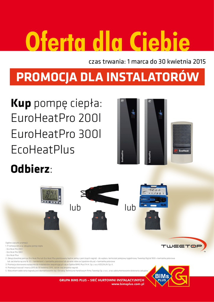 czas trwania: 1 marca do 30 kwietnia 2015 PROMOCJA DLA INSTALATORÓW Kup pompę ciepła: EuroHeatPro 200l EuroHeatPro 300l EcoHeatPlus Odbierz: lub lub Ogólne warunki promocji: 1. P romocja dot yczy zakupów pomp ciepła - Eco Heat Pro 200 l - Eco Heat Pro 300 l - Eco Heat Plus 2. Zakup dowolnej pom py Eco Heat Pro lub Eco Heat Plus premiowany będzie jedną z poni ższych nagród - do wyboru termostat pokojowy tygodniowy Tweetop Digital 900i + kamizelka polarowa lub zaciskarka ręczna 16-32 z kamieniami + kamizelka polarowa lub ubranie roboc ze (spodnie+bluza) + kamizelka polarowa 3. Promocja skierowana wyłącznie do instalatorów zaopatrujących się w Spółce BIMS Plus F.H.H. Sp. z o.o. KOSZALIN Sp. K. 4. Promocja trwa od 1 marca 2015 do 30 kwietnia 2015, lub do wyczerpania nagród. 5. Warunkiem odeb rania nagrody je st skontaktowanie się z Doradcą Techniczno Handl owym firmy Tweetop Sp. z o.o., o raz udokumentowanie dokonania zakupów.