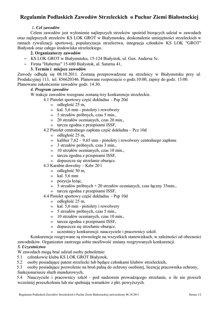 Regulamin Podlaskich Zawodów Strzeleckich o Puchar Ziemi Białostockiej 1. Cel zawodów Celem zawodów jest wyłonienie najlepszych strzelców spośród biorących udział w zawodach oraz najlepszych strzelców KS LOK GROT w Białymstoku, doskonalenie umiejętności strzeleckich w ramach rywalizacji sportowej, popularyzacja strzelectwa, integracja członków KS LOK "GROT" Białystok oraz całego środowiska strzeleckiego. 2. Organizatorzy zawodów – KS LOK GROT w Białymstoku, 15-124 Białystok, ul. Gen. Andersa 5c. – Firma "Hubertus" 15-680 Białystok, ul. Saturna 41, 3. Termin i miejsce zawodów Zawody odbędą się 08.10.2011. Zostaną przeprowadzone na strzelnicy w Białymstoku przy ul. Produkcyjnej 113, tel. 856620346. Planowane rozpoczęcie o godz.10:00, zapisy do godz. 13:00. Planowane zakończenie zawodów godz. 14.30. 4. Program zawodów W trakcje zawodów rozegrane zostaną trzy konkurencje strzeleckie. 4.1 Pistolet sportowy część dokładna - Psp 20d • odległość 25 m, • kal. 5,6 mm - pistolety i rewolwery • 5 strzałów próbnych, czas 5 min., • 20 strzałów ocenianych, czas 20 min., • tarcza zgodna z przepisami ISSF, 4.2 Pistolet centralnego zapłonu część dokładna – Pcz 10d • odległość 25 m, • kaliber 7,62 – 9,65 mm - pistolety i rewolwery centralnego zapłonu • 3 strzałów próbnych, czas 3 min., • 10 strzałów ocenianych, czas 10 min., • tarcza zgodna z przepisami ISSF, • dopuszcza się strzelanie oburącz. 4.3 Karabin dowolny – Kdw 20 l • odległość 50 m, • kal. 5,6 mm • pozycja leżąc, • 5 strzałów próbnych + 20 strzałów ocenianych, czas łączny 35min., • tarcza zgodna z przepisami ISSF, 4.4 Pistolet sportowy część dokładna - Psp 10d • odległość 25 m, • kal. 5,6 mm - pistolety i rewolwery • 5 strzałów próbnych, czas 5 min., • 10 strzałów ocenianych, czas 10 min., • tarcza zgodna z przepisami ISSF, • dopuszcza się strzelanie oburącz. • uczestnicy konkurencji: nauczyciele i pracownicy szkół. Konkurencje rozgrywane są równolegle na wszystkich stanowiskach, w zależności od obecności zawodników. Organizator zastrzega sobie możliwość zmiany rozgrywanych konkurencji. 5. Uczestnictwo W zawodach mogą brać udział osoby pełnoletnie: 5.1 członkowie klubu KS LOK GROT Białystok, 5.2 osoby posiadające patent strzelecki lub będące członkami klubów strzeleckich, 5.3 osoby posiadające pozwolenie na broń palną do ochrony osobistej, licencję pracownika ochrony, funkcjonariusze służb mundurowych, 5.4 Nauczyciele i pracownicy szkół - pod nadzorem prowadzącego strzelanie, o ile nie przeszli wcześniej przeszkolenia lub nie spełniają warunków z pkt. powyższych. Regulamin Podlaskich Zawodów Strzeleckich o Puchar Ziemi Białostockiej zatwierdzony 06.10.2011 Strona 1/2 5.5 W konkurencji pistolet sportowy część dokładna - Psp 10d (pkt. 4.4) mogą brać udział tylko nauczyciele i pracownicy szkół. Wiek uczestników wg przepisów PZSS: seniorzy, juniorzy. 6. Klasyfikacja Prowadzone są klasyfikacje: 6.1 w poszczególnych konkurencjach strzeleckich, 6.2 klasyfikacja o Puchar Ziemi Białostockiej, do której brana jest suma wyników z konkurencji Psp20d i Pcz10d. Wygrywa zawodnik, który zdobędzie najwięcej punktów. Klasyfikowani są wszyscy zawodnicy, którzy przystąpią do obu konkurencji i posiadają adres zameldowania w Białymstoku lub powiecie białostockim. 6.3 drużynowa klasyfikacja o Puchar Ziemi Białostockiej dla edukacji. Klasyfikowana jest trzyosobowa drużyna jako reprezentacja szkoły. Członkami trzyosobowej drużyny mogą być nauczyciele lub pracownicy szkół. Do klasyfikacji brana jest suma wyników członków drużyny z konkurencji Psp10d. Wygrywa drużyna, która zdobędzie najwięcej punktów. Szkoła może wystawić więcej niż jedną reprezentację. Klasyfikowane są szkoły z Białegostoku i powiatu białostockiego. Klasyfikacja zostanie przeprowadzona jeżeli wystartuje minimum cztery drużyny. Jeżeli w/w warunek nie zostanie spełniony „PZB dla edukacji” zostanie wręczony najlepszemu zawodnikowi w klasyfikacji indywidualnej Psp10d. 6.4 Klasyfikacja indywidualna nauczycieli i pracowników szkół w konkurencji Psp10d. 6.5 Klasyfikowani są wszyscy wymienieni w p.5 zawodnicy z uwzględnieniem powyższych warunków. 6.6 Zawody rozgrywane są w ramach Podlaskich Zawodów Strzeleckich i ich wyniki są brane do klasyfikacji PZS zgodnie regulaminem PZS z pkt. 6 i 7. 7. Nagrody 7.1 Za zajęcie miejsc od 1 do 3 w klasyfikacji o Puchar Ziemi Białostockiej wręczone będą: - za zajęcie miejsca 1-go – Puchar Ziemi Białostockiej i dyplom - za zajęcie miejsca 2 i 3 – medale i dyplomy. 7.2 Za zajęcie miejsc od 1 do 3 w klasyfikacji o Puchar Ziemi Białostockiej dla edukacji najlepszym drużynom w konkurencji Psp 10d wręczone będą : - za zajęcie miejsca 1-go – Puchar Ziemi Białostockiej dla edukacji, dyplomy i medale - za zajęcie miejsca 2 i 3 – medale i dyplomy 7.3 Za zajęcie miejsc od 1 do 3 w klasyfikacji indywidualnej Psp10d wręczone będą medale i dyplomy, za zajęcie miejsca 4 i 5 – dyplomy. 7.4 Rozdanie nagród i dyplomów odbędzie się po zakończeniu zawodów. W pozostałych konkurencjach i klasyfikacjach organizatorzy nie przewidują nagród. Organizatorzy, w miarę możliwości finansowych, planują rozlosować wśród uczestników upominki. 8. Zgłoszenia 8.1. obywatele polscy: zgłoszenia są przyjmowane telefonicznie na strzelnicy tel. 856620346, w dniu zawodów do godziny 13.00 u Kierownika Zawodów. 8.2.obywatele innych krajów: zgłoszenia są przyjmowane na min. 14dni przed zawodami u Prezesa KS LOK GROT Białystok. (podst. prawna. Dz. U. Nr 38 poz. 195 art. 42 ust. 2b) 9. Opłaty za udział w zawodach Startowe w poszczególnych konkurencjach wynosi: Psp 10d: 8zł; Psp 20d: 20 zł; Ksp: 20 zł; Pcz: 25 zł. Istnieje możliwość, po wniesieniu dodatkowych opłat startowych, ponownego startu w każdej
