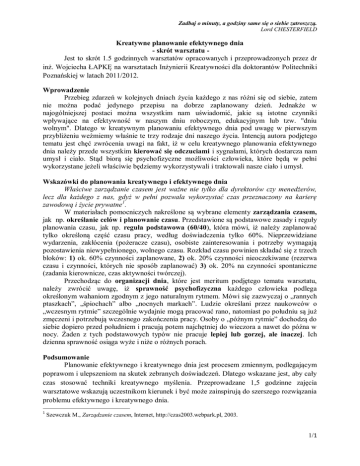 Zadbaj o minuty, a godziny same się o siebie zatroszczą. Lord CHESTERFIELD Kreatywne planowanie efektywnego dnia - skrót warsztatu Jest to skrót 1.5 godzinnych warsztatów opracowanych i przeprowadzonych przez dr inż. Wojciecha ŁAPKĘ na warsztatach Inżynierii Kreatywności dla doktorantów Politechniki Poznańskiej w latach 2011/2012. Wprowadzenie Przebieg zdarzeń w kolejnych dniach życia każdego z nas różni się od siebie, zatem nie można podać jedynego przepisu na dobrze zaplanowany dzień. Jednakże w najogólniejszej postaci można wszystkim nam uświadomić, jakie są istotne czynniki wpływające na efektywność w naszym dniu roboczym, edukacyjnym lub tzw. "dniu wolnym". Dlatego w kreatywnym planowaniu efektywnego dnia pod uwagę w pierwszym przybliżeniu weźmiemy właśnie te trzy rodzaje dni naszego życia. Intencją autora podjętego tematu jest chęć zwrócenia uwagi na fakt, iż w celu kreatywnego planowania efektywnego dnia należy przede wszystkim kierować się odczuciami i sygnałami, których dostarcza nam umysł i ciało. Stąd biorą się psychofizyczne możliwości człowieka, które będą w pełni wykorzystane jeżeli właściwie będziemy wykorzystywali i traktowali nasze ciało i umysł. Wskazówki do planowania kreatywnego i efektywnego dnia Właściwe zarządzanie czasem jest ważne nie tylko dla dyrektorów czy menedżerów, lecz dla każdego z nas, gdyż w pełni pozwala wykorzystać czas przeznaczony na karierę zawodową i życie prywatne1. W materiałach pomocniczych nakreślone są wybrane elementy zarządzania czasem, jak np. określanie celów i planowanie czasu. Przedstawione są podstawowe zasady i reguły planowania czasu, jak np. reguła podstawowa (60/40), która mówi, iż należy zaplanować tylko określoną część czasu pracy, według doświadczenia tylko 60%. Nieprzewidziane wydarzenia, zakłócenia (pożeracze czasu), osobiste zainteresowania i potrzeby wymagają pozostawienia niewypełnionego, wolnego czasu. Rozkład czasu powinien składać się z trzech bloków: 1) ok. 60% czynności zaplanowane, 2) ok. 20% czynności nieoczekiwane (rezerwa czasu i czynności, których nie sposób zaplanować) 3) ok. 20% na czynności spontaniczne (zadania kierownicze, czas aktywności twórczej). Przechodząc do organizacji dnia, które jest meritum podjętego tematu warsztatu, należy zwrócić uwagę, iż sprawność psychofizyczna każdego człowieka podlega określonym wahaniom zgodnym z jego naturalnym rytmem. Mówi się zazwyczaj o „rannych ptaszkach”, „śpiochach” albo „nocnych markach”. Ludzie określani przez naukowców o „wczesnym rytmie” szczególnie wydajnie mogą pracować rano, natomiast po południu są już zmęczeni i potrzebują wczesnego zakończenia pracy. Osoby o „późnym rytmie” dochodzą do siebie dopiero przed południem i pracują potem najchętniej do wieczora a nawet do późna w nocy. Żaden z tych podstawowych typów nie pracuje lepiej lub gorzej, ale inaczej. Ich dzienna sprawność osiąga wyże i niże o różnych porach. Podsumowanie Planowanie efektywnego i kreatywnego dnia jest procesem zmiennym, podlegającym poprawom i ulepszeniom na skutek zebranych doświadczeń. Dlatego wskazane jest, aby cały czas stosować techniki kreatywnego myślenia. Przeprowadzane 1,5 godzinne zajęcia warsztatowe wskazują uczestnikom kierunek i być może zainspirują do szerszego rozwiązania problemu efektywnego i kreatywnego dnia. 1 Szewczuk M., Zarządzanie czasem, Internet, http://czas2003.webpark.pl, 2003. 1/1