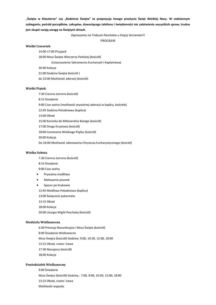 „Święta w Klasztorze” czy „Rodzinne Święta” to propozycja innego przeżycia Świąt Wielkiej Nocy. W codziennym zabieganiu, pośród porządków, zakupów, dzwoniącego telefonu i świadomości nie załatwienia wszystkich spraw, trudno jest skupić swoją uwagę na Świętych dniach. Zapraszamy na Triduum Paschalne u Księży Sercanów!!! PROGRAM Wielki Czwartek 14:00-17:00 Przyjazd 18:00 Msza Święta Wieczerzy Pańskiej (kościół) (Ustanowienie Sakramentu Eucharystii i Kapłaństwa) 20:00 Kolacja 21:00 Godzina Święta (kościół ) do 22:00 Możliwość adoracji (kościół) Wielki Piątek 7:30 Ciemna Jutrznia (kościół) 8:15 Śniadanie 9:00 Czas wolny (możliwość prywatnej adoracji w kaplicy, kościele) 12:45 Godzina Południowa (kaplica) 13:00 Obiad 15:00 Koronka do Miłosierdzia Bożego (kościół) 17:00 Droga Krzyżowa (kościół) 18:00 Ceremonia Wielkiego Piątku (kościół) 20:00 Kolacja Do 24:00 Możliwość adorowania Chrystusa Eucharystycznego (kościół) Wielka Sobota 7:30 Ciemna Jutrznia (kościół) 8:15 Śniadanie 9:00 Czas wolny Prywatna modlitwa Malowanie pisanek Spacer po Krakowie 12:45 Modlitwa Południowa (kaplica) 13:00 Święcenie pokarmów 13:15 Obiad 18:00 Kolacja 20:00 Liturgia Wigilii Paschalej (kościół) Niedziela Wielkanocna 6:30 Procesja Rezurekcyjna i Msza Święta (kościół) 8:00 Śniadanie Wielkanocne Msza Święta (kościół) Godziny: 9:00, 10:30, 12:00, 18:00 13:15 Obiad, ciasto i kawa 17:30 Nieszpory (kościół) 18:00 Kolacja Poniedziałek Wielkanocny 9:00 Śniadanie Msza Święta (kościół) Godziny.: 7:00, 9:00, 10:30, 12:00, 18:00 13:15 Obiad, ciasto i kawa Możliwość wyjazdu