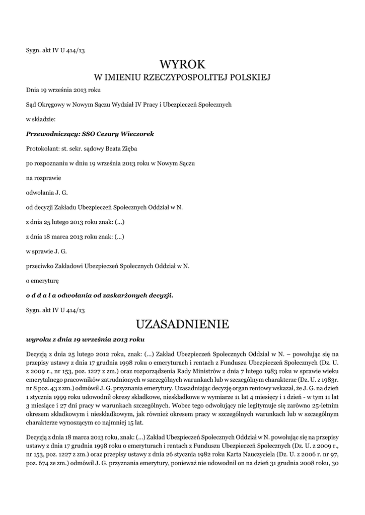 Sygn. akt IV U 414/13 WYROK W IMIENIU RZECZYPOSPOLITEJ POLSKIEJ Dnia 19 września 2013 roku Sąd Okręgowy w Nowym Sączu Wydział IV Pracy i Ubezpieczeń Społecznych w składzie: Przewodniczący: SSO Cezary Wieczorek Protokolant: st. sekr. sądowy Beata Zięba po rozpoznaniu w dniu 19 września 2013 roku w Nowym Sączu na rozprawie odwołania J. G. od decyzji Zakładu Ubezpieczeń Społecznych Oddział w N. z dnia 25 lutego 2013 roku znak: (...) z dnia 18 marca 2013 roku znak: (...) w sprawie J. G. przeciwko Zakładowi Ubezpieczeń Społecznych Oddział w N. o emeryturę o d d a l a odwołania od zaskarżonych decyzji. Sygn. akt IV U 414/13 UZASADNIENIE wyroku z dnia 19 września 2013 roku Decyzją z dnia 25 lutego 2012 roku, znak: (...) Zakład Ubezpieczeń Społecznych Oddział w N. – powołując się na przepisy ustawy z dnia 17 grudnia 1998 roku o emeryturach i rentach z Funduszu Ubezpieczeń Społecznych (Dz. U. z 2009 r., nr 153, poz. 1227 z zm.) oraz rozporządzenia Rady Ministrów z dnia 7 lutego 1983 roku w sprawie wieku emerytalnego pracowników zatrudnionych w szczególnych warunkach lub w szczególnym charakterze (Dz. U. z 1983r. nr 8 poz. 43 z zm.) odmówił J. G. przyznania emerytury. Uzasadniając decyzję organ rentowy wskazał, że J. G. na dzień 1 stycznia 1999 roku udowodnił okresy składkowe, nieskładkowe w wymiarze 11 lat 4 miesięcy i 1 dzień - w tym 11 lat 3 miesiące i 27 dni pracy w warunkach szczególnych. Wobec tego odwołujący nie legitymuje się zarówno 25-letnim okresem składkowym i nieskładkowym, jak również okresem pracy w szczególnych warunkach lub w szczególnym charakterze wynoszącym co najmniej 15 lat. Decyzją z dnia 18 marca 2013 roku, znak: (...) Zakład Ubezpieczeń Społecznych Oddział w N. powołując się na przepisy ustawy z dnia 17 grudnia 1998 roku o emeryturach i rentach z Funduszu Ubezpieczeń Społecznych (Dz. U. z 2009 r., nr 153, poz. 1227 z zm.) oraz przepisy ustawy z dnia 26 stycznia 1982 roku Karta Nauczyciela (Dz. U. z 2006 r. nr 97, poz. 674 ze zm.) odmówił J. G. przyznania emerytury, ponieważ nie udowodnił on na dzień 31 grudnia 2008 roku, 30 letniego okresu składkowego i nieskładkowego, tylko 21 lat 4 miesiące i 8 dni. Nadto ZUS dodał, iż nie przyjęto okresów służby wojskowej w charakterze żołnierza zawodowego od 25 września 1969 roku do 12 maja 1987 roku ponieważ z tego tytułu odwołujący posiada ustalone prawo do emerytury wojskowej. Od powyższych decyzji odwołał się J. G. zarzucając decyzji z dnia 25 lutego 2013 roku to, że ZUS nie uwzględnił całego okresu pracy nauczycielskiej od 1 września 1987 roku do 31 stycznia 2013 roku. Natomiast w okresie od 25 września 1969 roku do 12 maja 1987 roku pełnił służbę wojskową. ZUS bezpodstawnie ustalił, że w warunkach szczególnych pracował tylko 11 lat. Natomiast decyzji z dnia 18 marca 2013 roku zarzucił to, że jako nauczyciel pracował 25 lat i 5 miesięcy, a nie jak ustalił organ rentowy 21 lat, 4 miesiące. W odpowiedzi na odwołanie organ rentowy powołując na argumentację zawartą w zaskarżonych decyzjach wniósł o oddalenie odwołania. Sąd ustalił następujący się stan faktyczny: J. G. ur. (...) w okresie od 25 września 1969 roku do 12 maja 1987 roku odbywał służbę wojskową w charakterze żołnierza zawodowego i z tego tytułu ma przyznaną emeryturę wojskową. Następnie odwołujący w okresie od 1 września 1987 roku do 31 stycznia 2013 roku był zatrudniony w Zespole Szkół (...) w N. na stanowisku nauczyciela. dowód: świadectwo pracy k. 9 akt ZUS, decyzja o ustaleniu emerytury wojskowej k. 37-39 akt ZUS Powyższy stan faktyczny Sąd ustalił na podstawie dokumentacji zgromadzonej w sprawie, której wiarygodności i mocy dowodowej żadna ze stron nie kwestionowała w toku postępowania. Sąd zważył, co następuje: Odwołania J. G. nie zasługują na uwzględnienie. Przedmiotem niniejszego postępowania było ustalenie czy odwołujący się spełnia przesłanki do przyznania emerytury. W związku z tym, że J. G. nie osiągnął powszechnego wieku emerytalnego (tj. 65 lat), jest osobą urodzoną po 31 grudnia 1948 roku i w dacie wydania zaskarżonej decyzji miał ukończone 62 lat - należało rozważyć czy spełnia przesłanki do przyznania wcześniejszej emerytury na podstawie art. 184 ustawy z dnia 17 grudnia 1998 roku o emeryturach i rentach z Funduszu Ubezpieczeń Społecznych (Dz. U. z 2009 roku, Nr 153 poz. 1227 z zm.). Stosownie do tego przepisu ubezpieczonym urodzonym po dniu 31 grudnia 1948 roku przysługuje emerytura po osiągnięciu wieku przewidzianego w art. 32, 33, 39 i 40 ustawy z dnia 17 grudnia 1998 roku o emeryturach i rentach z Funduszu Ubezpieczeń Społecznych, jeżeli w dniu wejścia w życie ustawy (tj. 1 stycznia 1999 roku) osiągnęli: 1. okres zatrudnienia w szczególnych warunkach lub w szczególnym charakterze wymaganym w przepisach dotychczasowych do nabycia prawa do emerytury w wieku niższym niż 60 lat - dla kobiet i 65 lat - dla mężczyzn oraz 2. okres składkowy i nieskładkowy, o którym mowa w art. 27, tj. 20 lat w przypadku kobiet i 25 lat w przypadku mężczyzn. Stosownie do ust. 2 cytowanego przepisu emerytura, o której mowa w ust. 1, przysługuje pod warunkiem nieprzystąpienia do otwartego funduszu emerytalnego albo złożenia wniosku o przekazanie środków zgromadzonych na rachunku w otwartym funduszu emerytalnym, za pośrednictwem Zakładu, na dochody budżetu państwa, jak również rozwiązania stosunku pracy - w przypadku ubezpieczonego będącego pracownikiem. Zgodnie z ust. 2 art. 32 cyt. ustawy dla celów ustalenia uprawnień, o których mowa w ust. 1, za pracowników zatrudnionych w szczególnych warunkach uważa się pracowników zatrudnionych przy pracach o znacznej szkodliwości dla zdrowia oraz o znacznym stopniu uciążliwości lub wymagających wysokiej sprawności psychofizycznej ze względu na bezpieczeństwo własne lub otoczenia w podmio