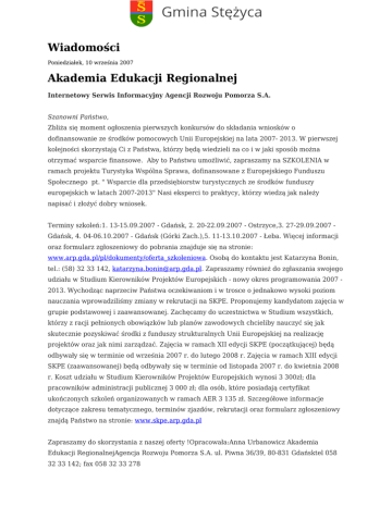 Wiadomości Poniedziałek, 10 września 2007 Akademia Edukacji Regionalnej Internetowy Serwis Informacyjny Agencji Rozwoju Pomorza S.A. Szanowni Państwo, Zbliża się moment ogłoszenia pierwszych konkursów do składania wniosków o dofinansowanie ze środków pomocowych Unii Europejskiej na lata 2007- 2013. W pierwszej kolejności skorzystają Ci z Państwa, którzy będą wiedzieli na co i w jaki sposób można otrzymać wsparcie finansowe. Aby to Państwu umożliwić, zapraszamy na SZKOLENIA w ramach projektu Turystyka Wspólna Sprawa, dofinansowane z Europejskiego Funduszu Społecznego pt. " Wsparcie dla przedsiębiorstw turystycznych ze środków funduszy europejskich w latach 2007-2013" Nasi eksperci to praktycy, którzy wiedzą jak należy napisać i złożyć dobry wniosek. Terminy szkoleń:1. 13-15.09.2007 - Gdańsk, 2. 20-22.09.2007 - Ostrzyce,3. 27-29.09.2007 Gdańsk, 4. 04-06.10.2007 - Gdańsk (Górki Zach.),5. 11-13.10.2007 - Łeba. Więcej informacji oraz formularz zgłoszeniowy do pobrania znajduje się na stronie: www.arp.gda.pl/pl/dokumenty/oferta_szkoleniowa. Osobą do kontaktu jest Katarzyna Bonin, tel.: (58) 32 33 142, [email protected]. Zapraszamy również do zgłaszania swojego udziału w Studium Kierowników Projektów Europejskich - nowy okres programowania 2007 2013. Wychodząc naprzeciw Państwa oczekiwaniom i w trosce o jednakowo wysoki poziom nauczania wprowadziliśmy zmiany w rekrutacji na SKPE. Proponujemy kandydatom zajęcia w grupie podstawowej i zaawansowanej. Zachęcamy do uczestnictwa w Studium wszystkich, którzy z racji pełnionych obowiązków lub planów zawodowych chcieliby nauczyć się jak skutecznie pozyskiwać środki z funduszy strukturalnych Unii Europejskiej na realizację projektów oraz jak nimi zarządzać. Zajęcia w ramach XII edycji SKPE (początkującej) będą odbywały się w terminie od września 2007 r. do lutego 2008 r. Zajęcia w ramach XIII edycji SKPE (zaawansowanej) będą odbywały się w terminie od listopada 2007 r. do kwietnia 2008 r. Koszt udziału w Studium Kierowników Projektów Europejskich wynosi 3 300zł; dla pracowników administracji publicznej 3 000 zł; dla osób, które posiadają certyfikat ukończonych szkoleń organizowanych w ramach AER 3 135 zł. Szczegółowe informacje dotyczące zakresu tematycznego, terminów zjazdów, rekrutacji oraz formularz zgłoszeniowy znajdą Państwo na stronie: www.skpe.arp.gda.pl Zapraszamy do skorzystania z naszej oferty !Opracowała:Anna Urbanowicz Akademia Edukacji RegionalnejAgencja Rozwoju Pomorza S.A. ul. Piwna 36/39, 80-831 Gdańsktel 058 32 33 142; fax 058 32 33 278