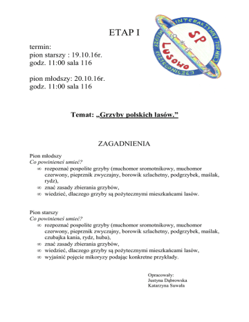 ETAP I termin: pion starszy : 19.10.16r. godz. 11:00 sala 116 pion młodszy: 20.10.16r. godz. 11:00 sala 116 Temat: „Grzyby polskich lasów.” ZAGADNIENIA Pion młodszy Co powinieneś umieć? • rozpoznać pospolite grzyby (muchomor sromotnikowy, muchomor czerwony, pieprznik zwyczajny, borowik szlachetny, podgrzybek, maślak, rydz), • znać zasady zbierania grzybów, • wiedzieć, dlaczego grzyby są pożytecznymi mieszkańcami lasów. Pion starszy Co powinieneś umieć? • rozpoznać pospolite grzyby (muchomor sromotnikowy, muchomor czerwony, pieprznik zwyczajny, borowik szlachetny, podgrzybek, maślak, czubajka kania, rydz, huba), • znać zasady zbierania grzybów, • wiedzieć, dlaczego grzyby są pożytecznymi mieszkańcami lasów, • wyjaśnić pojęcie mikoryzy podając konkretne przykłady. Opracowały: Justyna Dąbrowska Katarzyna Suwała