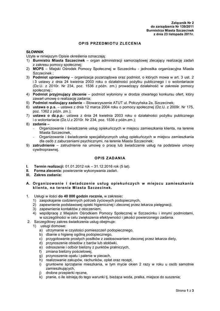 Załącznik Nr 2 do zarządzenia Nr 139/2011 Burmistrza Miasta Szczecinek z dnia 23 listopada 2011r. O P IS PR Z EDM IO T U Z L E C EN I A SŁOWNIK UŜyte w niniejszym Opisie określenia oznaczają: 1) Burmistrz Miasta Szczecinek – organ administracji samorządowej zlecający realizację zadań z zakresu pomocy społecznej; 2) MOPS – Miejski Ośrodek Pomocy Społecznej w Szczecinku - jednostka organizacyjna Miasta Szczecinek ; 3) Podmiot uprawniony – organizacja pozarządowa oraz podmiot, o których mowa w art. 3 ust. 2 i 3 ustawy z dnia 24 kwietnia 2003 roku o działalności poŜytku publicznego i o wolontariacie (Dz.U. z 2010r. Nr 234, poz. 1536 z późn. zm.) prowadzący działalność w zakresie pomocy społecznej ; 4) Podmiot przyjmujący zlecenie – podmiot wyłoniony w drodze otwartego konkursu ofert, który zawarł umowę o realizację zadania; 5) Podmiot realizujący zadanie – Stowarzyszenie ATUT ul. Połczyńska 2a, Szczecinek; 6) ustawa o p.s. – ustawa z dnia 12 marca 2004 roku o pomocy społecznej (Dz.U. z 2009r. Nr 175, poz. 1362 z późn. zm.); 7) ustawa o dz.p.p.- ustawa z dnia 24 kwietnia 2003 roku o działalności poŜytku publicznego i o wolontariacie (Dz.U.z 2010r. Nr 234, poz. 1536 z późn.zm.); 8) zadanie – − Organizowanie i świadczenie usług opiekuńczych w miejscu zamieszkania klienta, na terenie Miasta Szczecinek, − Organizowanie i świadczenie specjalistycznych usług opiekuńczych w miejscu zamieszkania dla osób z zaburzeniami psychicznymi, na terenie Miasta Szczecinek; 9) zatrudnienie – zatrudnienie na umowę o pracę lub świadczenie usług na podstawie umowy cywilnoprawnej. O P IS Z AD AN I A I. II. III. Termin realizacji: 01.01.2012 rok – 31.12.2016 rok (5 lat). Forma zlecenia: powierzenie wykonywania zadań. Zakres zadania: A. O rg an iz o w an i e i św i ad cz e n i e u słu g o p ie ku ń cz ych w m ie js cu z am ie sz ka n i a kl ie n t a , n a t er en ie M iast a Sz cz e cin e k. 1. Usługi w ilości do 40 000 godzin rocznie, w zakresie: 1) zaspokajanie codziennych potrzeb Ŝyciowych podopiecznych, 2) zapewnienie podstawowej opieki higienicznej i zleconej przez lekarza pielęgnacji, 3) zapewnienie kontaktów z otoczeniem, 4) współpracę z Miejskim Ośrodkiem Pomocy Społecznej w Szczecinku i innymi podmiotami, w szczególności w celu zwiększenia efektywności i jakości powierzonego zadania. 2. Szczegółowy zakres świadczenia usług obejmuje: 1) usługi domowe: a) utrzymanie w czystości pomieszczeń podopiecznego, b) dbanie o higienę ogólną podopiecznego, c) przygotowanie prostych posiłków z zastosowaniem zleconej przez lekarza diety, d) przynoszenie obiadów z barów lub stołówki, e) odnoszenie i odbiór bielizny z punktów pralniczych, f) zmiana bielizny pościelowej, g) przynoszenie opału i palenie w piecach, h) realizowanie zakupów, rachunków, opłat oraz recept, i) gruntowne sprzątanie mieszkania, w tym mycie okien 2 razy w roku u osób samotnie zamieszkujących, j) drobne przepierki ręczne, k) pranie, o ile istnieją do tego warunki tj. bieŜąca woda, pralka, miejsce do suszenia; Strona 1 z 3 2) usługi pielęgnacyjne: a) toaleta ogólna, b) toaleta p/odleŜynowa, c) zmiana podkładów i pieluchomajtek, d) mycie głowy w łóŜku, e) iniekcja z insuliny, f) zmiana pozycji ciała, masaŜ podstawowy, g) mierzenie temperatury, tętna, ciśnienia, h) podawanie leków, zgodnie z zaleceniem lekarskim i) zakładanie kompresów i okładów, j) zakładanie opatrunków, k) karmienie chorego, l) karmienie pozajelitowe chorego, m) gimnastyka oddechowa i uruchamianie chorego, n) lewatywy przeczyszczające i lecznicze, o) stawianie baniek suchych; 3) usprawnienie do funkcjonowania w społeczeństwie: a) informowanie właściwych instytucji o zagroŜeniach zdrowia i Ŝycia klienta z powodów ekonomicznych, zdrowotnych, rodzinnych i społecznych, b) załatwianie spraw urzędowych, pisanie listów na Ŝyczenie podopiecznego, c) spacer z podopiecznym, d) czytanie prasy, ksiąŜek, e) wzywanie i zamawianie wizyty lekarskiej, f) pomoc w kontaktach z instytucjami uŜyteczności publicznej; 4) usługi dla rodzin dziećmi przeŜywających trudności w wypełnianiu funkcji opiekuńczowychowawczych (art. 10 ust. 3 pkt 3 ustawy z dnia 9 czerwca 2011 r. o wspieraniu rodziny i pieczy zastępczej (Dz. U. Nr 149, poz. 887); 5) podejmowanie interwencji w ramach elektronicznego systemu opieki (usługa obejmuje pełnienie dyŜuru monitorującego, który zawiera monitoring opiekuńczy kilku osób w ramach elektronicznego systemu opieki i podejmowanie interwencji w razie potrzeby); 6) inne, zawarte w ofercie Podmiotu, zgodnie z opisem. B. O rg an iz o w an i e i ś w iad cz en ie sp ec j ali st ycz n yc h u słu g o p ie ku ń cz yc h w mie js cu z am i esz k a n ia d l a o só b z z ab u r z en i a mi p s yc h i cz n ym i, n a t er en i e M iast a Sz cz e ci n e k. 1. Zakres zadania obejmuje zaspokajanie codziennych potrzeb Ŝyciowych, zapewnienie podstawowej opieki higienicznej i zleconej przez lekarza pielęgnacji oraz zapewnienie kontaktów z otoczeniem, w ilości wynikającej z decyzji Burmistrza Miasta Szczecinek lub osoby przez niego upowaŜnionej do 6 000 godzin usług rocznie. 2. Szczegółowy zakres usług określają właściwe przepisy prawa zgodnie, z którym usługi obejmują m.in.: 1) uczenie i rozwijanie umiejętności niezbędnych do samodzielnego Ŝycia, w tym zwłaszcza: a) kształtowanie umiejętności zaspokajania podstawowych potrzeb Ŝyciowych i umiejętności społecznego funkcjonowania, motywowanie do aktywności, leczenia i rehabilitacji, prowadzenie treningów umiejętności samoobsługi i umiejętności społecznych oraz wspieranie, takŜe w formie asystowania w codziennych czynnościach Ŝyciowych, b) interwencje i pomoc w Ŝyciu w rodzinie, c) pomoc w załatwianiu spraw urzędowych, d) wspieranie i pomoc w uzyskaniu zatrudnienia, e) pomoc w gospodarowaniu pieniędzmi, 2) pielęgnacja - jako wspieranie proce