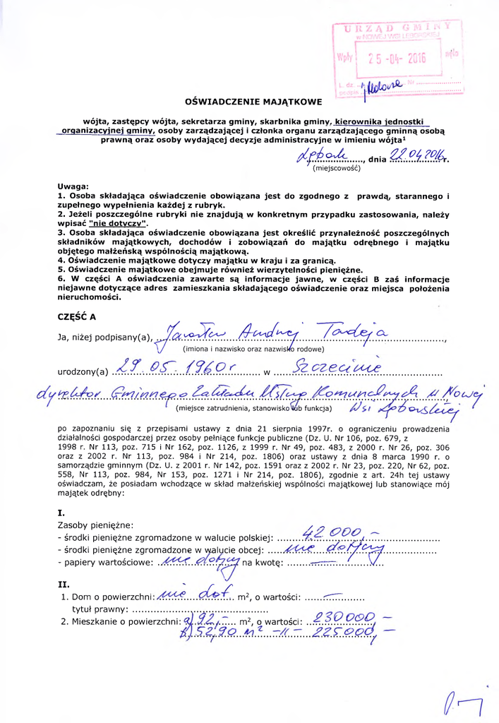 OŚWIADCZENIE MAJĄTKOWE wójta, zastępcy wójta, sekretarza gminy, skarbnika gminy, kierownika jednostki organizacyjnej gminy, osoby zarządzającej i członka organu zarządzającego gminną osobą prawną oraz osoby wydającej decyzje administracyjne w imieniu wójta1 Ą A sA ...... dn i, USLm,. (miejscowość) Uwaga: 1. Osoba składająca oświadczenie obowiązana jest do zgodnego z prawdą, starannego i zupełnego wypełnienia każdej z rubryk. 2. Jeżeli poszczególne rubryki nie znajdują w konkretnym przypadku zastosowania, należy wpisać "nie dotyczy". 3. Osoba składająca oświadczenie obowiązana jest określić przynależność poszczególnych składników majątkowych, dochodów i zobowiązań do majątku odrębnego i majątku objętego małżeńską wspólnością majątkową. 4. Oświadczenie majątkowe dotyczy majątku w kraju i za granicą. 5. Oświadczenie majątkowe obejmuje również wierzytelności pieniężne. 6. W części A oświadczenia zawarte są informacje jawne, w części B zaś informacje niejawne dotyczące adres zamieszkania składającego oświadczenie oraz miejsca położenia nieruchomości. CZĘŚĆ A Ja, niżej podpisany(a), w ..... urodzony(a) (miejsce zatrudnienia, stanowiskoUub funkcja) po zapoznaniu się z przepisami ustawy z dnia 21 sierpnia 1997r. o ograniczeniu prowadzenia działalności gospodarczej przez osoby pełniące funkcje publiczne (Dz. U. Nr 106, poz. 679, z 1998 r. Nr 113, poz. 715 i Nr 162, poz. 1126, z 1999 r. Nr 49, poz. 483, z 2000 r. Nr 26, poz. 306 oraz z 2002 r. Nr 113, poz. 984 i Nr 214, poz. 1806) oraz ustawy z dnia 8 marca 1990 r. o samorządzie gminnym (Dz. U. z 2001 r. Nr 142, poz. 1591 oraz z 2002 r. Nr 23, poz. 220, Nr 62, poz. 558, Nr 113, poz. 984, Nr 153, poz. 1271 i Nr 214, poz. 1806), zgodnie z art. 24h tej ustawy oświadczam, że posiadam wchodzące w skład małżeńskiej wspólności majątkowej lub stanowiące mój majątek odrębny: I. Zasoby pieniężne: / - środki pieniężne zgromadzone w walucie polskiej: ....... r.. - środki pieniężne zgromadzone w walucie obcej: .... - papiery wartościowe: ~ na kwotę: ....... -rrr.:.~ ... “ ■ . ' r s 1. Dom o p o w i e r z c h n i m 2, o wartości: .....rrTTTT........ tytuł prawny: .................. .......................... 2. Mieszkanie o powierzchni: m2, o wartości: ..99. .fbi.. 777....22.7^27.4.Ć7?. 9 7 7 . P Gospodarstwo rolne: , . rodzaj gospodarstwa: <2ftf..P2ćtl powierzchnia: .... 7!77...... tytuł prawny: 3. . . c św o wartości: ...... .77......'............................... rodzaj zabudowy: tytuł prawny: ..... Z tego tytułu osiągnąłem(ęłam) w roku ubiegłym przychód dochód w wysokości: 4. Inne nieruchomości: __ , ? powierzchnia:(ĄjJi/p 7 i222.Ćłi .7. f22.K29P.C ..$2.222.22.j...................... ^ o wartości: p f i y t j i z . . S f O t U P O G .i .r.... ^. . # ~ A uffiyfuiulg (/&!?&..7.f X . . ćJWZ.J.Ż cl/ yydzf2?.. fW/ipoo. z ..£?$,^ r ~ .<?4;.f f ?.tv2 . 7 . . 2 , S 2 & ę > . f - tytuł prawny: .ęZ^.ł&PfP’..P iffi*,.2 2 p c/ ^ fi.-2l.2pp..7.AP.9-.2.ęi\9#MĆ&.ft.CiCCtn&cbJfcći fi/ę2./fi.9Pfippfe.2e%<z. < t22./tfffi.ą/k: \.v.fi.2.2p:( /w a / .*/<: fi<?2JTg fi). - 7? 6 Oo, - 9.99P...«?.fiPPZffi.Pl.ę^.Pk1 ...fiPfS.Z.^r^..7 III. Posiadam udział^ w spółkaćhfhan'dlt>wych - należy podać nczoę udziały te stanowią pakiet większy niż 10% udziałów w spółce: Z tego tytułu osiągnąłem(ęłam) w roku ubiegłym dochód w wysokości: IV. Posiadam akcje w spółkach handlowych - należy podać liczbę i emitenta akcji: akcje te stanowią pakiet większy niż 10% akcji w spółce: Z tego tytułu osiągnąłem(ęłam) w roku ubiegłym dochód w wysokości: Nabyłem(am) (nabył mój małżonek, z wyłączeniem mienia przynależnego do jego majątku odrębnego) od Skarbu Państwa, innej państwowej osoby prawnej, jednostek samorządu terytorialnego, ich związków lub od komunalnej osoby prawnej następujące mienie, które podlegało zbyciu w drodze przetargu - należy podać opis mienia i datę nabycia, od kogo: VI. 1. Prowadzę działalność gospodarczą2 (należy podać formę prawną i przedmiot działalności): .............................. - osobiście........................... ... * - wspólnie z innymi osobami ..2222..... Z tego tytułu osiągnąłem(ęłam) w roku ubiegłym przychód i dochód w wysokości: ./C6< 〠. j 2. Zarządzam działalnością gospodarczą lub jestem przedstawicielem pełnomocnikiem takiej działalności (należy podać formę prawną i przedmiot działalności): - osobiście....................................7 ... - wspólnie z innymi osobami ....jLfififii... Z tego tytułu osiągnąłem(ęłam) w roku ubiegłym dochód w wysokości: .jL *44?.... VII. 1. W spółkach handlowych (nazwa, siedziba spółki * J - jestem członkiem zarządu (od kiedy): ............................ - jestem członkiem rady nadzorczej (od kiedy): ............... -jestem członkiem komisji rewizyjnej (od kiedy): ....A /fZ . Z tego tytułu osiągnąłem(ęłam) w roku ubiegłym dochód w wysokości: 2. W spółdzielniach:........ A fU f. - jestem członkiem zarządu (od kiedy): - jestem członkiem rady nadzorczej3 (od kiedy): ........... .p.. -jestem członkiem komisji rewizyjnej (od kiedy): ....M<U.... Z tego tytułu osiągnąłem(ęłam) w roku ubiegłym dochód w wysokości\..LiAAf. 3. W fundacjach prowadzących działalność gospodarczą:. - jestem członkiem zarządu (od kiedy): - jestem członkiem rady nadzorczej (od kiedy): - jestem członkiem komisji rewizyjnej (od kiedy): Z tego tytułu osiągnąłem(ęłam) w roku ubiegłym dochód w wysokośći: VIII. Inne dochody osiągane z tytułu zatrudnienia lub innej działalności zarobkowej lub zajęć, z Składniki mienia ruchomego o wartości powyżej 10.000 złotych (w przypadku pojazdów mechanicznych należy podać markę, model i rok produkcji): f . . £ g .w .?.cAJ>.*?..... W & .lU fryi.. ..U if.k ja .ę A ę ttJ .Q .c ??......... ..... 