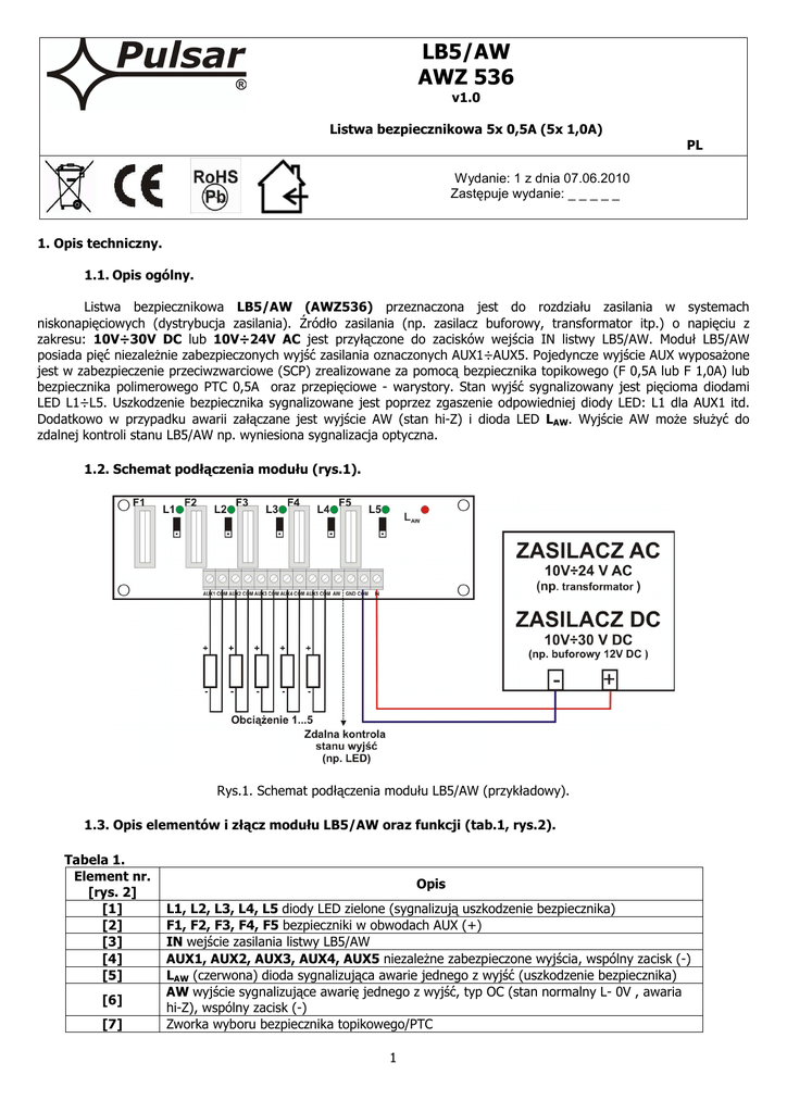LB5/AW AWZ 536 v1.0 Listwa bezpiecznikowa 5x 0,5A (5x 1,0A) PL Wydanie: 1 z dnia 07.06.2010 Zastępuje wydanie: _ _ _ _ _ 1. Opis techniczny. 1.1. Opis ogólny. Listwa bezpiecznikowa LB5/AW (AWZ536) przeznaczona jest do rozdziału zasilania w systemach niskonapięciowych (dystrybucja zasilania). Źródło zasilania (np. zasilacz buforowy, transformator itp.) o napięciu z zakresu: 10V÷30V DC lub 10V÷24V AC jest przyłączone do zacisków wejścia IN listwy LB5/AW. Moduł LB5/AW posiada pięć niezależnie zabezpieczonych wyjść zasilania oznaczonych AUX1÷AUX5. Pojedyncze wyjście AUX wyposażone jest w zabezpieczenie przeciwzwarciowe (SCP) zrealizowane za pomocą bezpiecznika topikowego (F 0,5A lub F 1,0A) lub bezpiecznika polimerowego PTC 0,5A oraz przepięciowe - warystory. Stan wyjść sygnalizowany jest pięcioma diodami LED L1÷L5. Uszkodzenie bezpiecznika sygnalizowane jest poprzez zgaszenie odpowiedniej diody LED: L1 dla AUX1 itd. Dodatkowo w przypadku awarii załączane jest wyjście AW (stan hi-Z) i dioda LED LAW. Wyjście AW może służyć do zdalnej kontroli stanu LB5/AW np. wyniesiona sygnalizacja optyczna. 1.2. Schemat podłączenia modułu (rys.1). Rys.1. Schemat podłączenia modułu LB5/AW (przykładowy). 1.3. Opis elementów i złącz modułu LB5/AW oraz funkcji (tab.1, rys.2). Tabela 1. Element nr. [rys. 2] [1] [2] [3] [4] [5] [6] [7] Opis L1, L2, L3, L4, L5 diody LED zielone (sygnalizują uszkodzenie bezpiecznika) F1, F2, F3, F4, F5 bezpieczniki w obwodach AUX (+) IN wejście zasilania listwy LB5/AW AUX1, AUX2, AUX3, AUX4, AUX5 niezależne zabezpieczone wyjścia, wspólny zacisk (-) LAW (czerwona) dioda sygnalizująca awarie jednego z wyjść (uszkodzenie bezpiecznika) AW wyjście sygnalizujące awarię jednego z wyjść, typ OC (stan normalny L- 0V , awaria hi-Z), wspólny zacisk (-) Zworka wyboru bezpiecznika topikowego/PTC 1 Rys.2. Widok modułu LB5/AW. 1.4. Parametry techniczne: - parametry elektryczne (tab.2) - parametry mechaniczne (tab.3) Tabela 2. Napięcie zasilania Napięcie wyjściowe Pobór prądu Ilość wejść zasilania Ilość wyjść zasilania Zabezpieczenia: - przeciwzwarciowe SCP - przeciążeniowe OLP - przepięciowe Wyjście techniczne: AW Sygnalizacja optyczna Bezpieczniki F1, F2, F3, F4, F5 Warunki pracy Tabela 3. Wymiary Mocowanie Złącza Waga netto/brutto 10V÷30V DC (-2%/+2%) 10V÷24V AC (-2%/+2%) UAUX=UIN zgodne z napięciem zasilania 6mA÷ 41mA @ Uin=10 ÷ 30 V DC 10mA÷ 32 mA @ Uin=10÷ 24 V AC 1 (zaciski IN) 5 (zaciski AUX) - 5 x F 0,5A lub 5x F 1,0A bezpiecznik topikowy (wymiana ręczna bezpiecznika z zestawu), lub PTC 0,5A. - 5 x warystor Typ OC 50mA max. • stan normalny (brak awarii L (0V, GND), • stan aktywny (awaria): hi-Z (wysoka impedancja) Diody LED zielone • L1, L2, L3, L4, L5stan wyjść AUX1÷AUX5 (stan normalny = świeci) Dioda LED czerwona • LAWsygnalizacja awarii min. jednego wyjścia (stan normalny = nie świeci) F 0,5A lub F 1,0A (na wyposażeniu) lub PTC 0,5A II klasa środowiskowa, -10°C ÷50°C 140 x 40 x 29 (WxHxD) Kołki montażowe x 4 (PCB fi=4,2 mm) 132x33mm, taśma montażowa lub wkręty do blachy Ф0,41÷1,63 (AWG 26-14) 0,08/0,1 kg 2 2. Instalacja. 2.1 Wymagania. Listwa LB5/AW przeznaczona jest do montażu przez wykwalifikowanego instalatora, posiadającego odpowiednie (wymagane i konieczne dla danego kraju) zezwolenia i uprawnienia do przyłączania (ingerencji) w instalacje niskonapięciowe. Urządzenie powinno być zamontowane w pomieszczeniach zamkniętych zgodnie z II klasą środowiskową, o normalnej wilgotności powietrza (RH=90% maks. bez kondensacji) i temperaturze z zakresu -10°C do +50°C. Moduł należy podłączać tylko do źródeł zasilania posiadających galwaniczną separację od zasilania sieciowego (transformatorową). Urządzenie należy montować w metalowej obudowie (szafie, urządzeniu końcowym) oraz w celu spełnienia wymagań LVD i EMC należy przestrzegać zasad: zasilania, zabudowy, ekranowania - odpowiednio do zastosowania. Przed przystąpieniem do instalacji, należy sporządzić bilans mocy. W czasie normalnej i awaryjnej eksploatacji suma prądów (moc) pobieranych przez odbiorniki z wyjść AUX nie może przekroczyć wydajności źródła zasilania podłączonego do wejścia IN. 2.2 Procedura instalacji. 1. Zainstalować moduł LB5/AW. 2. Doprowadzić napięcie zasilające do zacisków IN, COM, zachowując polaryzacje przy napięciu DC. 3. Podłączyć odbiorniki do zacisków AUX1÷AUX5, zachowując polaryzacje przy napięciu DC. 4. Podłączyć sygnał awarii, wyjście AW (w zależności od potrzeby aplikacji) do urządzenia sygnalizacyjnego (dioda LED, wejście nadajnika, wejście centrali, sygnalizator itp.). 5. Po wykonaniu testów i kontroli działania zamknąć obudowę, szafę itp. 2.3 Postępowanie w przypadku zwarcia (zadziałanie SCP) wyjścia LB5/AW. Wyjścia zasilacza AUX1÷AUX5 zabezpieczone są przeciwzwarciowo poprzez bezpieczniki topikowe (wkładki). W przypadku uszkodzenia należy wymienić bezpiecznik na odpowiedni ( zgodny z oryginałem lub wynikający z norm i bilansu). Jeśli wybrane zostało zabezpieczenie za pomocą bezpieczników polimerowych PTC, to następuje automatyczne odłączenie napięcia wyjściowego sygnalizowane przez zgaszenie zielonej diody. Należy wówczas odłączyć obciążenie od wyjścia zasilacza na okres ok. 1min. 3. Konserwacja. Wszelkie zabiegi konserwacyjne można wykonywać po odłączeniu zasilacza od sieci elektroenergetycznej. Listwa bezpiecznikowa nie wymaga wykonywania żadnych specjalnych zabiegów konserwacyjnych jednak w przypadku znacznego zapylenia wskazane jest jedynie odkurzenie sprężonym powietrzem. W przypadku wymiany bezpiecznika należy używać zamienników zgodnych z zalecanymi. 3 OZNAKOWANIE WEEE Zużytego sprzętu elektrycznego i elektronicznego nie wolno wyrzucać razem ze zwykłymi domowymi odpadami. Według dyrektywy WEEE obowiązującej w UE dla zużytego sprzętu elektrycznego i elektroni