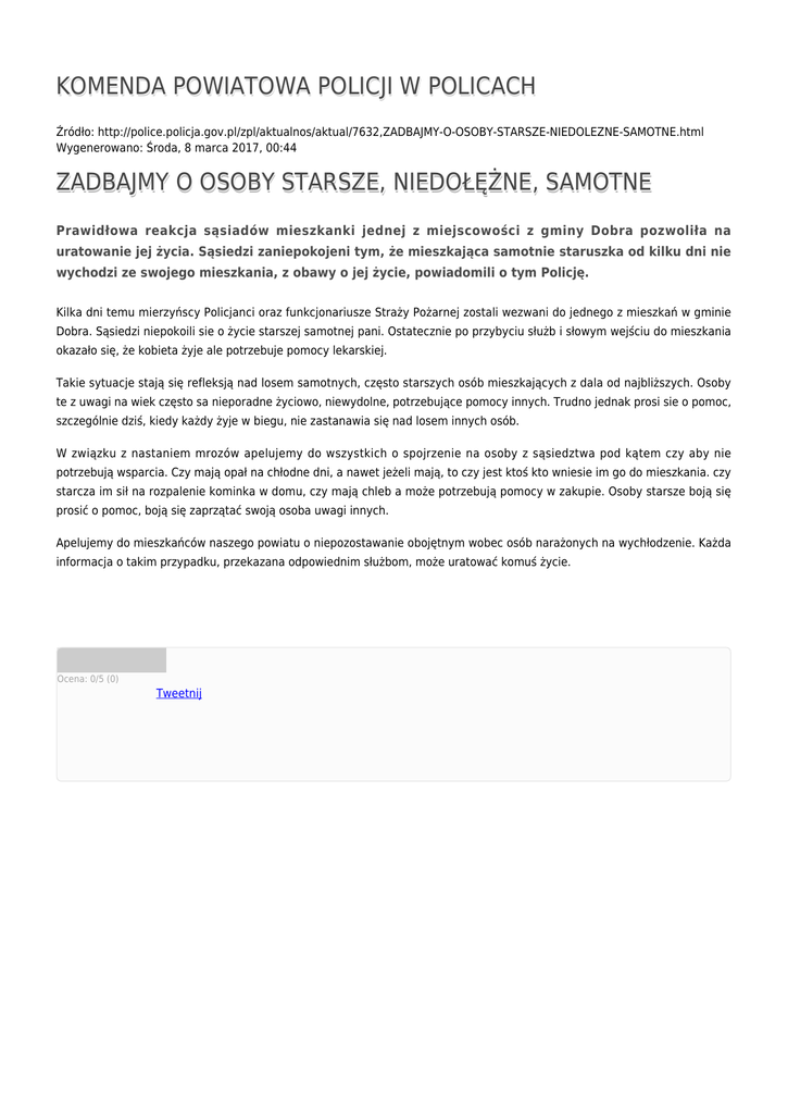 KOMENDA POWIATOWA POLICJI W POLICACH Źródło: http://police.policja.gov.pl/zpl/aktualnos/aktual/7632,ZADBAJMY-O-OSOBY-STARSZE-NIEDOLEZNE-SAMOTNE.html Wygenerowano: Środa, 8 marca 2017, 00:44 ZADBAJMY O OSOBY STARSZE, NIEDOŁĘŻNE, SAMOTNE Prawidłowa reakcja sąsiadów mieszkanki jednej z miejscowości z gminy Dobra pozwoliła na uratowanie jej życia. Sąsiedzi zaniepokojeni tym, że mieszkająca samotnie staruszka od kilku dni nie wychodzi ze swojego mieszkania, z obawy o jej życie, powiadomili o tym Policję. Kilka dni temu mierzyńscy Policjanci oraz funkcjonariusze Straży Pożarnej zostali wezwani do jednego z mieszkań w gminie Dobra. Sąsiedzi niepokoili sie o życie starszej samotnej pani. Ostatecznie po przybyciu służb i słowym wejściu do mieszkania okazało się, że kobieta żyje ale potrzebuje pomocy lekarskiej. Takie sytuacje stają się refleksją nad losem samotnych, często starszych osób mieszkających z dala od najbliższych. Osoby te z uwagi na wiek często sa nieporadne życiowo, niewydolne, potrzebujące pomocy innych. Trudno jednak prosi sie o pomoc, szczególnie dziś, kiedy każdy żyje w biegu, nie zastanawia się nad losem innych osób. W związku z nastaniem mrozów apelujemy do wszystkich o spojrzenie na osoby z sąsiedztwa pod kątem czy aby nie potrzebują wsparcia. Czy mają opał na chłodne dni, a nawet jeżeli mają, to czy jest ktoś kto wniesie im go do mieszkania. czy starcza im sił na rozpalenie kominka w domu, czy mają chleb a może potrzebują pomocy w zakupie. Osoby starsze boją się prosić o pomoc, boją się zaprzątać swoją osoba uwagi innych. Apelujemy do mieszkańców naszego powiatu o niepozostawanie obojętnym wobec osób narażonych na wychłodzenie. Każda informacja o takim przypadku, przekazana odpowiednim służbom, może uratować komuś życie. Ocena: 0/5 (0) Tweetnij
