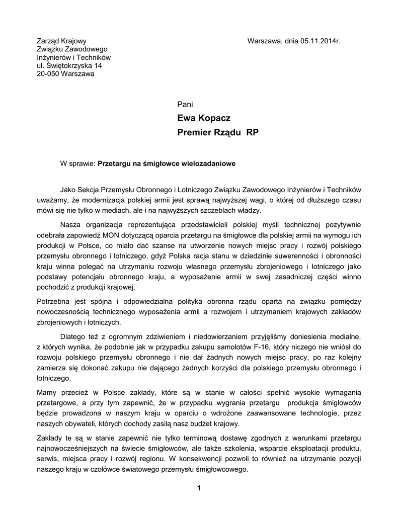Zarząd Krajowy Związku Zawodowego Inżynierów i Techników ul. Świętokrzyska 14 20-050 Warszawa Warszawa, dnia 05.11.2014r. Pani Ewa Kopacz Premier Rządu RP W sprawie: Przetargu na śmigłowce wielozadaniowe Jako Sekcja Przemysłu Obronnego i Lotniczego Związku Zawodowego Inżynierów i Techników uważamy, że modernizacja polskiej armii jest sprawą najwyższej wagi, o której od dłuższego czasu mówi się nie tylko w mediach, ale i na najwyższych szczeblach władzy. Nasza organizacja reprezentująca przedstawicieli polskiej myśli technicznej pozytywnie odebrała zapowiedź MON dotyczącą oparcia przetargu na śmigłowce dla polskiej armii na wymogu ich produkcji w Polsce, co miało dać szanse na utworzenie nowych miejsc pracy i rozwój polskiego przemysłu obronnego i lotniczego, gdyż Polska racja stanu w dziedzinie suwerenności i obronności kraju winna polegać na utrzymaniu rozwoju własnego przemysłu zbrojeniowego i lotniczego jako podstawy potencjału obronnego kraju, a wyposażenie armii w swej zasadniczej części winno pochodzić z produkcji krajowej. Potrzebna jest spójna i odpowiedzialna polityka obronna rządu oparta na związku pomiędzy nowoczesnością technicznego wyposażenia armii a rozwojem i utrzymaniem krajowych zakładów zbrojeniowych i lotniczych. Dlatego też z ogromnym zdziwieniem i niedowierzaniem przyjęliśmy doniesienia medialne, z których wynika, że podobnie jak w przypadku zakupu samolotów F-16, który niczego nie wniósł do rozwoju polskiego przemysłu obronnego i nie dał żadnych nowych miejsc pracy, po raz kolejny zamierza się dokonać zakupu nie dającego żadnych korzyści dla polskiego przemysłu obronnego i lotniczego. Mamy przecież w Polsce zakłady, które są w stanie w całości spełnić wysokie wymagania przetargowe, a przy tym zapewnić, że w przypadku wygrania przetargu produkcja śmigłowców będzie prowadzona w naszym kraju w oparciu o wdrożone zaawansowane technologie, przez naszych obywateli, których dochody zasilą nasz budżet krajowy. Zakłady te są w stanie zapewnić nie tylko terminową dostawę zgodnych z warunkami przetargu najnowocześniejszych na świecie śmigłowców, ale także szkolenia, wsparcie eksploatacji produktu, serwis, miejsca pracy i rozwój regionu. W konsekwencji pozwoli to również na utrzymanie pozycji naszego kraju w czołówce światowego przemysłu śmigłowcowego. 1 W przypadku wyboru śmigłowca zaprojektowanego i wyprodukowanego w naszym kraju to właśnie Polska będzie posiadaczem kodów źródłowych do oprogramowania i integracji systemów śmigłowca w przyszłości oraz własności intelektualnej z nim związanej. Bezpieczeństwo państwa, polska racja stanu w dziedzinie suwerenności i obronności kraju powinna polegać na własnym produkcie. Wybór konstrukcji XXI wieku - najnowocześniejszego śmigłowca zaprojektowanego wg najnowszych technologii dla liczącej się w NATO Polskiej Armii otworzy zapotrzebowanie w innych krajach NATO i nie tylko - na ten produkt, a dochody zasilą nasz budżet krajowy. Dlatego też w imieniu Związku Zawodowego Inżynierów i Techników zwracamy się z apelem, aby dla bezpieczeństwa państwa, wzmocnienia jego suwerenności i niezależności, przy wyborze śmigłowca wielozadaniowego dla polskiej armii decydowała polska racja stanu i interes krajowej gospodarki. Z poważaniem OTRZYMUJĄ: 1 x adresat 1 x Prezydent RP 1 x Marszałek Sejmu 1 x Marszałek Senatu 1 x Senacka Komisja Obrony Narodowej 1 x Sejmowa Komisja Obrony Narodowej 1 x Minister Obrony Narodowej 1 x Podsekretarz Stanu MON ds. Uzbrojenia i Modernizacji 1 x a/a 2