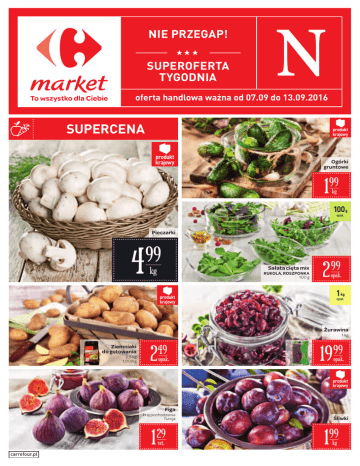 NIE PRZEGAP! SUPEROFERTA TYGODNIA oferta handlowa ważna od 07.09 do 13.09.2016 SUPERCENA produkt krajowy produkt krajowy Ogórki gruntowe 199 kg 100 g opak. Pieczarki 4 99 kg Sałata cięta mix RUKOLA, ROSZPONKA 100 g produkt krajowy 299 opak. 1 kg opak. Żurawina 1 kg Ziemniaki do gotowania 2,5 kg 1,00/kg 249 opak. 19 99 opak. produkt krajowy Figa kraj pochodzenia Turcja 1 29 szt. carrefour.pl Śliwki 199 kg Boczek wieprzowy bez kości Karkówka wieprzowa bez kości 1299 kg Udo, podudzie z kurczaka tacka 599 kg Filety śledziowe à la matias ekstra* 1299 kg Cebularz 125 g, 12,72/kg 159 szt. 1299 kg Mięso mielone drobiowe MORLINY 500 g 11,98/kg 599 opak. Morszczuk* filet mrożony glazura 25% 1199 kg Chleb żytni 500 g 4,58/kg 229 szt. Oferta ważna do wyczerpania zapasów. Ceny towarów podane są w PLN. *Oferta dotyczy sklepów z działem wędlin, serów i ryb w sprzedaży tradycyjnej. Zdjęcia towarów mogą odbiegać od rzeczywistości. Nie prowadzimy sprzedaży hurtowej. Za ewentualne błędy w druku przepraszamy. carrefour.pl Znajdź swój sklep z aktualną ofertą gazetki.1S36Bv1