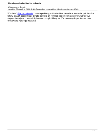 Mszalik polsko-łaciński do pobrania Wpisany przez Tomek niedziela, 20 września 2009 12:44 - Poprawiony poniedziałek, 05 października 2009 18:03 W dziale " Pliki do pobrania " udostępniliśmy polsko-łaciński mszalik w formacie .pdf. Oprócz tekstu stałych części Mszy świętej zawiera on również zapis neumatyczny (kwadratowy) najpopularniejszych melodii śpiewanych części Mszy św. Zapraszamy do pobierania oraz drukowania naszego mszalika. 1/1